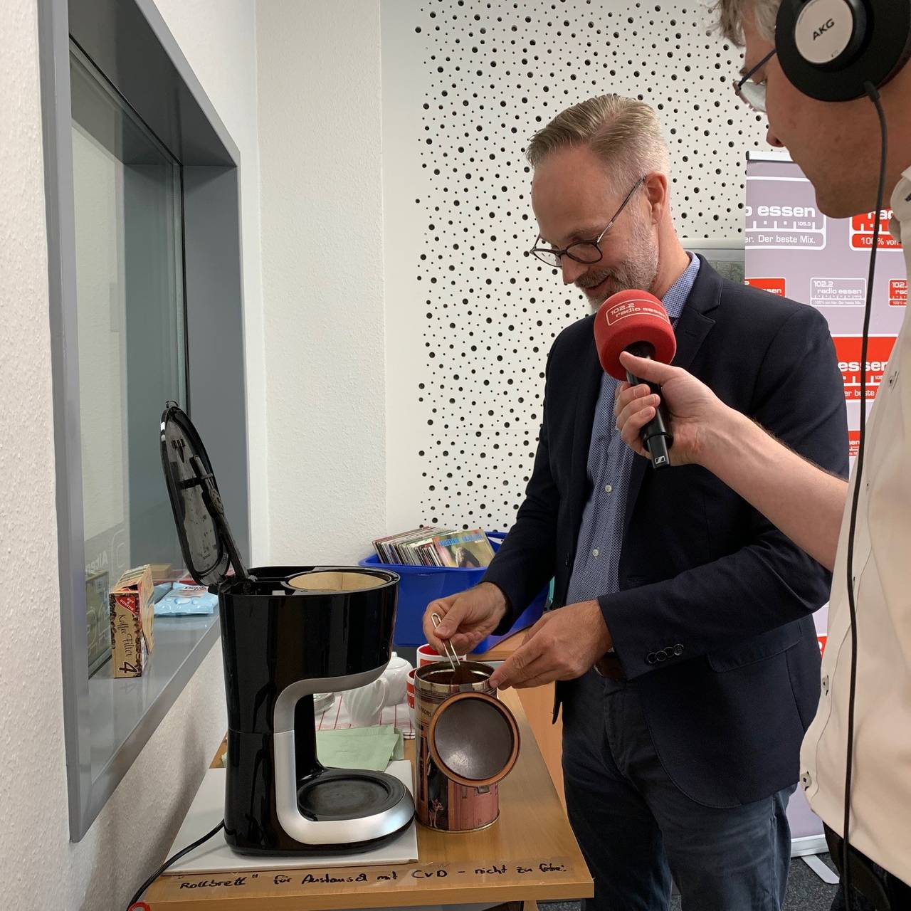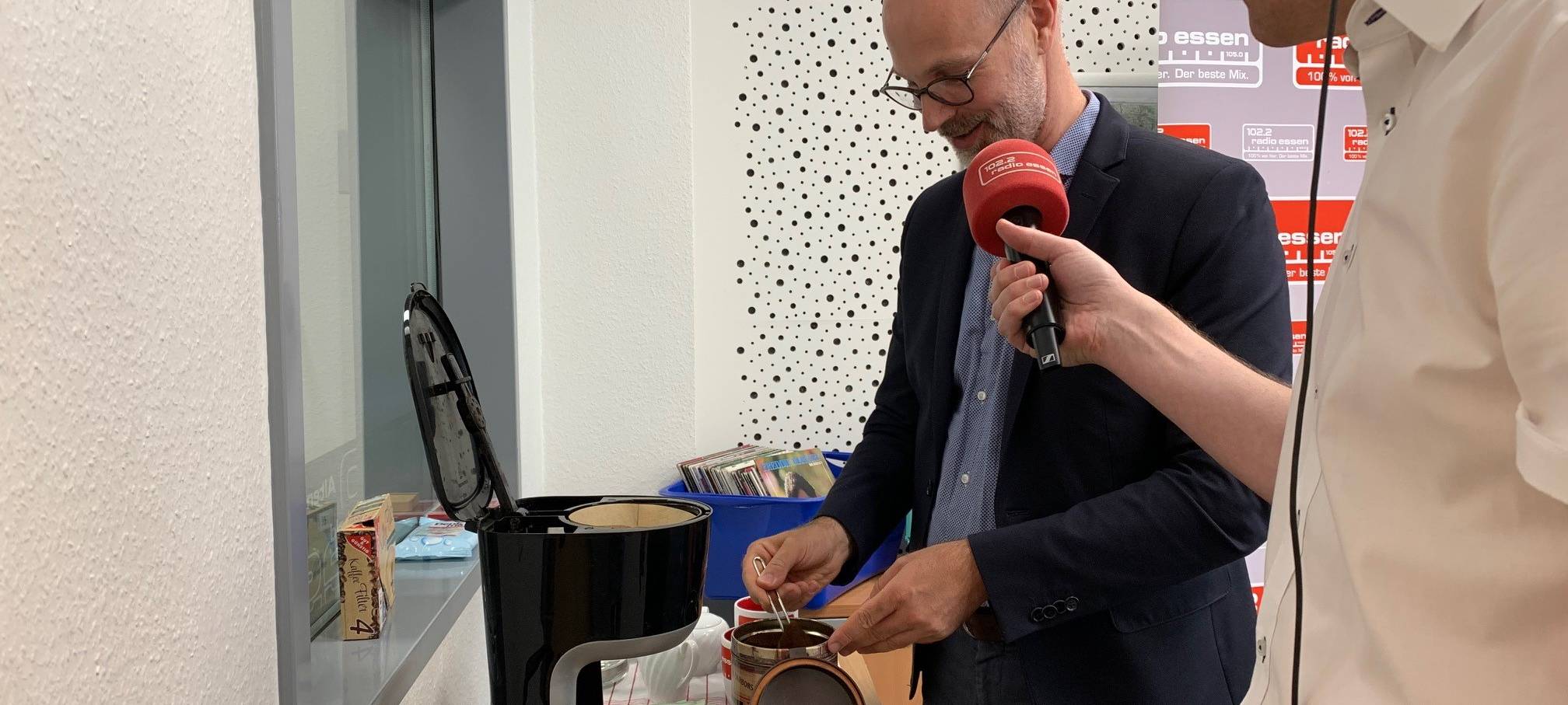 Der erste SPD-Direktkandidat bei Radio Essen: Sebastian Fiedler aus dem Wahlkreis I (Nordwesten und Mülheim) hat sein Politiker-Praktikum bei uns absolviert. Dabei durfte er für die ganze Redaktion Kaffee kochen, den Wetterbericht sprechen und unter Zeitdruck Fragen beantworten. Die Aktion hat ihm besonders wegen der witzigen Atmosphäre und der ungewöhnlichen Fragen gefallen. Unser Nachrichtenredakteur Tobias Stein hat sich besonders über den starken Kaffee des Praktikanten gefreut.