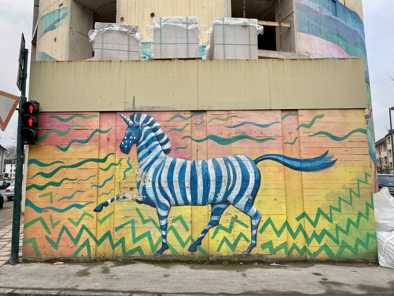 Von außen wird der bunte Bunker in Essen wieder grau, denn er bekommt einen dünnen Dämmputz in Beton-Optik. Dann verschwindet auch das Zebra von der Fassade. Fans von Rot-Weiss Essen wollen das Zebra nicht mehr sehen, denn es erinnert sie an das Wappen des MSV-Duisburg und gehöre nicht nach Essen Altendorf. Auch die Bauarbeiter auf der Bunker-Baustelle können es kaum abwarten, bis das Zebra mit grauem Spezialputz überzogen wird.