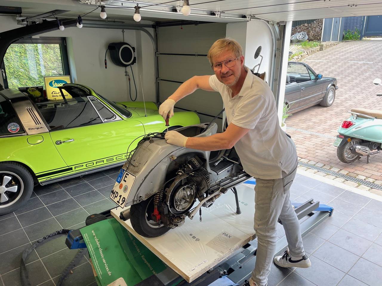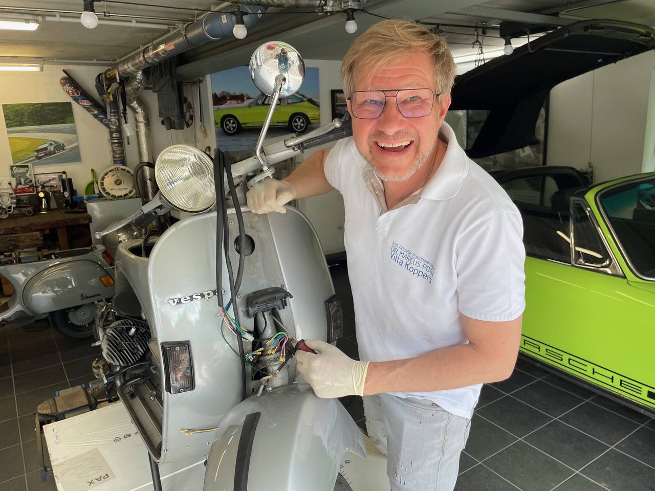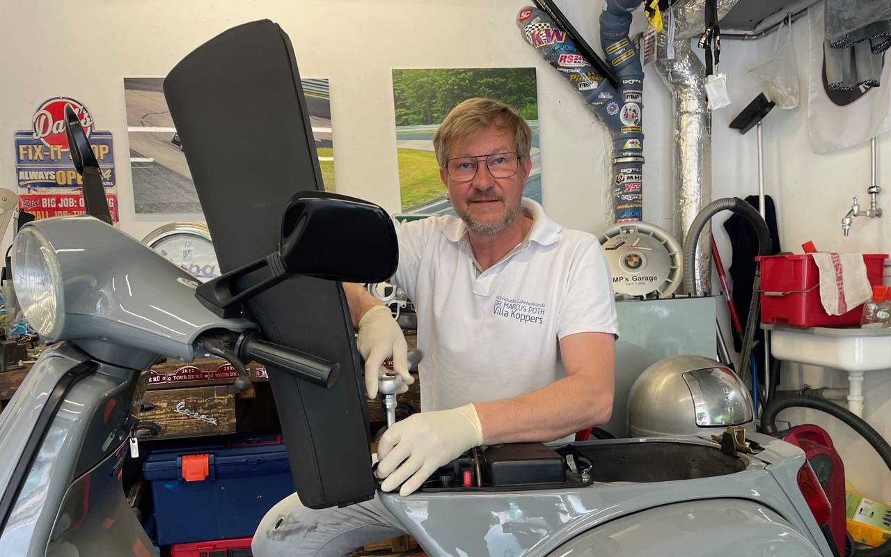 Über 60 Arbeitsstunden stecken in der Vespa Cosa CL. Marcus Poth hat den Roller liebevoll restauriert und ihn für die Charity-Versteigerung des 1. Oldtimer-Treffens in Rüttenscheid zur Verfügung gestellt. Radio Essen-Stadtreporter Timm Schröder hat ihn in seiner Bastlerwerkstatt in Fischlaken getroffen. Vespas sind seine Leidenschaft, seit er 16 Jahre alt ist. Damals hat er schon zusammen mit Schulkollegen in der Garage seiner Eltern an Rollern geschraubt. Inzwischen hat der Zahnarzt auch seine Familie mit dem Vespa-Fieber angesteckt. Auch seine Frau und seine Tochter haben ihre eigenen Roller. Die Vespa, die versteigert werden soll, hat eine besondere Geschichte: Viele Jahre lag sie unbeachtet in einer Scheune. Dann sollte sie nur als Ersatzteilspender herhalten. Dafür war sie Marcus Poth aber viel zu schade. Jetzt erstrahlt sie im neuen Porsche-grauen Glanz und wartet auf einen neuen Besitzer.