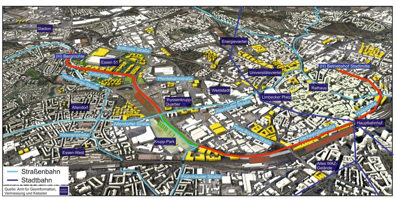Vom Hauptbahnhof zum neuen Stadtteil Essen 51 in achteinhalb Minuten. Die Citybahn soll die Innenstadt mit dem neuen Stadtteil verbinden.