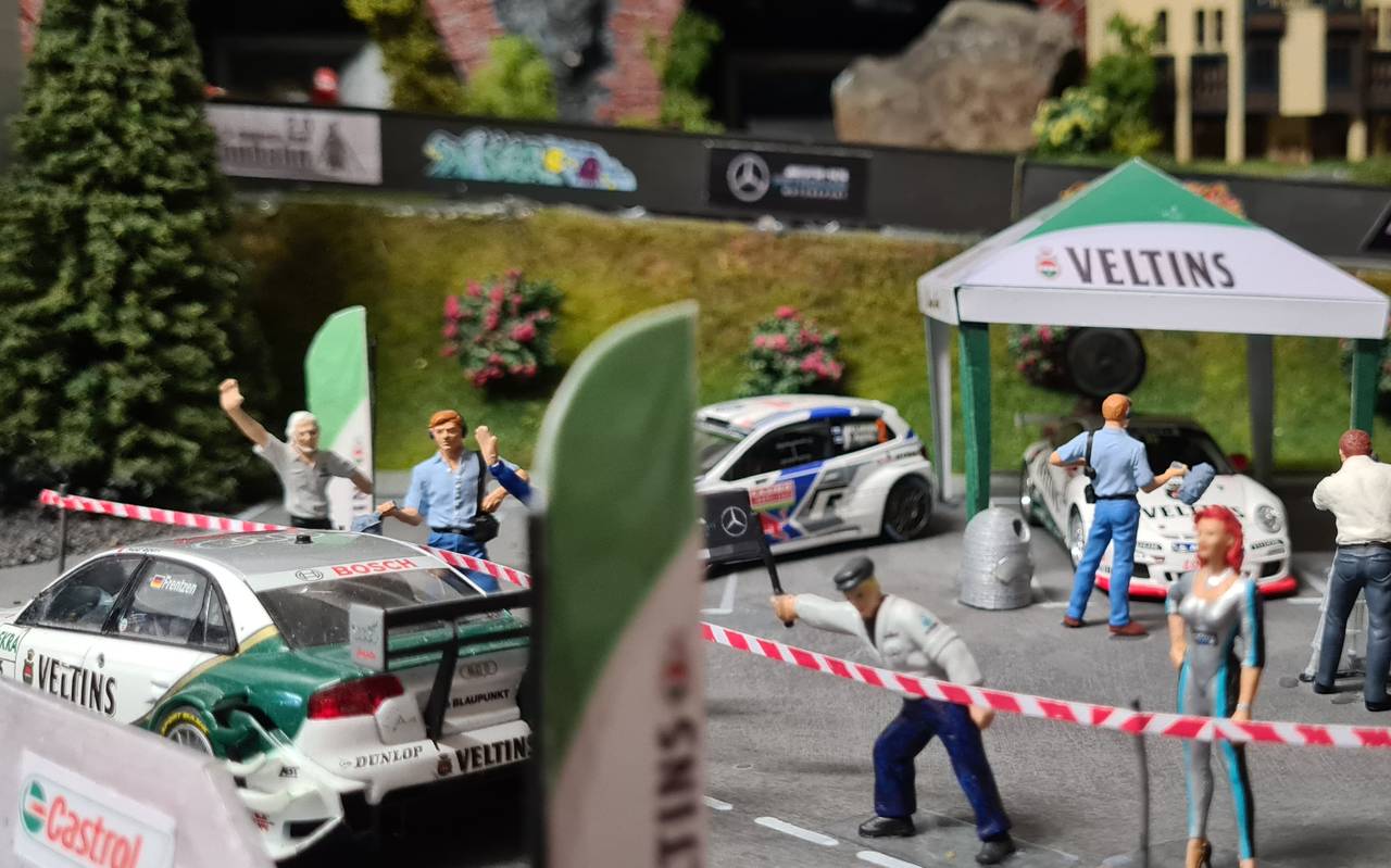 Die silbrige Fassade des Einkaufszentrums am Limbecker Platz in Essen hat Roland mit einem Freund nachgebaut. Sie haben Milchtüten aus Tetra Pak auf links gedreht, zurechtgeschnitten und in Form gebogen. Das hat Monate gedauert. Aber es war das günstigste Baumaterial und sieht echt aus. Die Boxengasse ist direkt vor dem Einkaufszentrum. Das steht auch Rolands Freundin in Mini-Format. (Die junge Frau mit den roten Haaren)