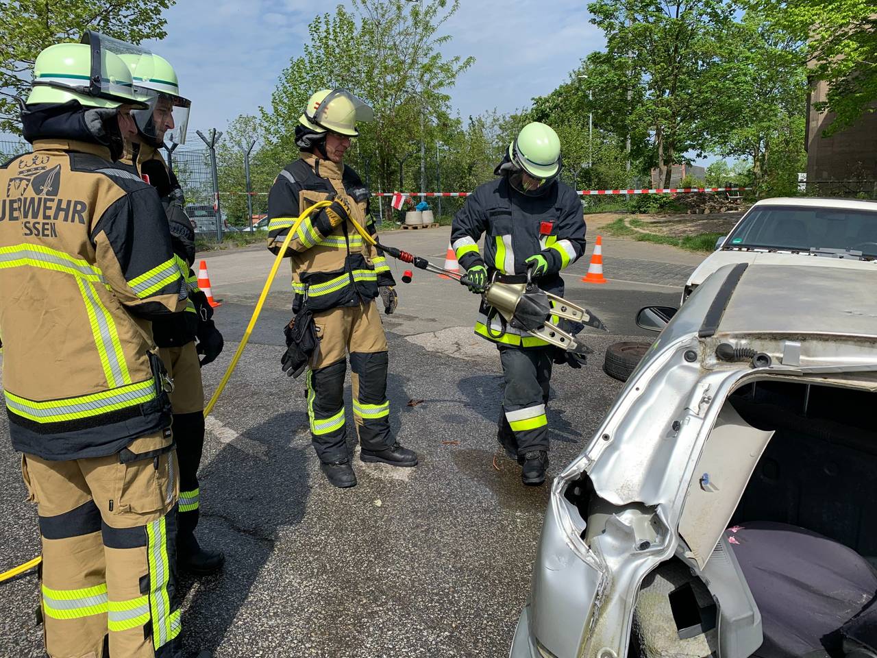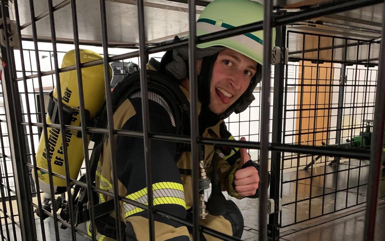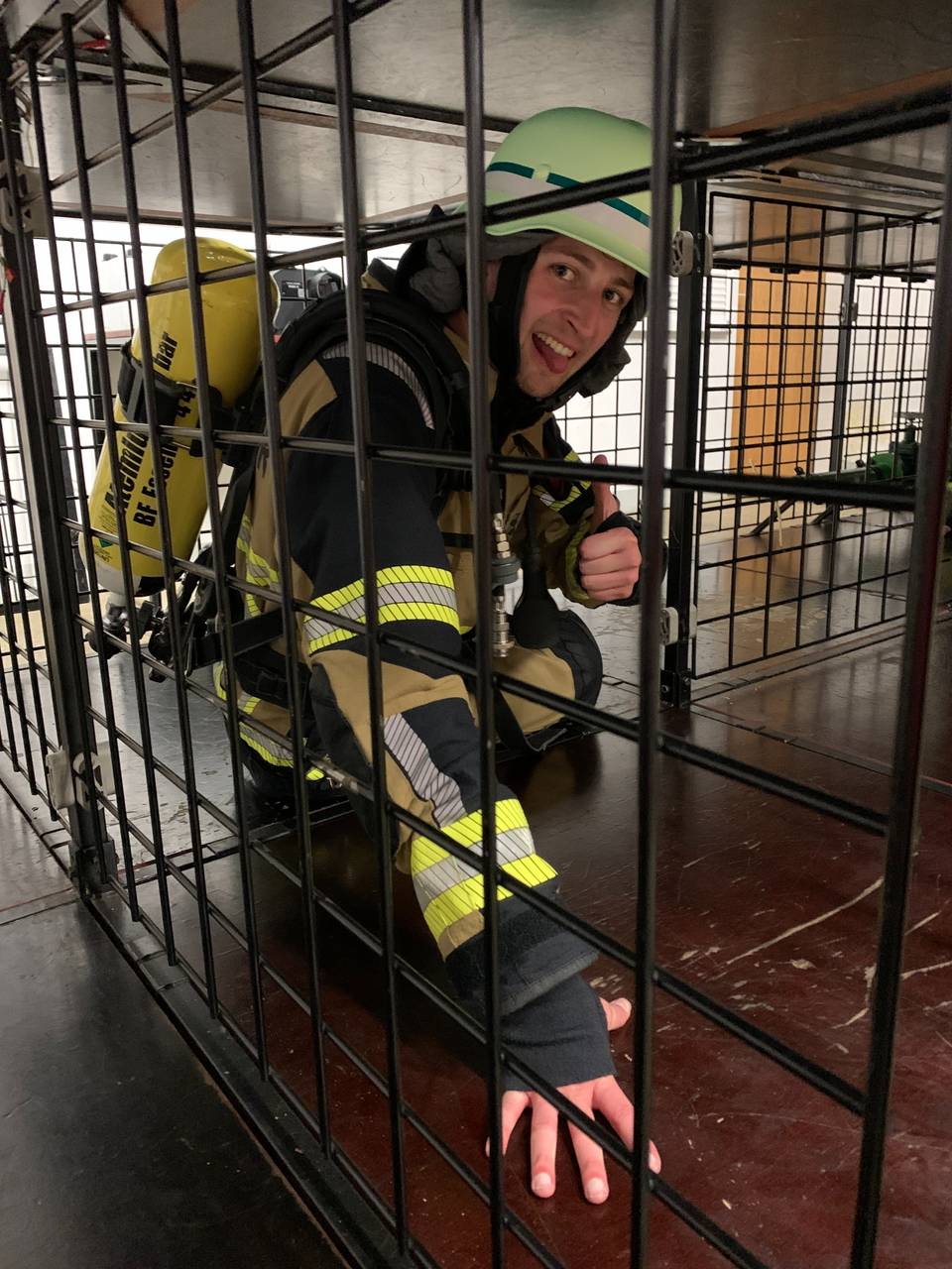 Obwohl besonders Larissa am liebsten sicheren Boden unter den Füßen hat, ging es für beide mit der Drehleiter 30 Meter hoch hinaus. Von oben gab es einen tollen Ausblick. Am Ende musste sich unser Frühschichtteam in der Brandschule beim Feuerwehr-Parcours beweisen. Es ging mit voller Montur und Sauerstoffflasche eine Endlosleiter hoch (okay, nach 10 Metern war Schluss ;-)) und kriechend und kletternd durch den Hindernisparcours. Am Ende war die Feuerwehr zufrieden mit der Leistung. Larissa und Joshi haben sich gut geschlagen und Joshi hat sogar ein Angebot zur 18-monatigen Ausbildung zum Brandanwärter bekommen.