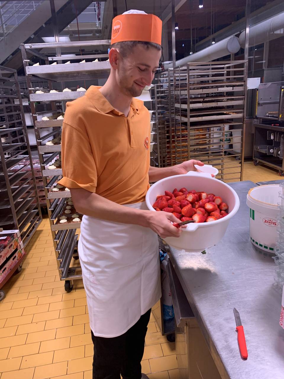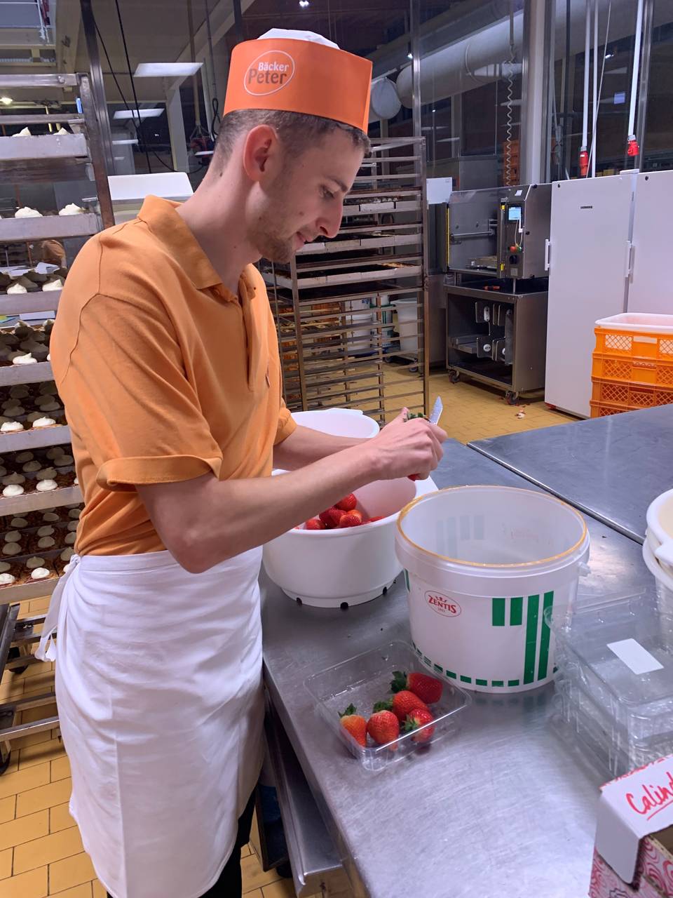 Um 1:45 Uhr beginnt der erste Praktikumstag für Joshua. So früh starten nicht viele Berufe - es geht zu Bäcker Peter, in die Backstube in Altenessen. Aber gut, wer für das Frühstück von ganz vielen Essenern sorgen will, der muss nun mal früh raus. Schon beim Geruch wird klar, es könnte schlimmer sein. Wobei die ersten Startschwierigkeiten schnell kommen. Schon das Anziehen der Schürze bereitet Schwierigkeiten. Dann geht es aber los, erstmal mit einer kleinen Kostprobe. Es gibt frische, warme Berliner. Etwas ganz seltenes und auch für Joshua purer Genuss. Jeden Tag muss die sogenannte "Qualitätskontrolle" gemacht werden, sagt Bäcker und Produktionsleiter Michael. Er ist seit 35 Jahren Bäcker, inzwischen "Chef der Nacht" und "Mädchen für alles". Zunächst schickt er Joshua an die Erdbeeren. Das Grünzeug muss abgeschnitten werden. Zum warmwerden kein Problem.