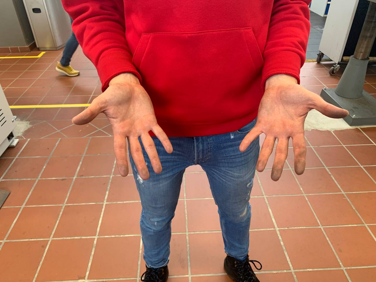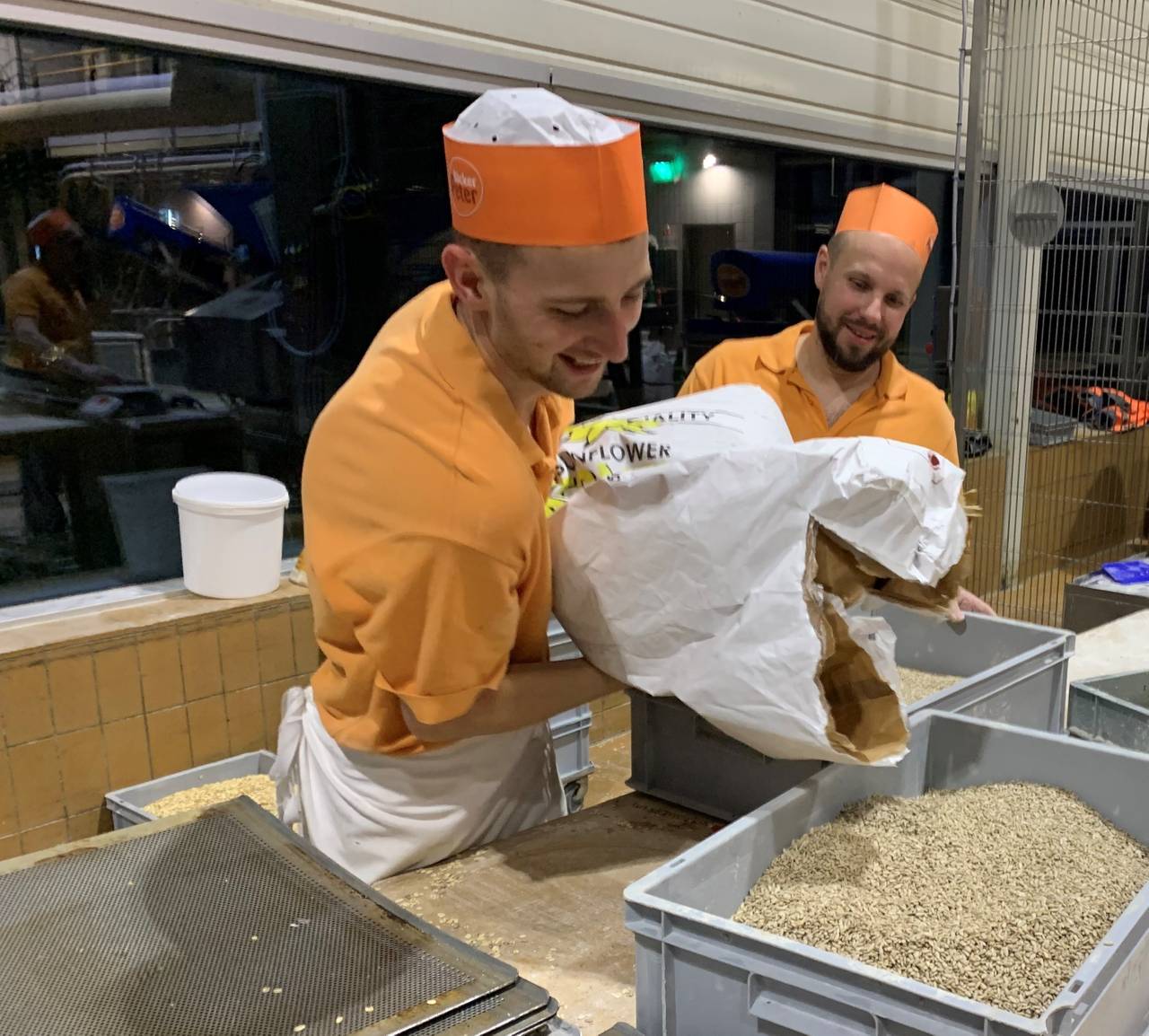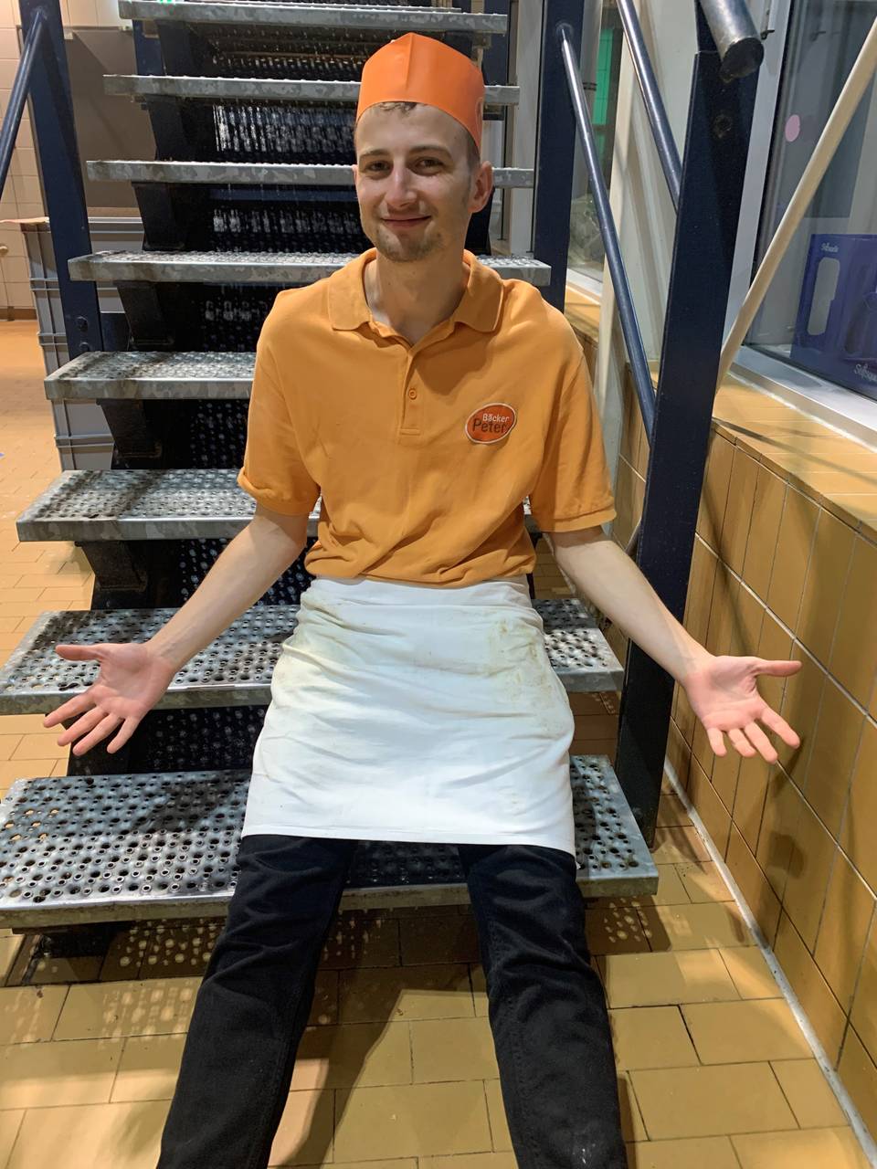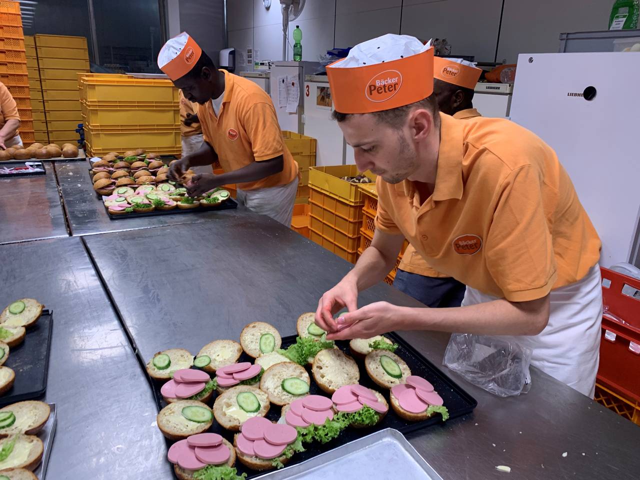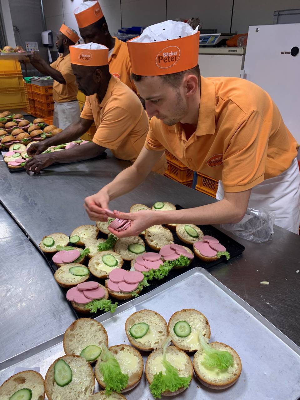 Danach wird es schon anspruchsvoller. Es geht ans Brötchen belegen. Dabei wird es hektisch. "Die haben nur ein Zeitfenster von knappen dreieinhalb Stunden um circa 4.000 Brötchen zu belegen", erklärt Michael. Und das sieht man auch. Während Joshua ein Brötchen mit zwei Scheiben Käse belegt, schaffen die anderen drei Mal so viele. Immer wieder wird das Tablet mit den Brötchen weggezogen, weil der nächste in der Reihe durch Joshis Stau nichts mehr zutun hatte. Viel Stress und Hektik, damit wir Sonntags ganz entspannt ins Brötchen beißen können. Bis auf die Hektik und ein paar "technischen" Schwierigkeiten hat Joshua aber auch diese Aufgabe gemeistert. Anders läuft es bei der letzten Station.