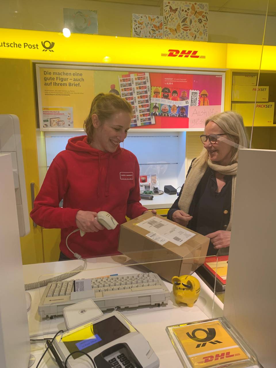 Dann darf Larissa auch die Kunden betreuen: Am Schalter heißt es Pakete annehmen, ins Lager bringen, Abholscheine entgegennehmen und Pakete aus dem Lager holen. Larissa findet: Es ist ein anstrengender Job. Das Schöne ist aber, wenn man es schafft, die Pakete wie bei Tetris so einzusortieren, dass es genau passt!