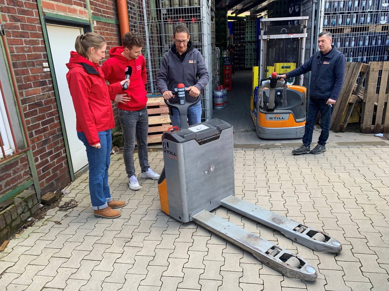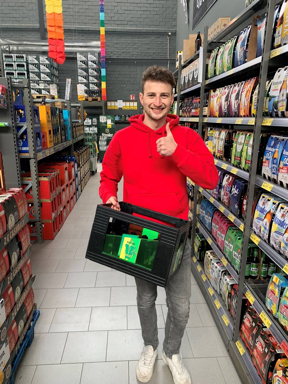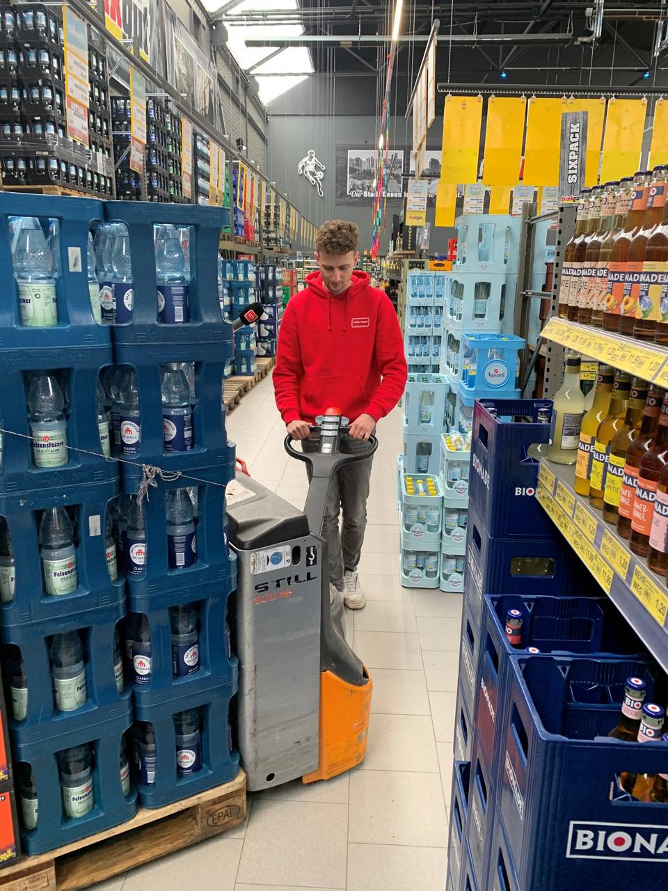 Also geht es an die nächste Station. Ware einräumen steht an. 500 verschiedene Sorten Bier und 2.500 Sorten alkoholfreie Getränke gibt es im Markt. Joshi startet aber erstmal mit einer Palette. Die elektrische "Meise" zum Transport und rein in den Markt. Gar nicht so einfach, bei vielen engen Gängen und einkaufenden Kunden. Larissa hingegen hat Gefallen am Dirigieren gefunden. Nachdem Joshi auch hier zu langsam war, gibt es eine kleine Lehrstunde im Gabelstapler-Fahren. Danach zeigt Larissa noch ihre Fähigkeiten an der Kasse und dann war es das schon. Das Fazit? Beide können gerne anfangen.