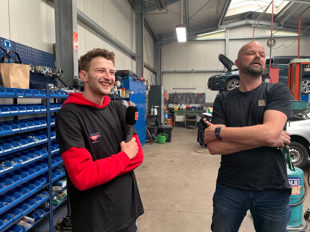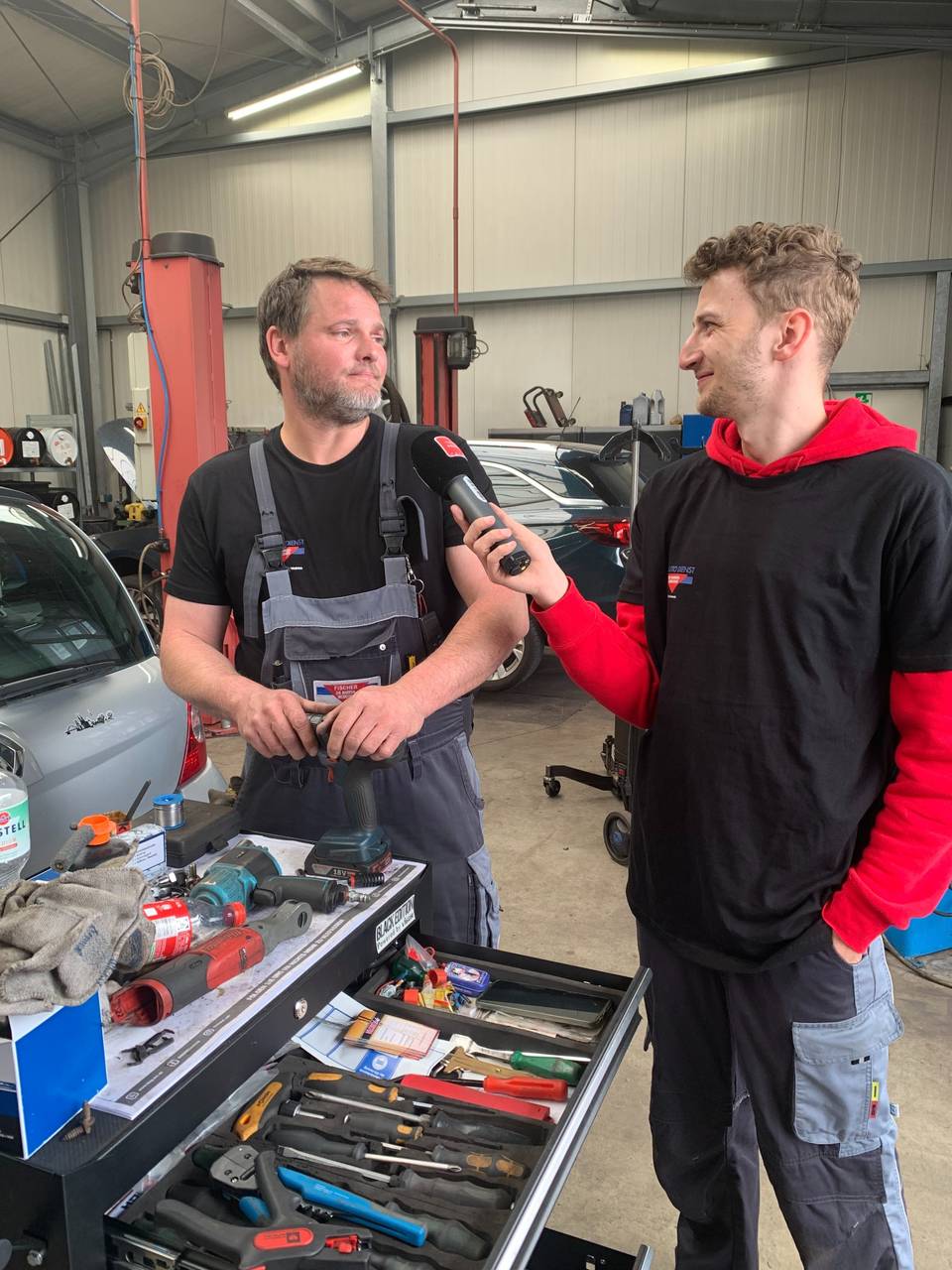 Joshua beim Radio Essen-Frühschicht-Praktikum in der Kfz-Werkstatt