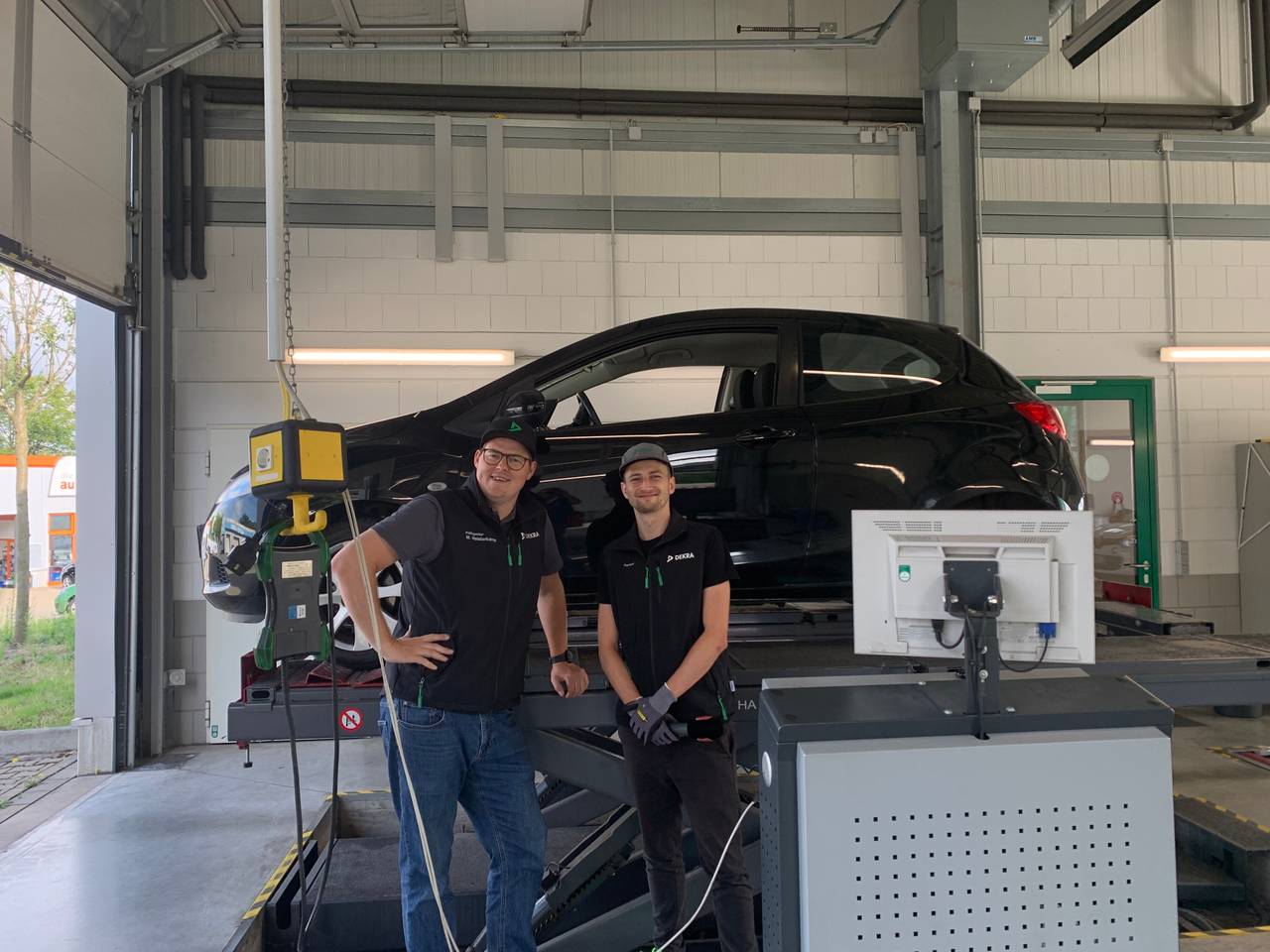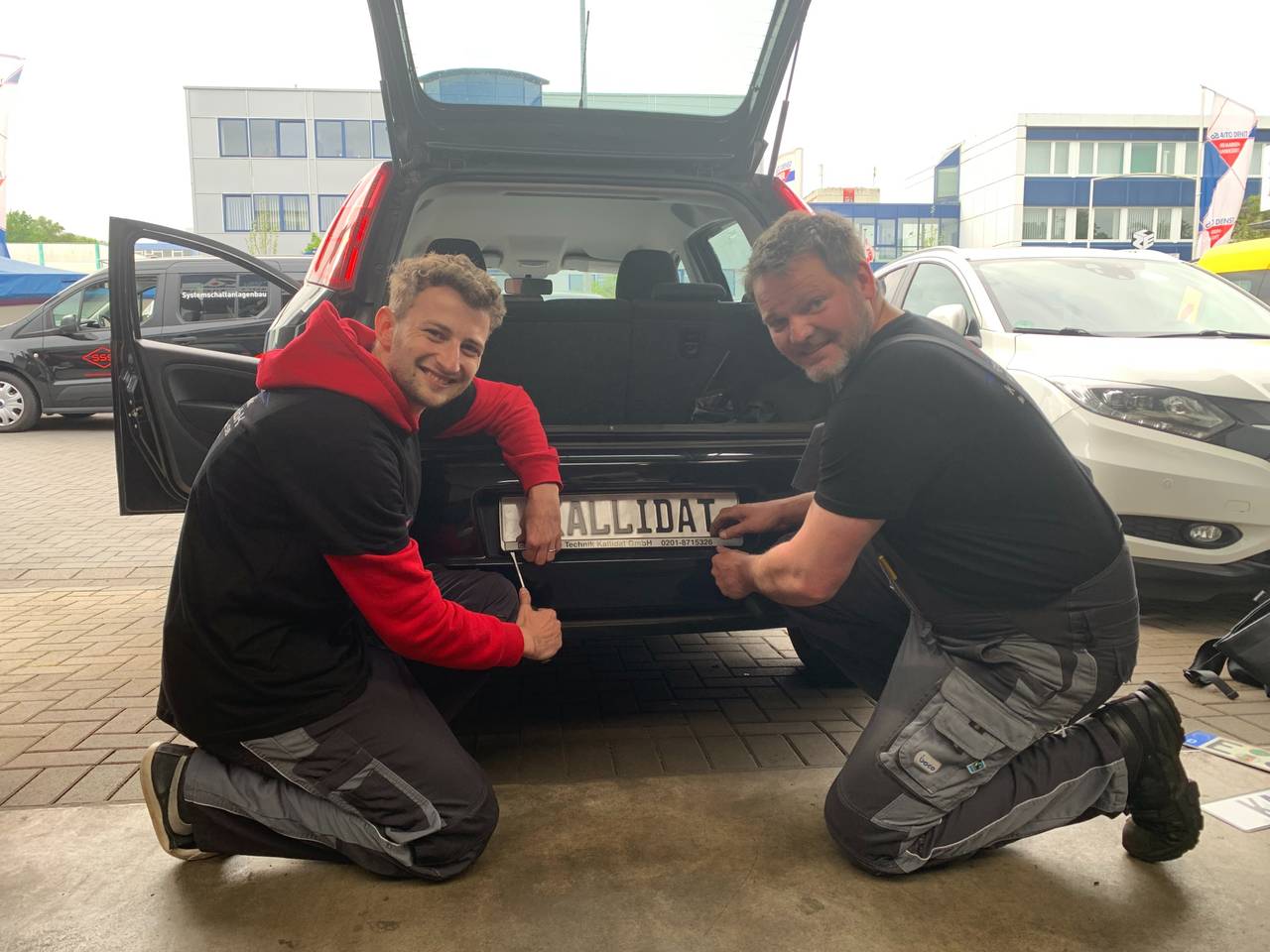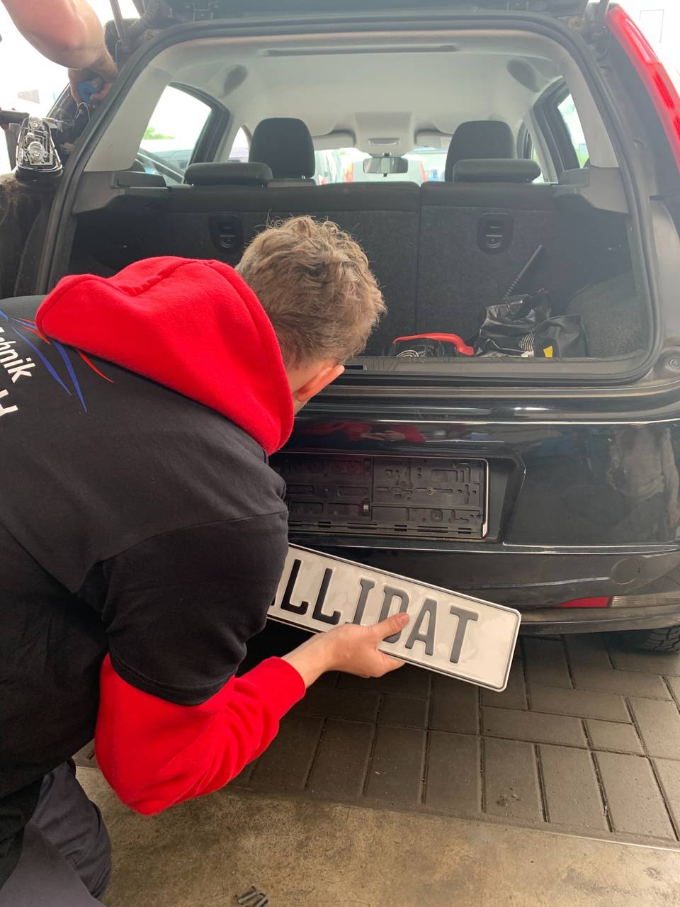 Zuerst heißt es: Bestandsaufnahme von Joshis Auto. Das Schloss der Heckklappe ist kaputt - das wird zuerst repariert. Da durfte Joshua erst einmal nur zugucken, Kfz-Mechaniker Florian hat ein bisschen geschraubt und gerüttelt - und dann war das Heckklappenschloss repariert! Danach hat Joshi eine neue Kennzeichenbefestigung bekommen. Da durfte Joshi dann selbst ran, die alte Kennzeichenbefestigung abschrauben und eine neue draufschrauben.