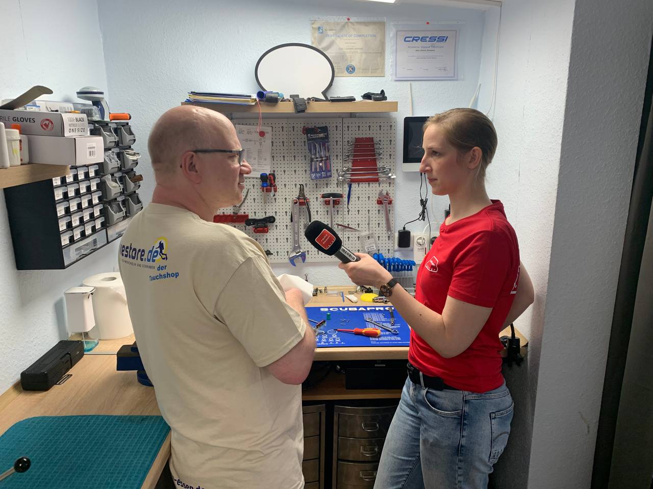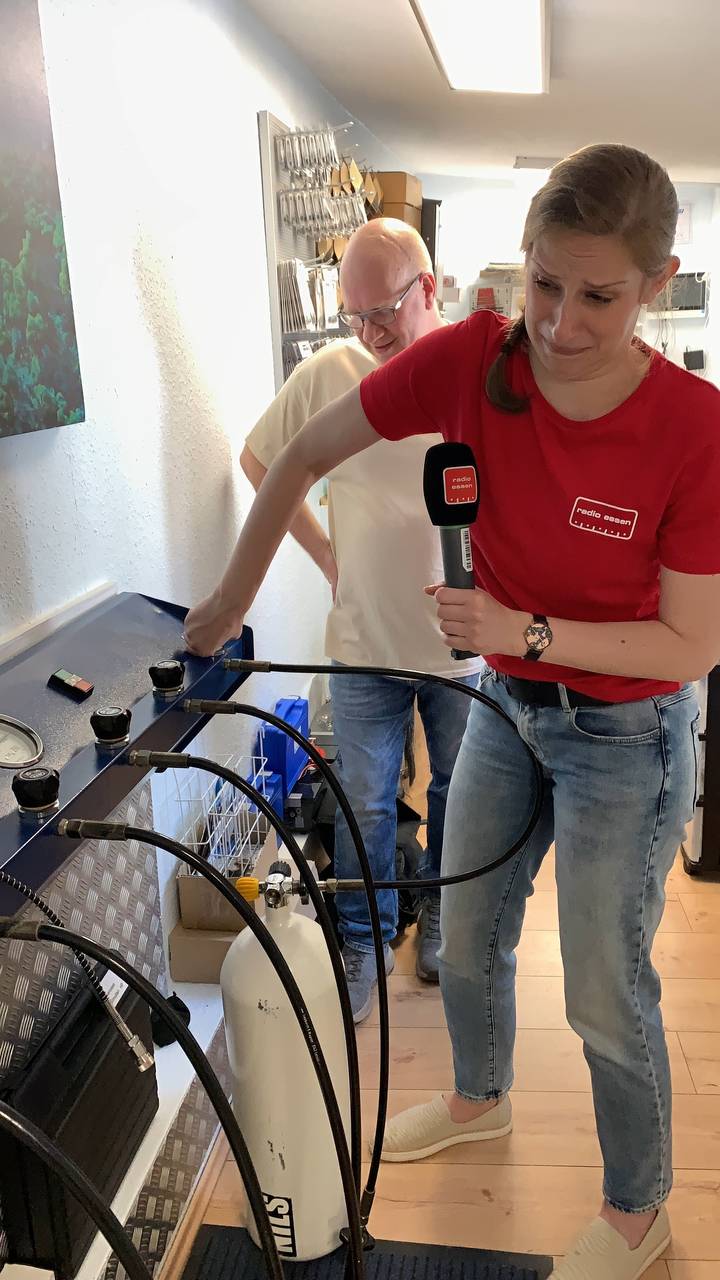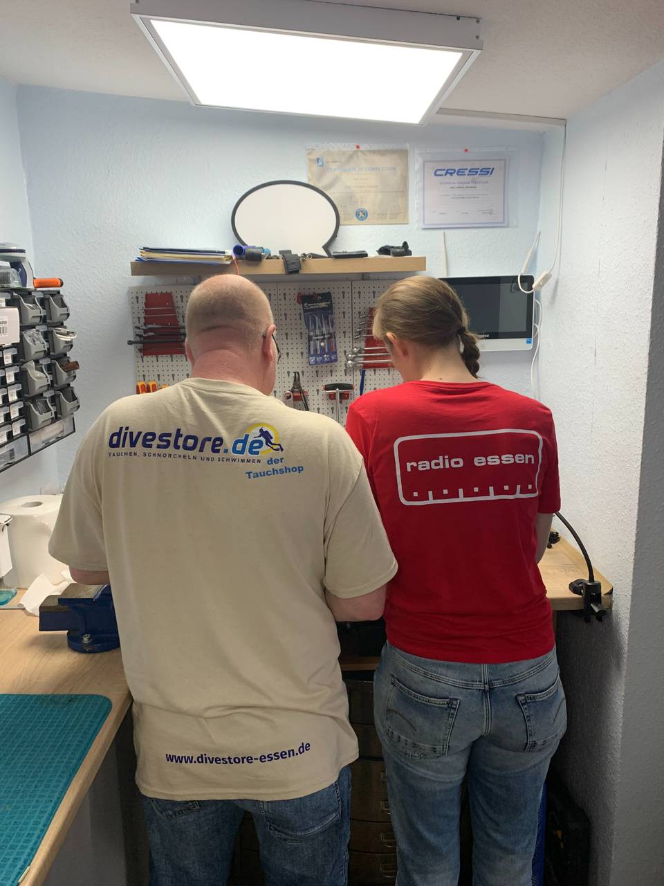 Radio Essen-Frühschicht-Moderatorin Larissa Schmitz hatte die Möglichkeit, in einem Tauchshop auszuhelfen. Alexander Lamers, der Leiter des Ladens in Heisingen und an dem Tag Larissas Chef, hat ihr alle Bereiche gezeigt. Er betreibt den Laden seit über 30 Jahren und ist selbst leidenschaftlicher Taucher. Larissa hatte viel Spaß dabei, richtig mit anzupacken. Nach einem kurzen Kennlerngespräch haben die beiden direkt mit der wohl wichtigsten Aufgabe angefangen - die Pressluftflaschen mit Sauerstoff zu befüllen.