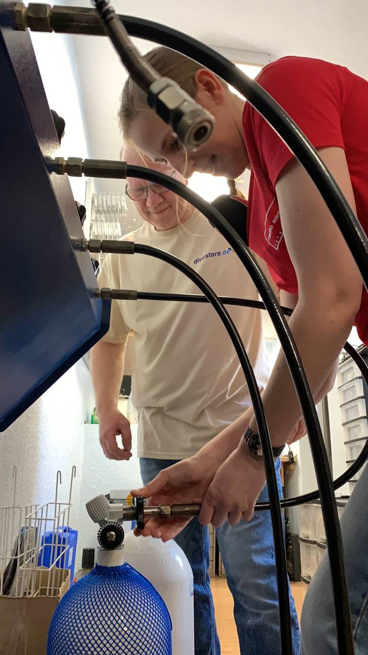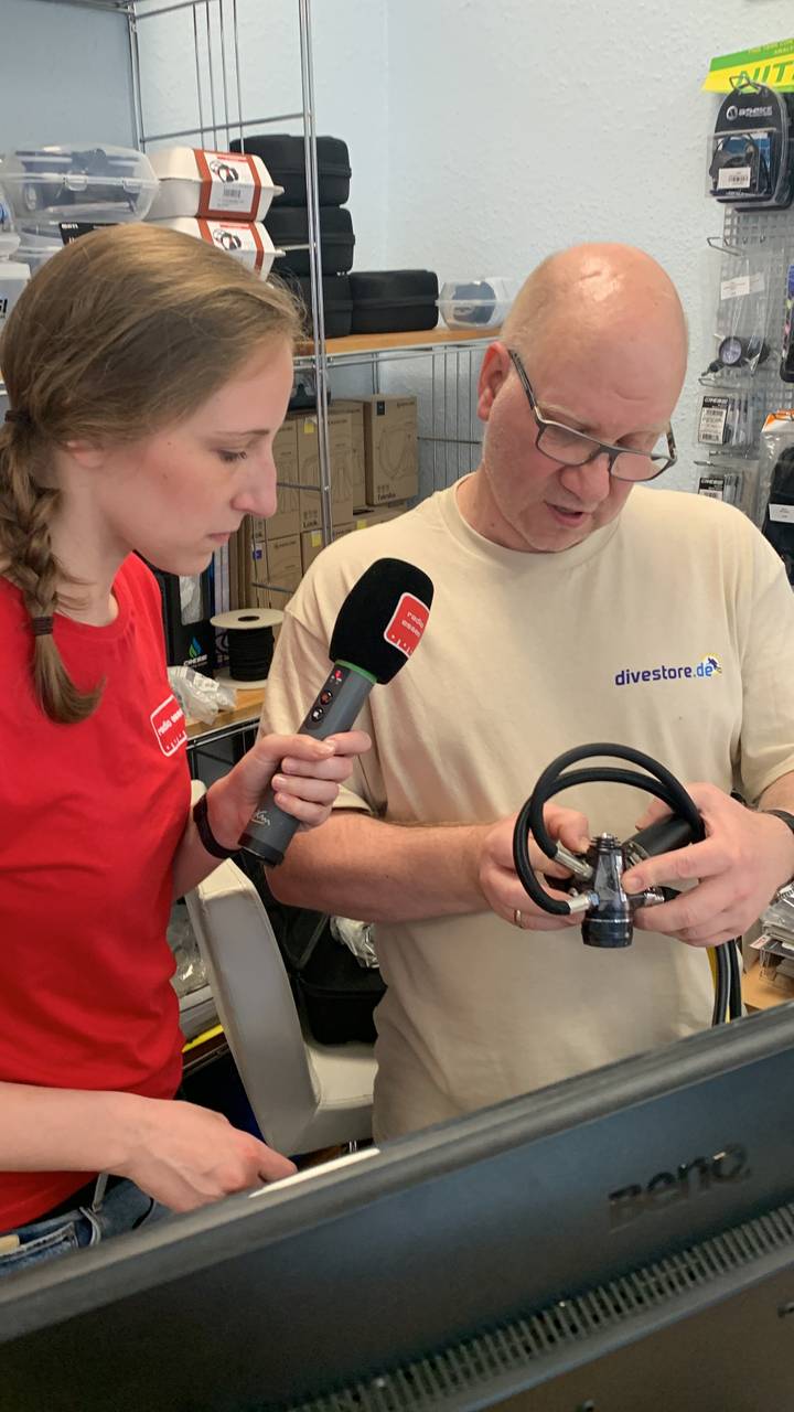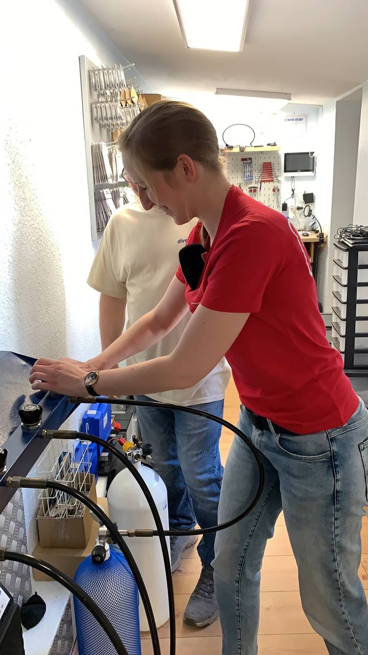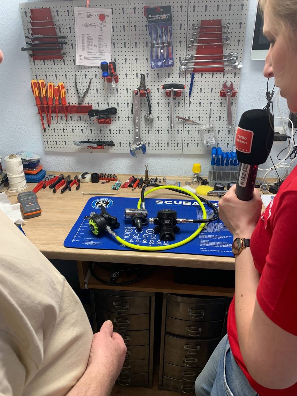 Im Anschluss durfte die Praktikantin noch an die Werkbank. Larissa hat dort die Batterie am Sender für eine Tauchcomputer gewechselt. Das ist wichtig, denn dieser Sender zeigt dem Taucher an, wie viel Sauerstoff noch in seiner Flasche ist. Danach hat Larissa eine Bestellung, einen Lungenautomat, zusammengebaut. Dieser ist das Herzstück für jede Tauchausrüstung. Er verbindet alle wichtigen Ventile und Schläuche miteinander. Durch das Mundstück bekommen die Taucher dann unter Wasser Luft.