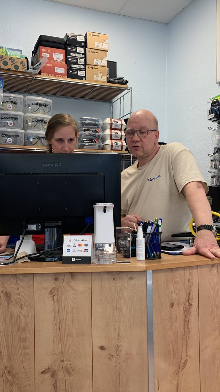 Außerdem repariert er viel Ausrüstung und befüllt und wartet Tauchflaschen für die Kurse und für Kunden. Darüber hinaus arbeitet er seit einiger Zeit mit einem großen Onlineshop zusammen, um auch viele Bestellungen unterzubringen. Verkauf und Reparatur nehmen also jeweils die Hälfte der Arbeit im Tauchshop ein.