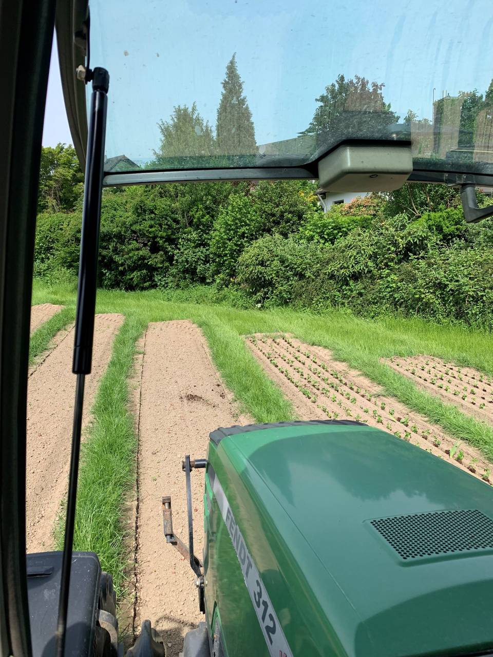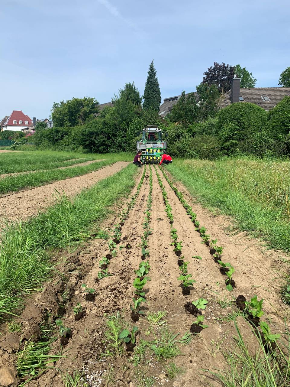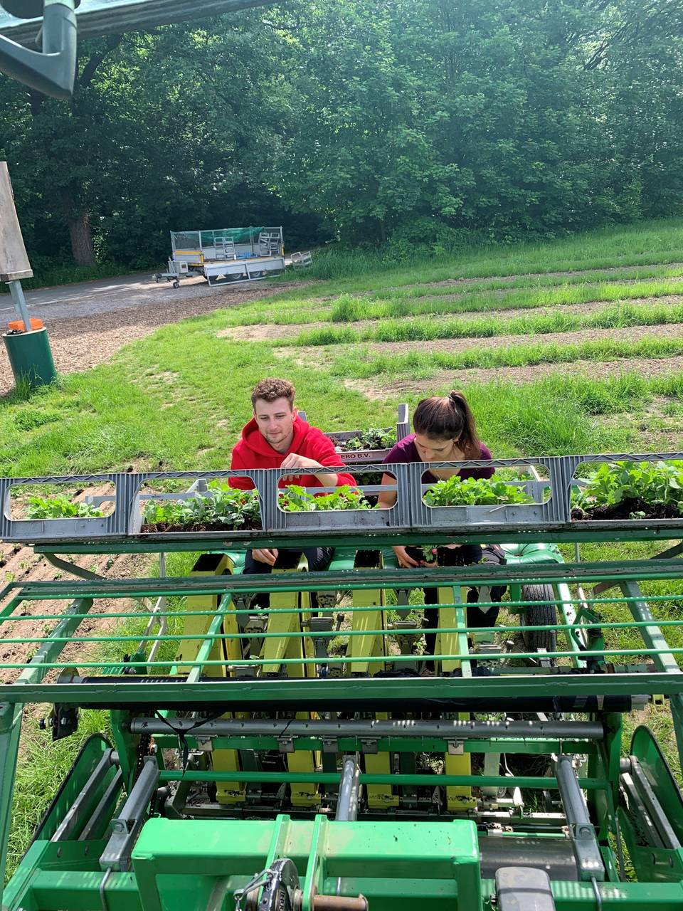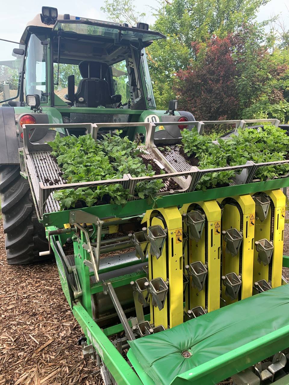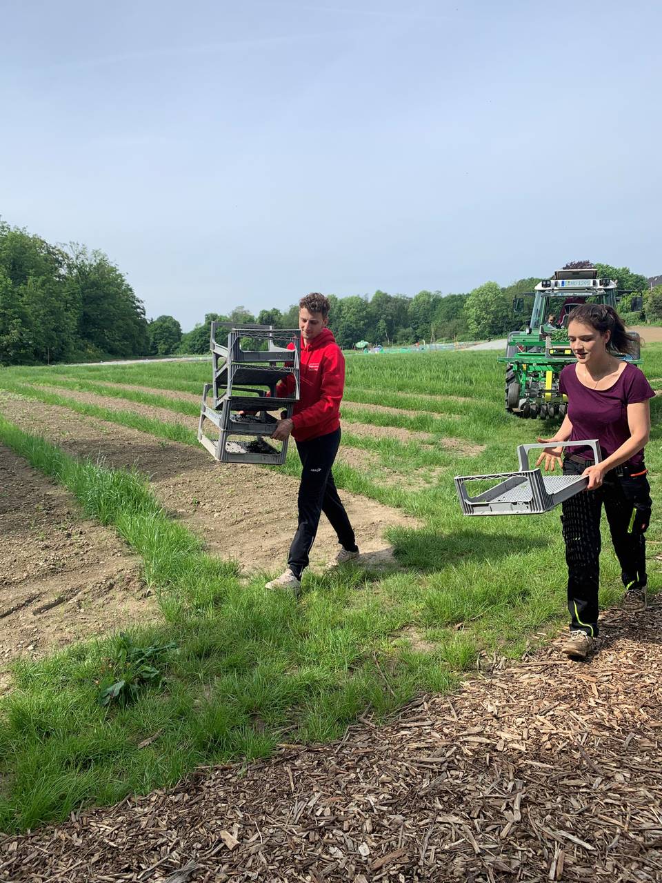 Um die Blumen einzupflanzen muss Joshua mit Nicole auf eine Maschine steigen, die hinter einem Trecker angebracht ist - den Trecker fährt Matthias. Joshua und Nicole stecken die kleinen Pflanzen in kleine Schalen aus Metall, die in einer Kette in den Boden führen. Das Gerät bewegt die Pflanzen in den Schalen auf und ab, dabei werden die Pflanzen in den Boden gedrückt. Drei Parzellen fährt Matthias mit dem Trecker ab, während Joshi und Nicole hinten auf dem Gerät per Hand die kleinen Pflänzchen in die Metallschalen stecken. Nach den Runden sind die Chrysanthemen dann in den drei Bahnen nebeneinander angeordnet. Insgesamt 1.500 Chrysanthemen haben Joshi und Nicole eingepflanzt!