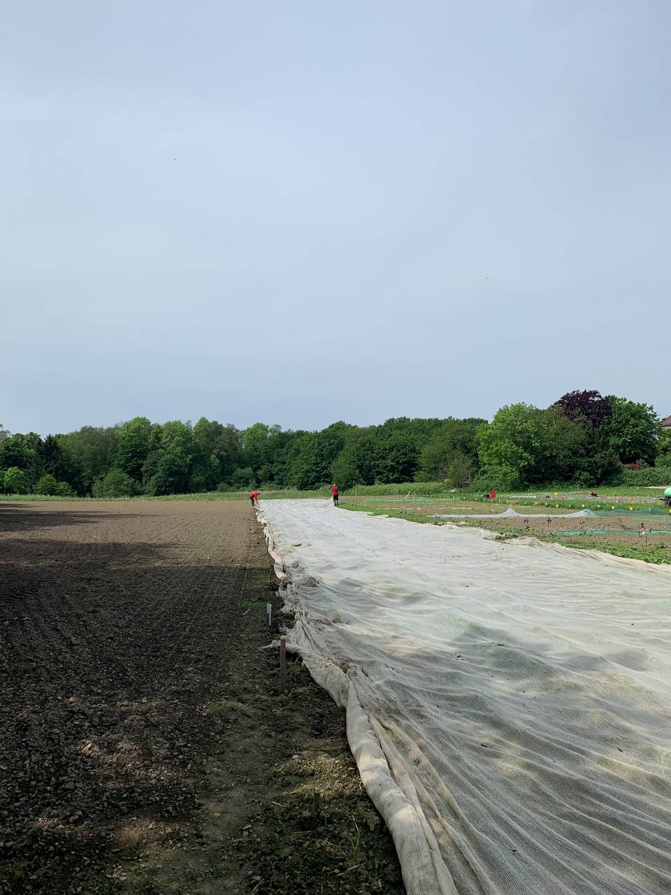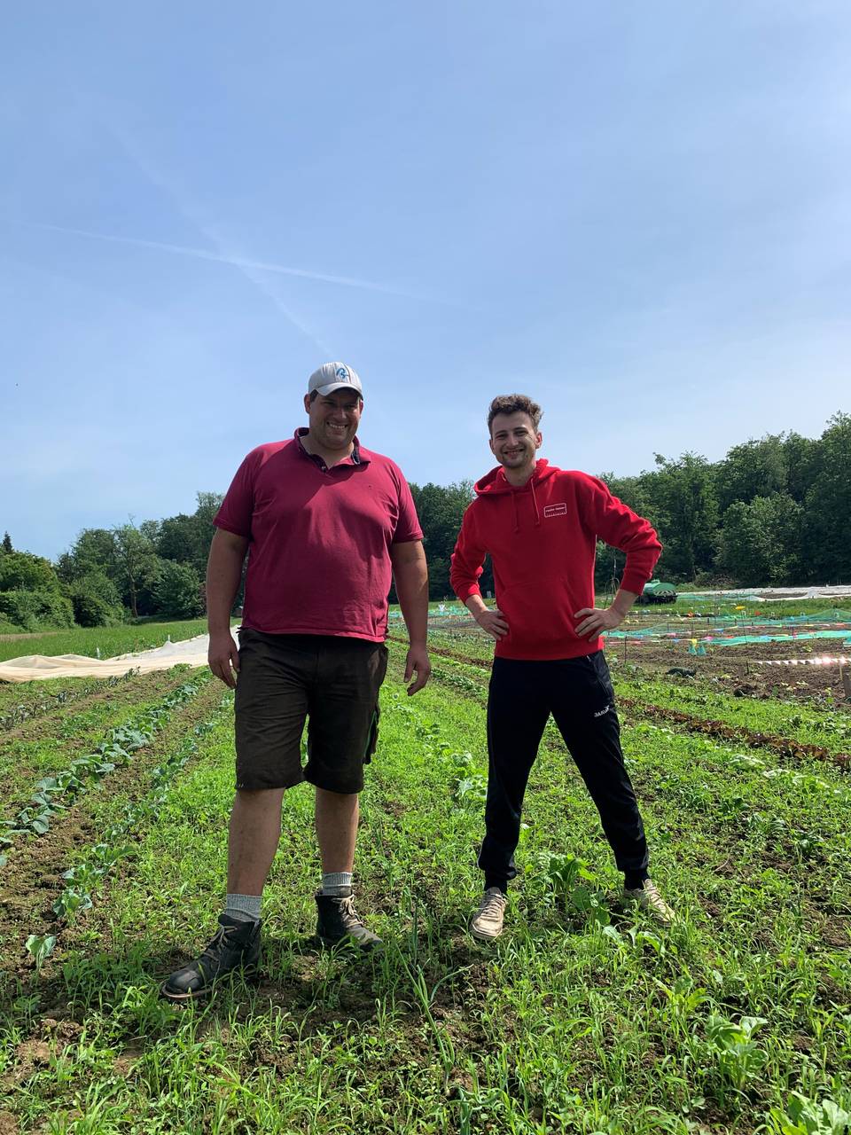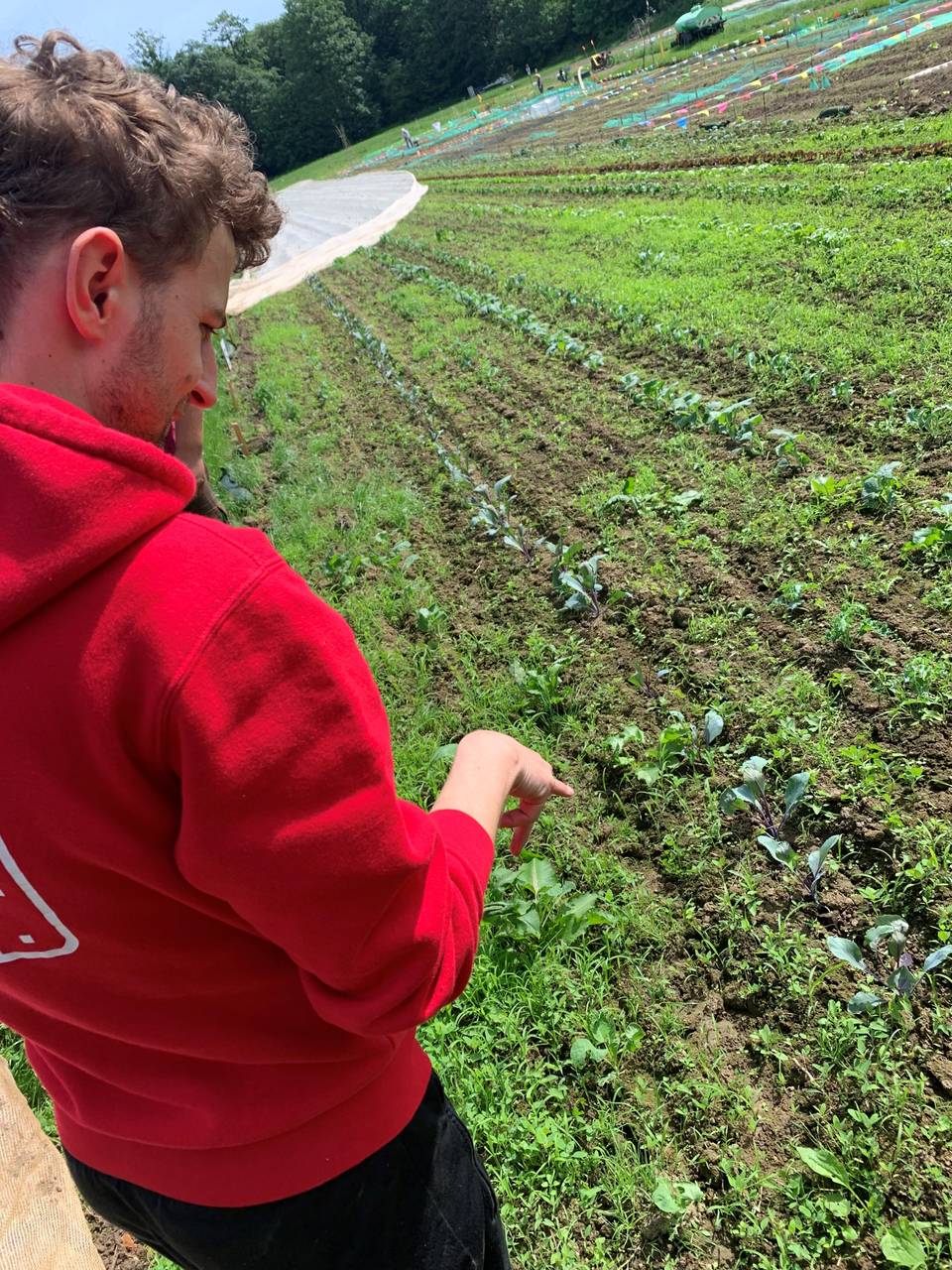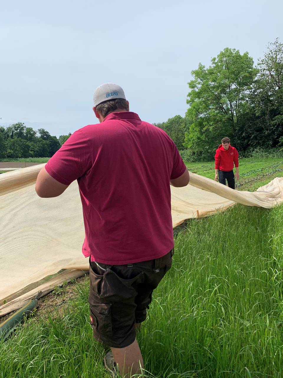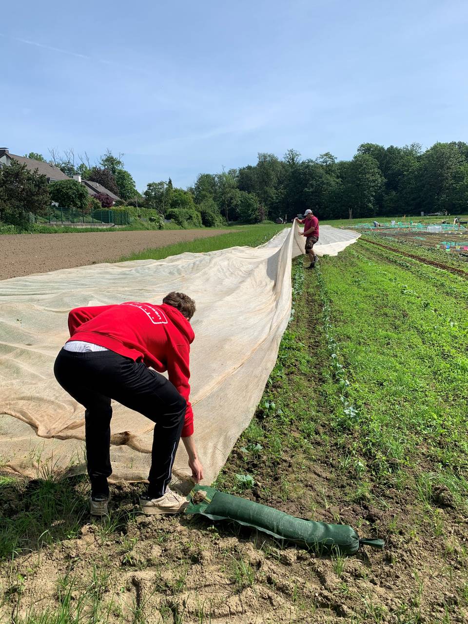 Dann geht es darum, ein riesiges Netz von einem Feld zu heben. Zuerst müssen die Sandsäcke runter, dann heben Joshi und Mathias das riesige Netz Stück für Stück runter und legen es zur Seite. Darunter ist jede Menge Gemüse, das bis dato mit dem Netz vor Vögeln geschützt wurde. Schon gut gewachsen und bald erntebereit sind etwa Spinat, Mangold und Salat. Dazwischen muss das Unkraut gezupft werden - je früher man damit anfängt, desto weniger Stress gibt es später damit, so Landwirt Matthias Ott.