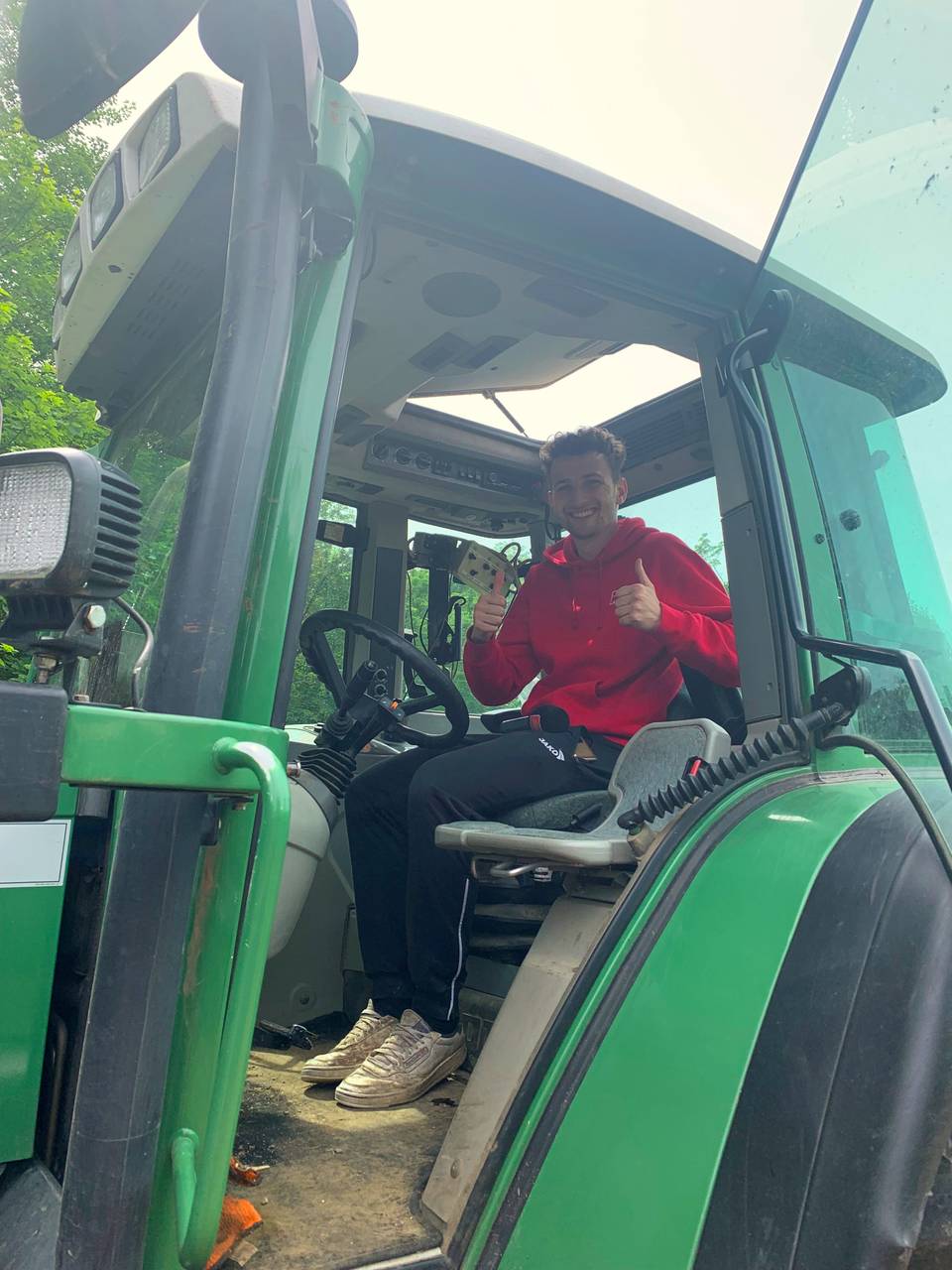 Dann geht es an das Highlight des Tages: Trecker fahren! Joshi darf einmal eine Runde um den Block drehen - oft muss Landwirt Mathias aber tatsächlich kilometerlange Strecken in die umliegenden Städte auf dem Trecker hinter sich bringen - mit 40 kmh. Die Lenkung ist viel einfacher als gedacht, sagt Joshi. Aber es ist schon nicht einfach, mit dem großen Trecker zu rangieren - vor allem rückwärts!