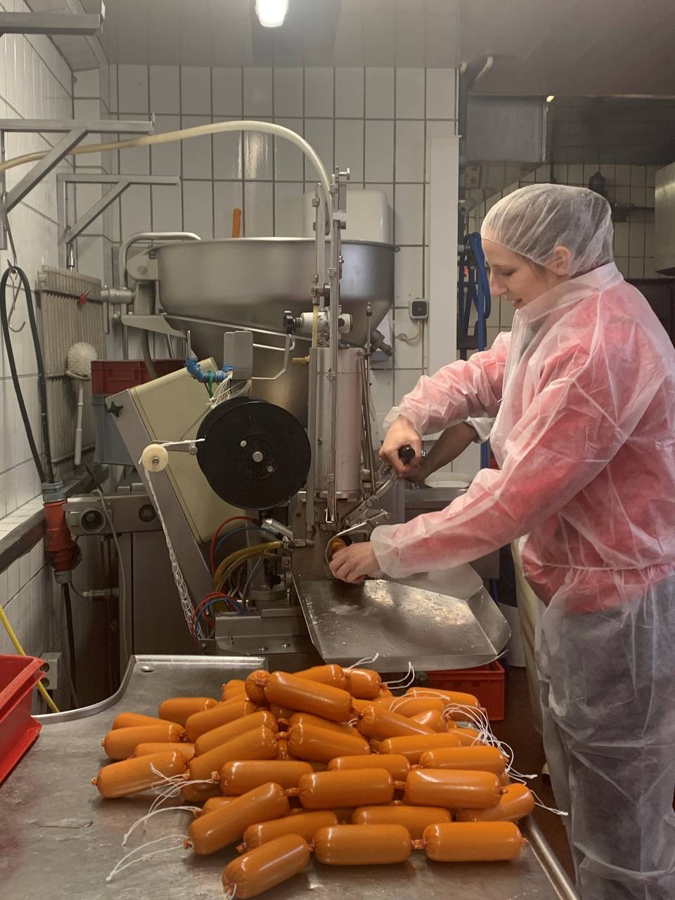 Die Masse in einen Naturdarm zu drücken und drehen, war doch etwas schwieriger. Da war sehr viel Fingerspitzengefühl gefragt. Ein paar Mal brauchte Larissa dann doch Hilfe. Aber ein Highlight der Produktion folgte schnell: Der Räucherofen hat auf einmal seine Tür geöffnet. Ein leckerer Knoblauch-Geruch hat sich breit gemacht. Beim Probieren erzähle Julia Schmidt grinsend, dass die Fleischwurst ganz frisch aus dem Ofen am besten schmeckt. Sie ist Fleischermeisterin und die Betriebsleiterin in der vierten Generation. Schon als Kind war die frische Fleischwurst auf dem Schulhof heiß beliebt.