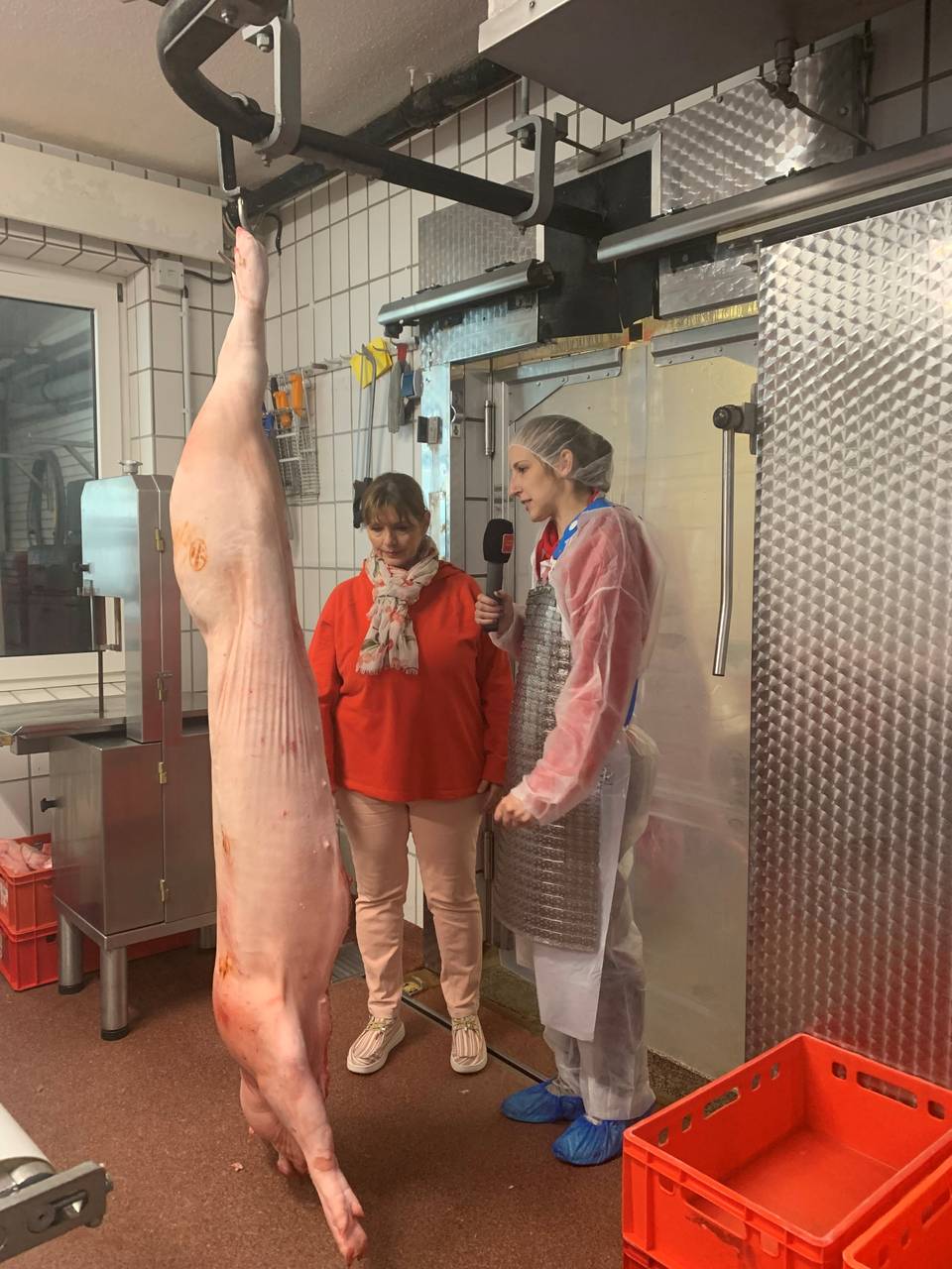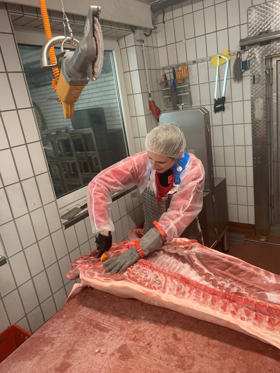 Dann hieß es: Kettenhemd und Schutzhandschuhe an! Das angelieferte Fleisch musste richtig zerlegt werden. Auf Larissa wartete ein halbes Schwein. Mit guter Anleitung und viel Geduld, konnte Larissa das Schwein so zerteilen, dass das Schweinefilet, das Nackensteak und der Bauchspeck vom Knochen getrennt wurden. Die Profis schaffen das in fünf bis sechs Minuten, so schnell ging es für unsere Moderatorin natürlich nicht.