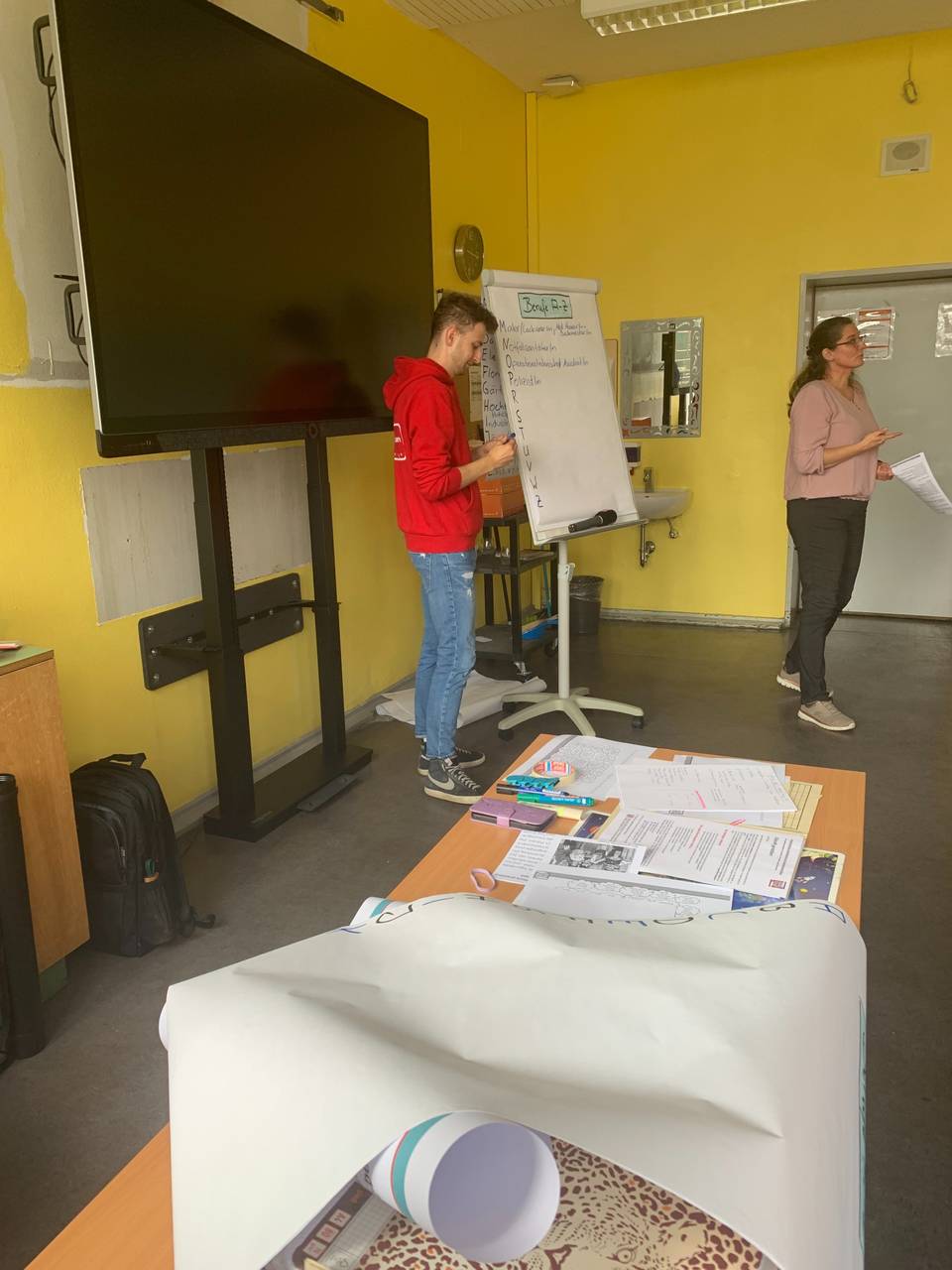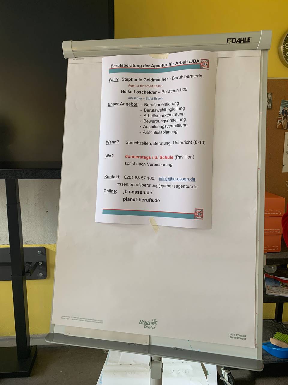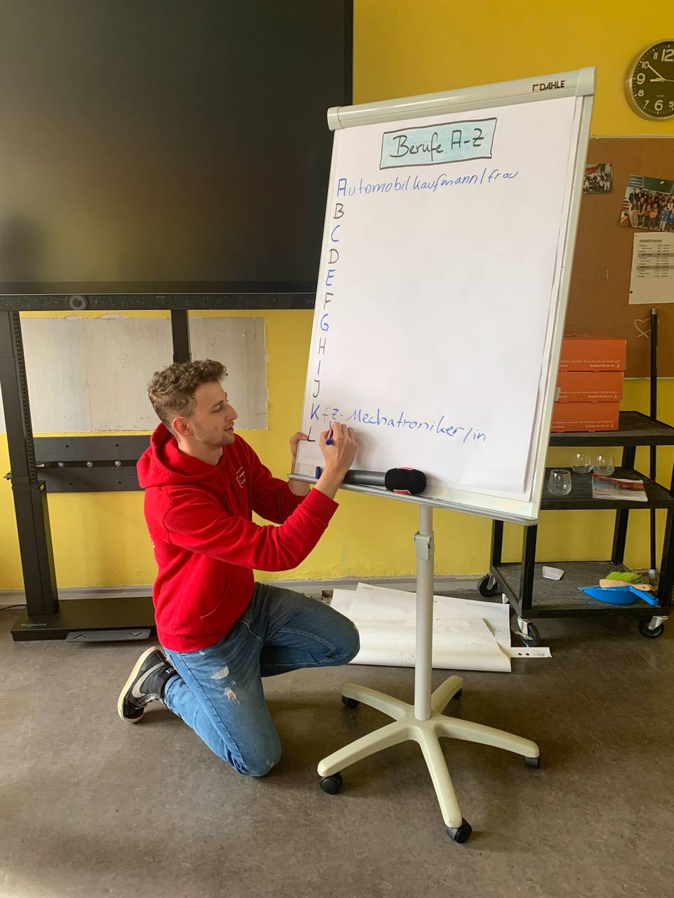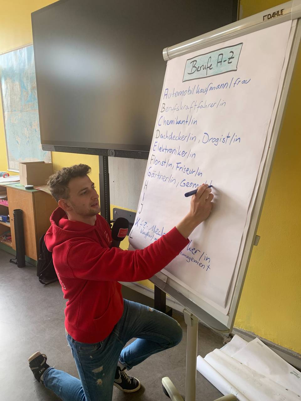 Stephanie hat Joshi morgens um kurz vor acht vor der Schule begrüßt. Jeden Donnerstag ist sie an der Schule in Steele, um Jugendlichen bei Fragen zu Berufen, Vorstellungsgesprächen, Bewerbungen und vielem mehr zu helfen. Der Tag startete morgens in der Klasse 8d. Hier hat Stephanie die Schüler erst gefragt, was denn Berufsberater machen. Auch Joshi durfte hier mitraten und das kam dabei raus: Eine Berufsberaterin kann zum Beispiel auch beim Elternsprechtag dabei sein und - ganz wichtig: Sie gibt den Jugendlichen nicht eine verbindliche Beratung, sondern eine "Idee", was sie nach der Schule machen könnten. Nachdem Stephanie die Fragen aufgelöst hatte, stand Berufe raten auf der Tagesordnung: Hier sollten die Jugendlichen Ausbildungsberufe mit allen möglichen Anfangsbuchstaben finden. Das war bei einigen Buchstaben ganz schön schwierig. Trotzdem gibt es in Deutschland über 300 anerkannte Ausbildungsberufe. Joshi hat die richtigen Vorschläge der Jugendlichen auf ein Flip-Chart geschrieben - und wurde am Ende sogar für seine schöne Handschrift gelobt.