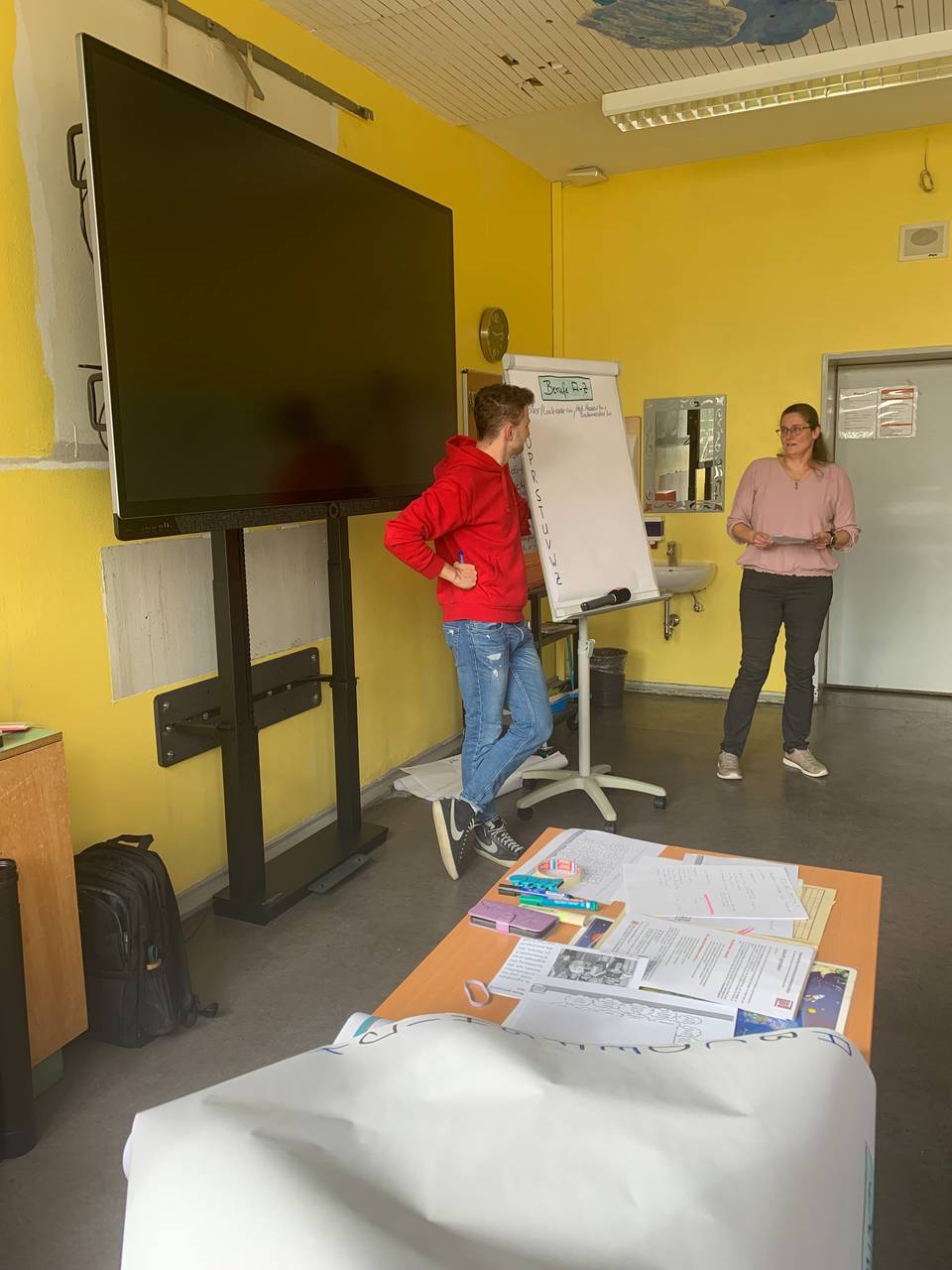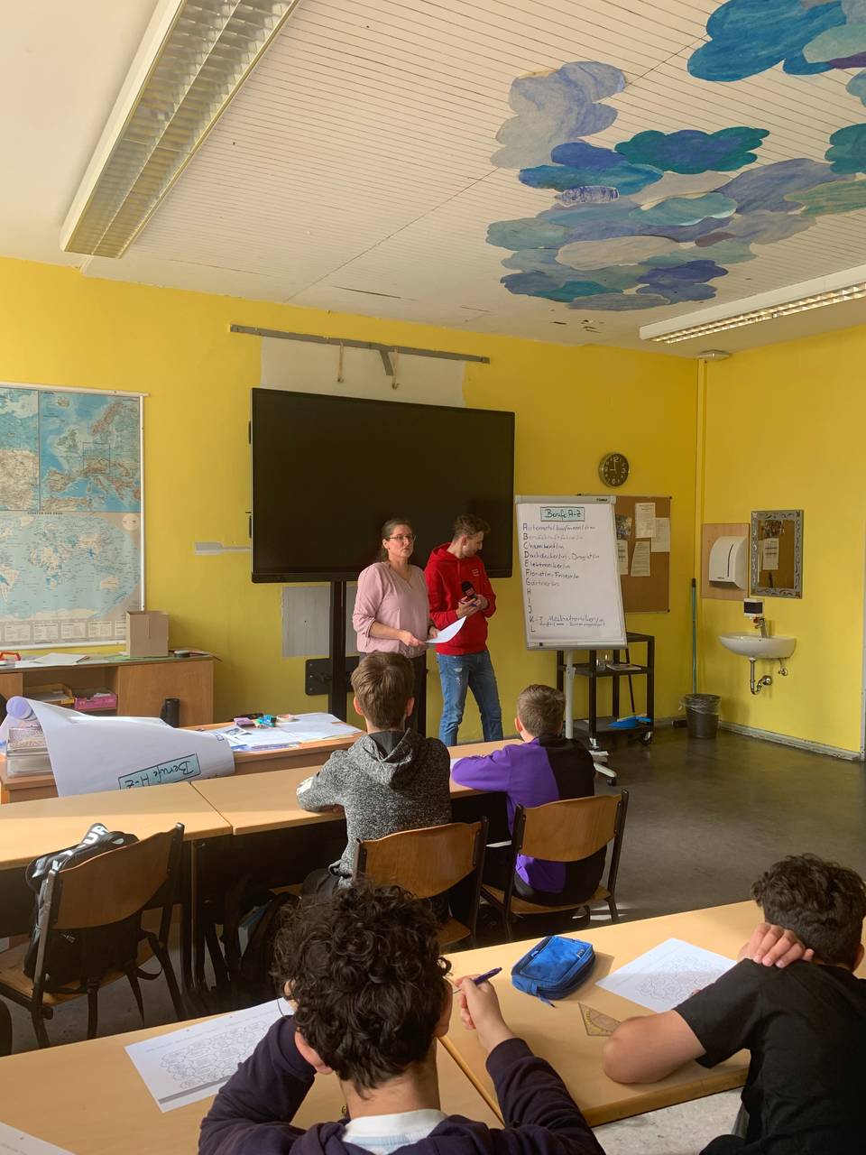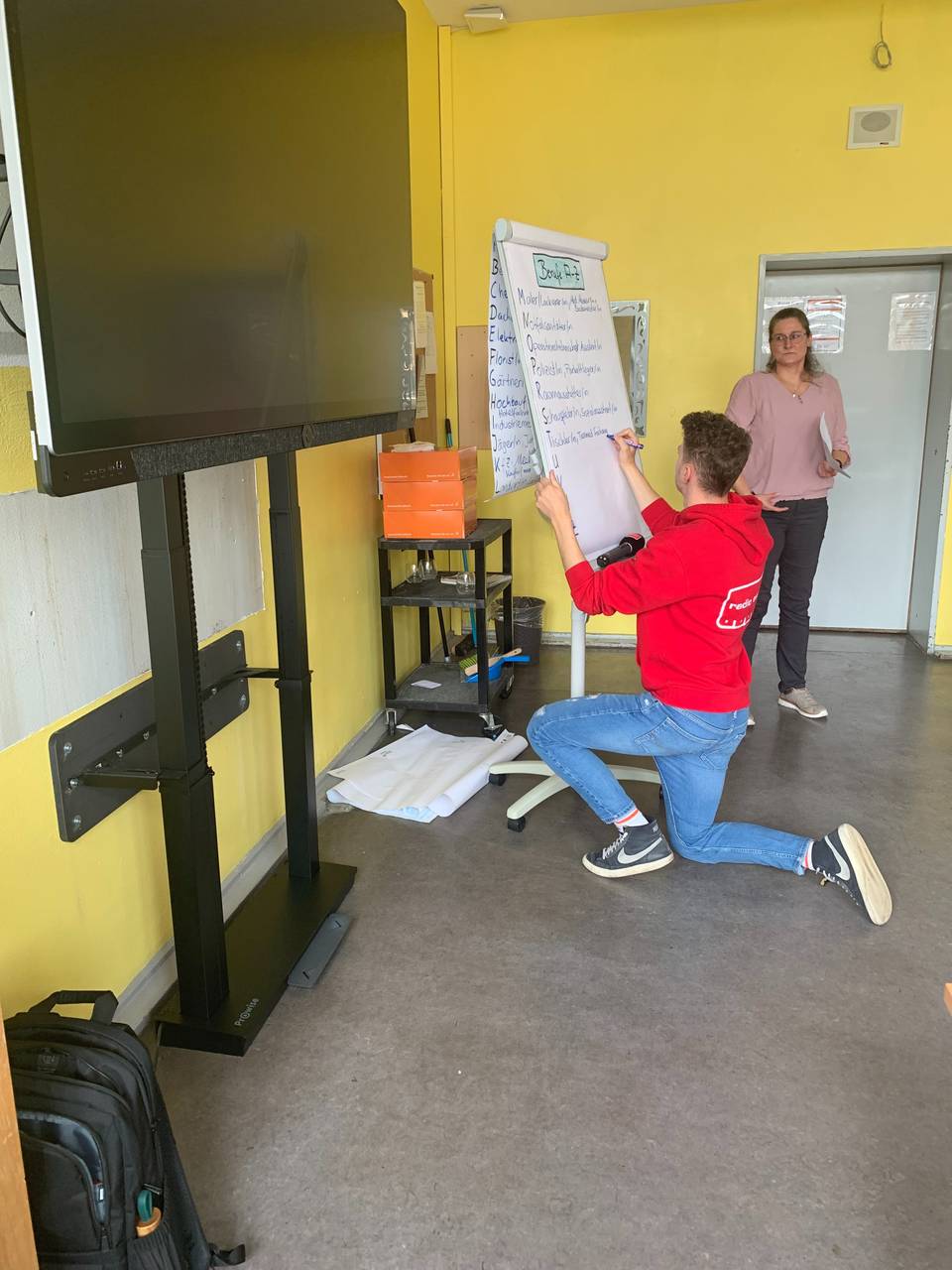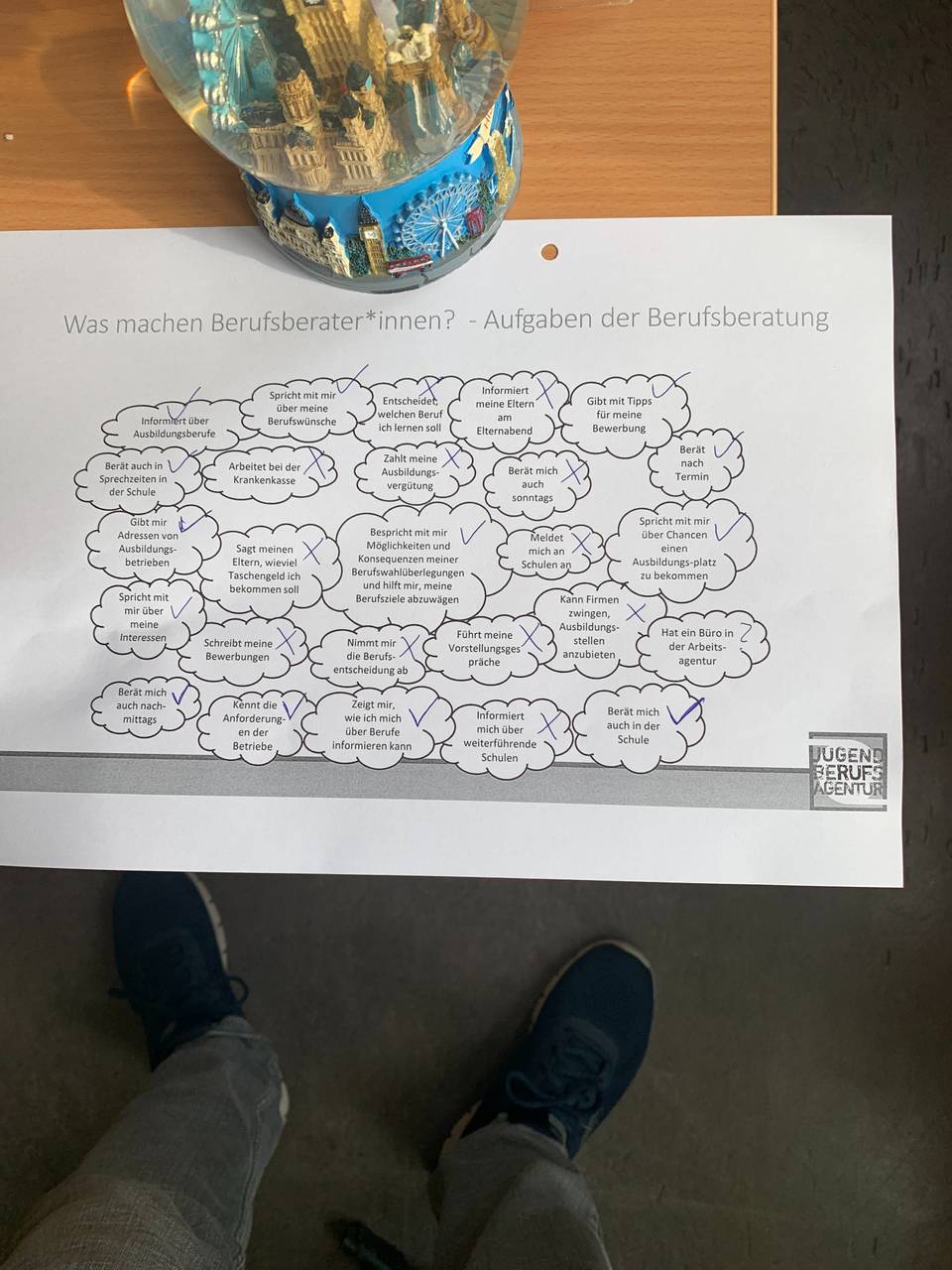 Stephanie hat Joshi morgens um kurz vor acht vor der Schule begrüßt. Jeden Donnerstag ist sie an der Schule in Steele, um Jugendlichen bei Fragen zu Berufen, Vorstellungsgesprächen, Bewerbungen und vielem mehr zu helfen. Der Tag startete morgens in der Klasse 8d. Hier hat Stephanie die Schüler erst gefragt, was denn Berufsberater machen. Auch Joshi durfte hier mitraten und das kam dabei raus: Eine Berufsberaterin kann zum Beispiel auch beim Elternsprechtag dabei sein und - ganz wichtig: Sie gibt den Jugendlichen nicht eine verbindliche Beratung, sondern eine "Idee", was sie nach der Schule machen könnten. Nachdem Stephanie die Fragen aufgelöst hatte, stand Berufe raten auf der Tagesordnung: Hier sollten die Jugendlichen Ausbildungsberufe mit allen möglichen Anfangsbuchstaben finden. Das war bei einigen Buchstaben ganz schön schwierig. Trotzdem gibt es in Deutschland über 300 anerkannte Ausbildungsberufe. Joshi hat die richtigen Vorschläge der Jugendlichen auf ein Flip-Chart geschrieben - und wurde am Ende sogar für seine schöne Handschrift gelobt.