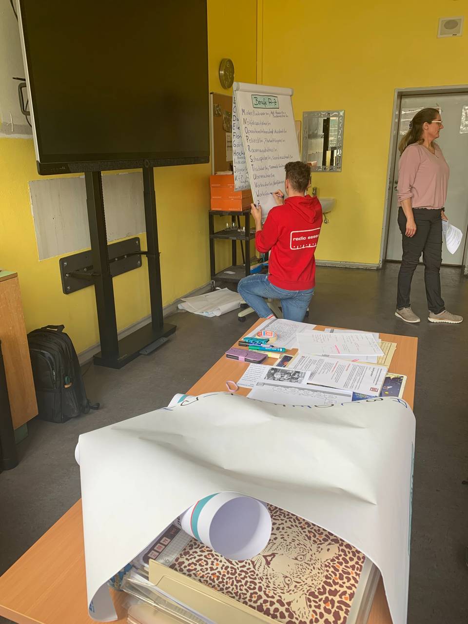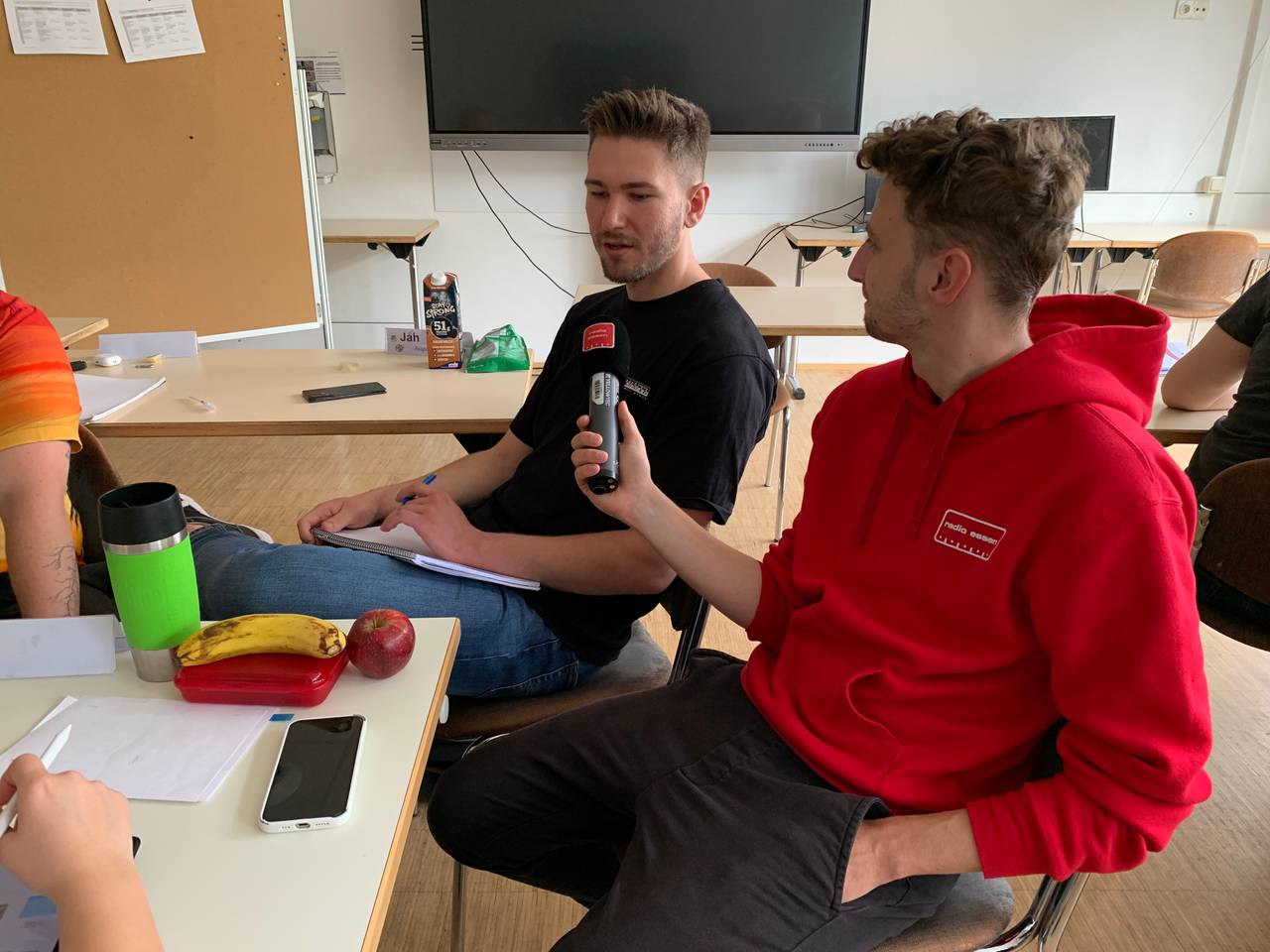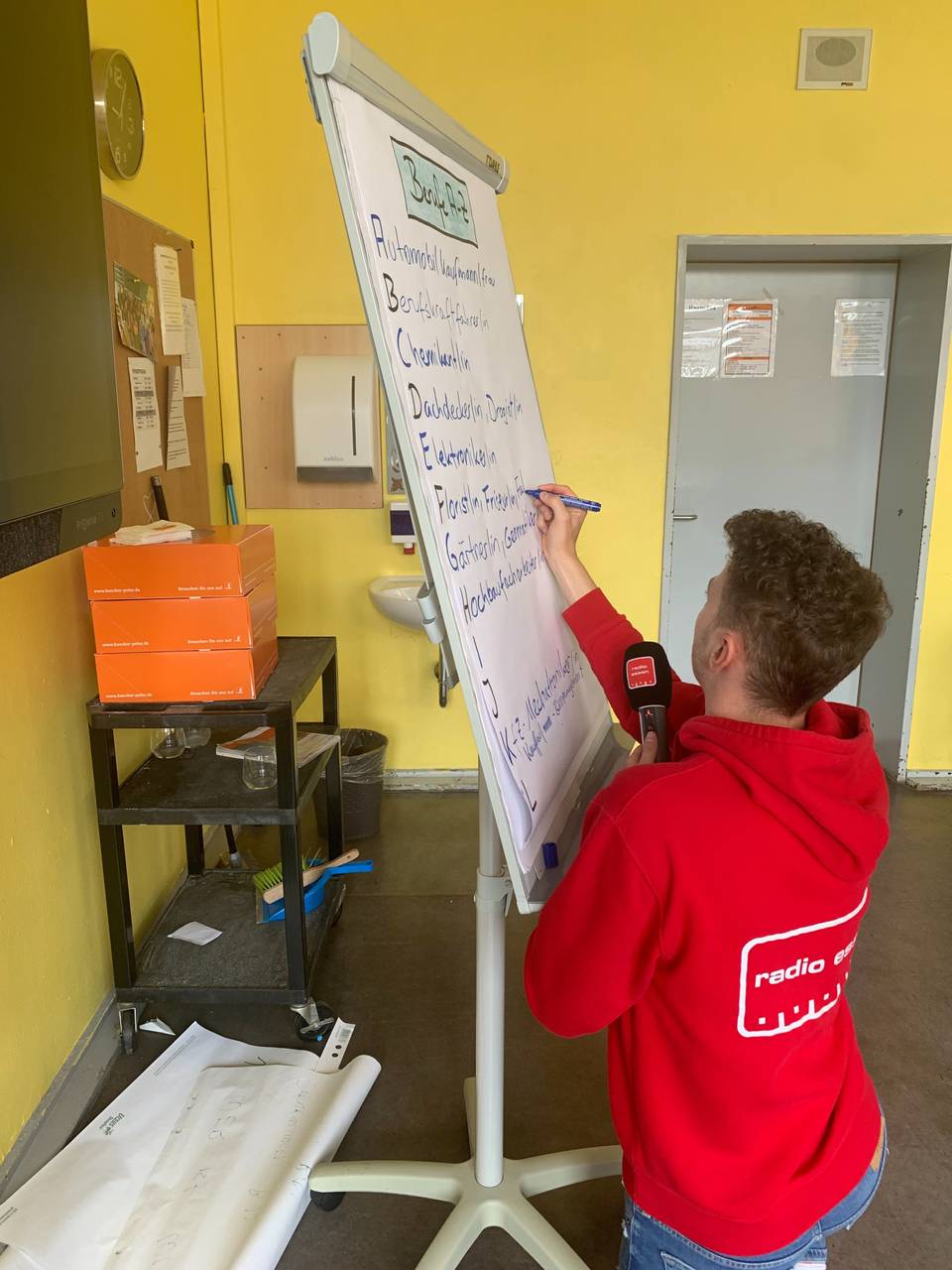 Dieses Mal musste Joshi sein Outfit nicht wechseln und konnte entspannt im roten Radio Essen-Pullover bleiben: Dieses Mal ging es mit dem Frühschicht-Praktikum zur Helene-Lange-Realschule nach Steele. Joshi war aber kein Lehrer für einen Tag, sondern Berufsberater. Stephanie Geldmacher von der Agentur für Arbeit hat ihn mit den Jugendlichen über Ausbildungsberufe sprechen lassen.
