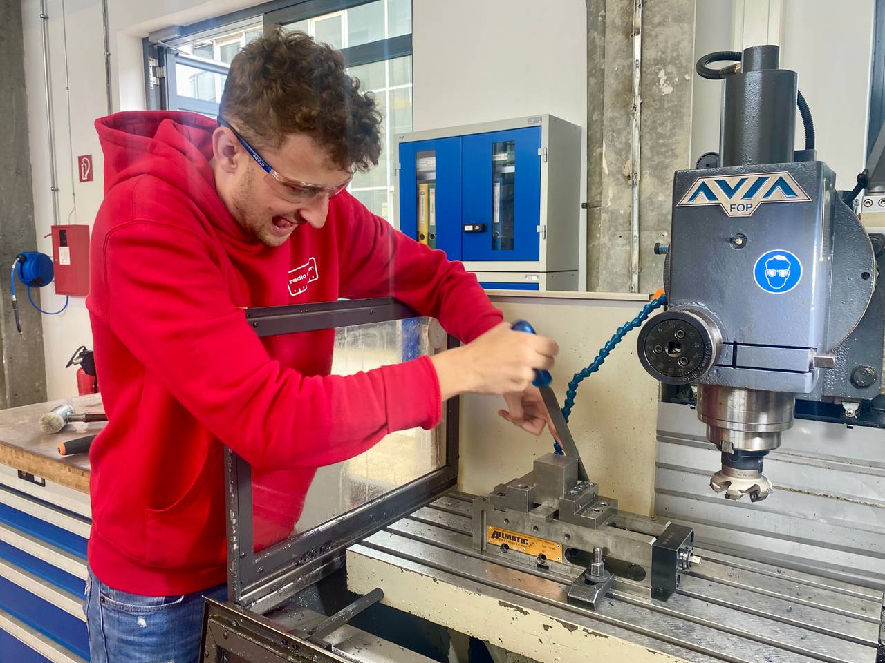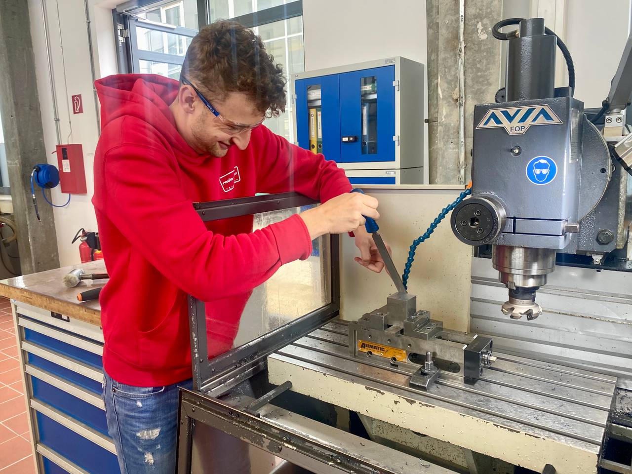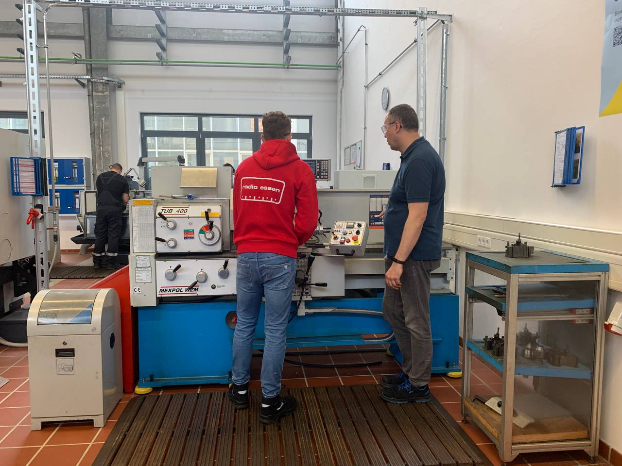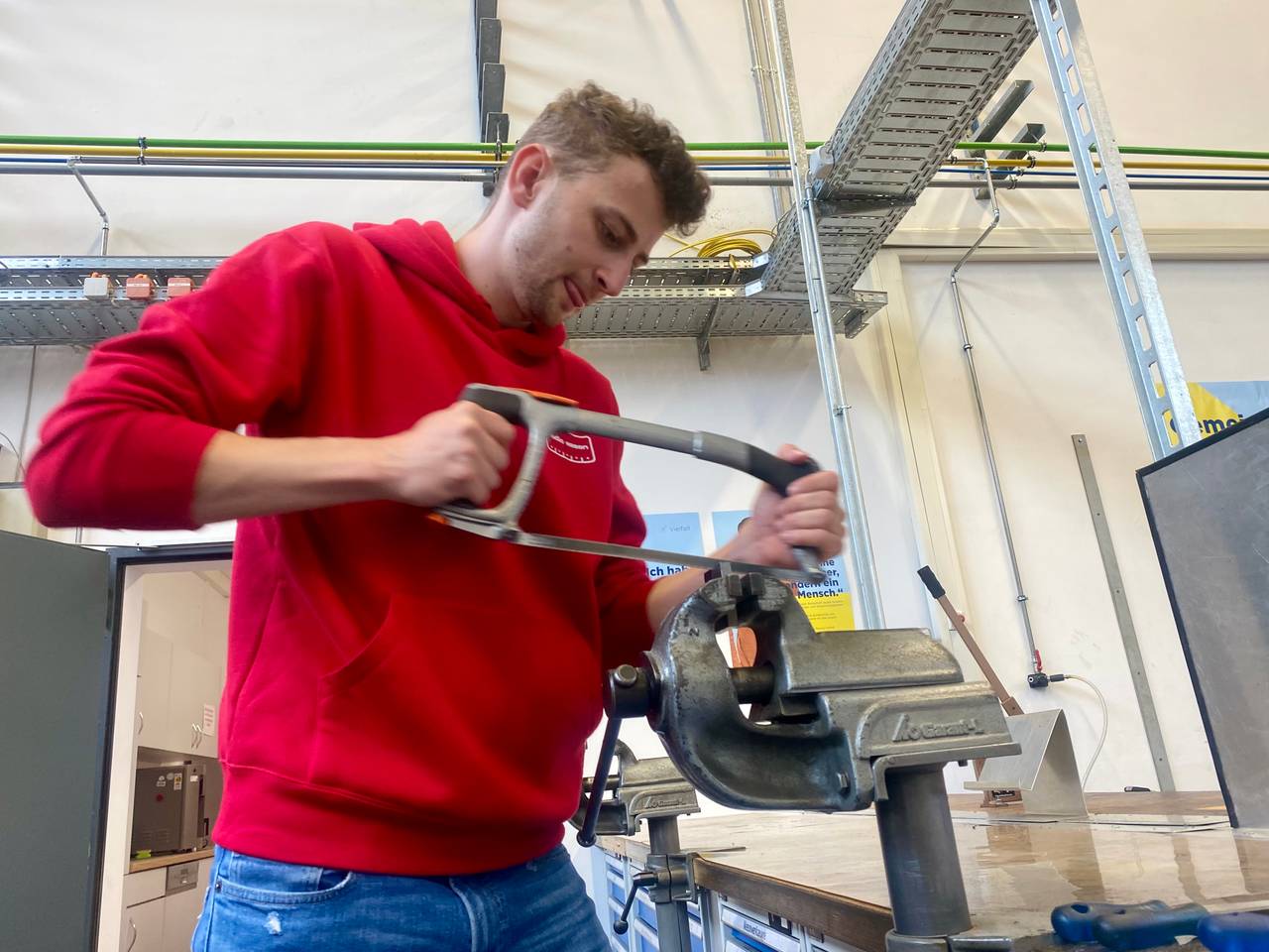 Anstrengend war vor allem das Sägen durch Stahl, das hat Joshi viel Schweiß gekostet. Aber das ist die Grundlage, um später die Maschinen bedienen zu können, sagt Dirk. Also musste Joshi körperlich ordentlich schuften, später aber auch das Köpfchen anschmeißen. Denn an der Maschine geht es auch um Mathematik und logisches Denken. Ob unser Moderator das hinbekommt?