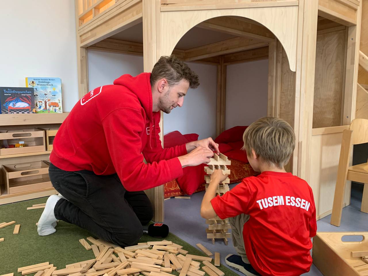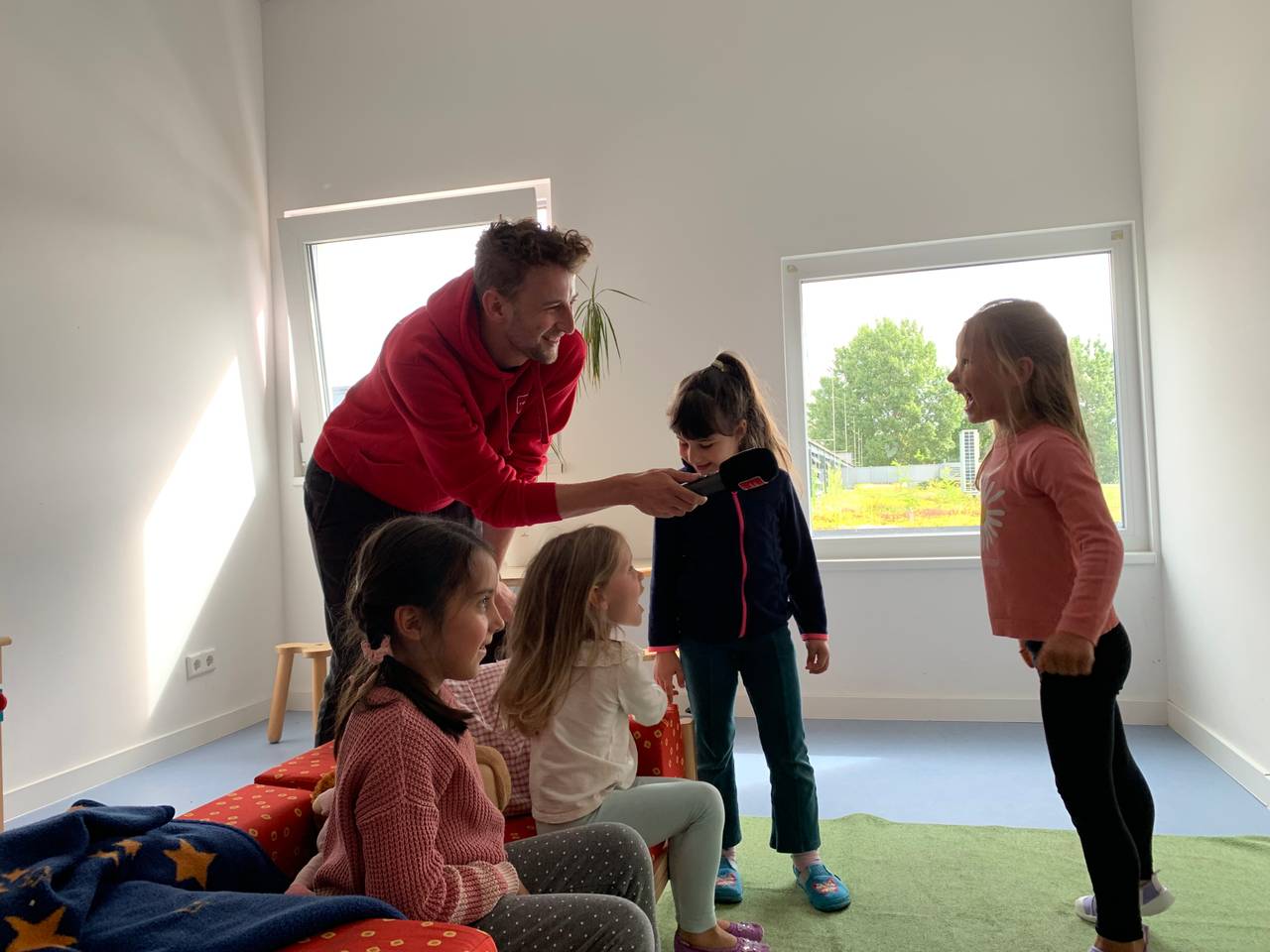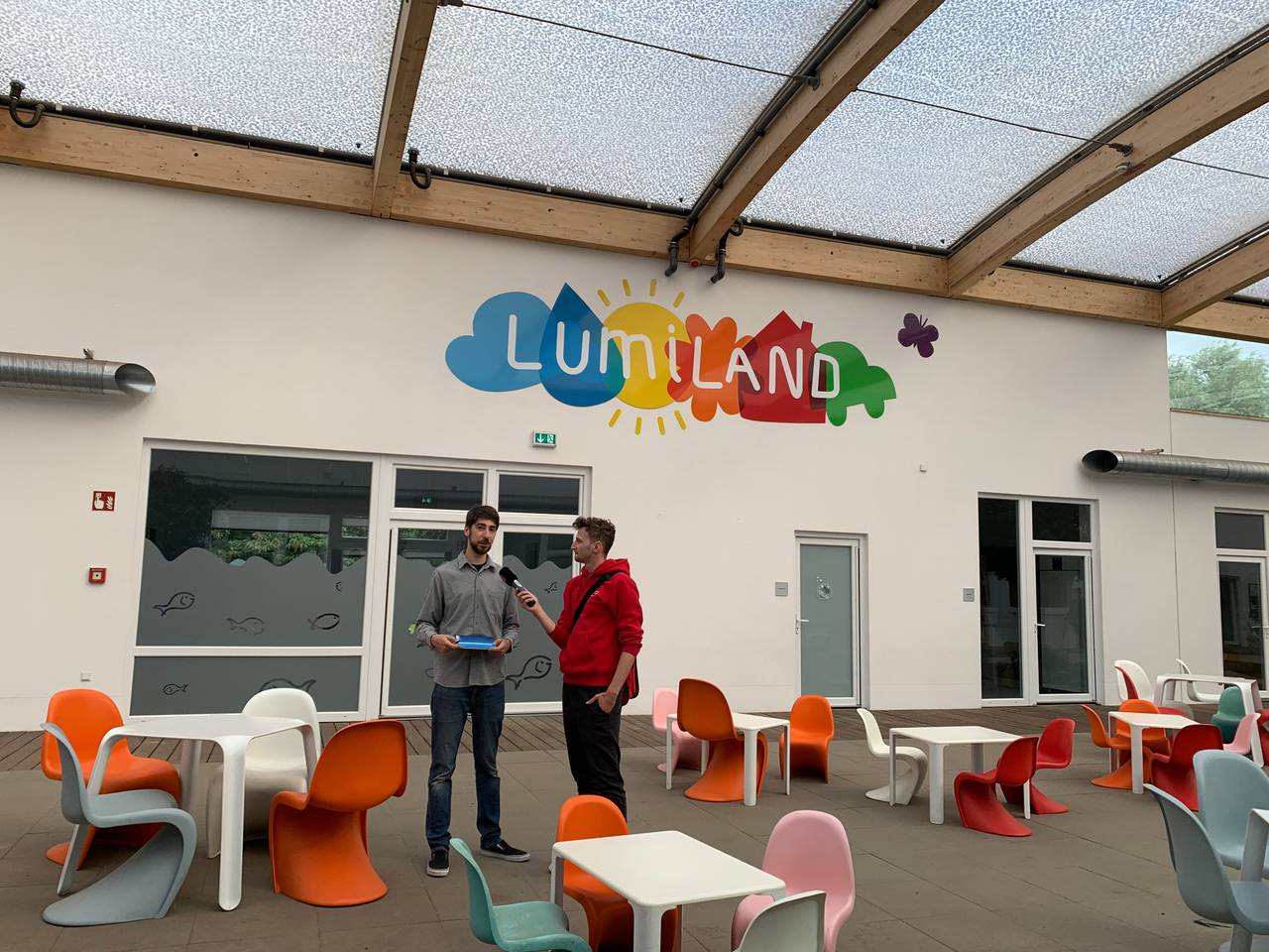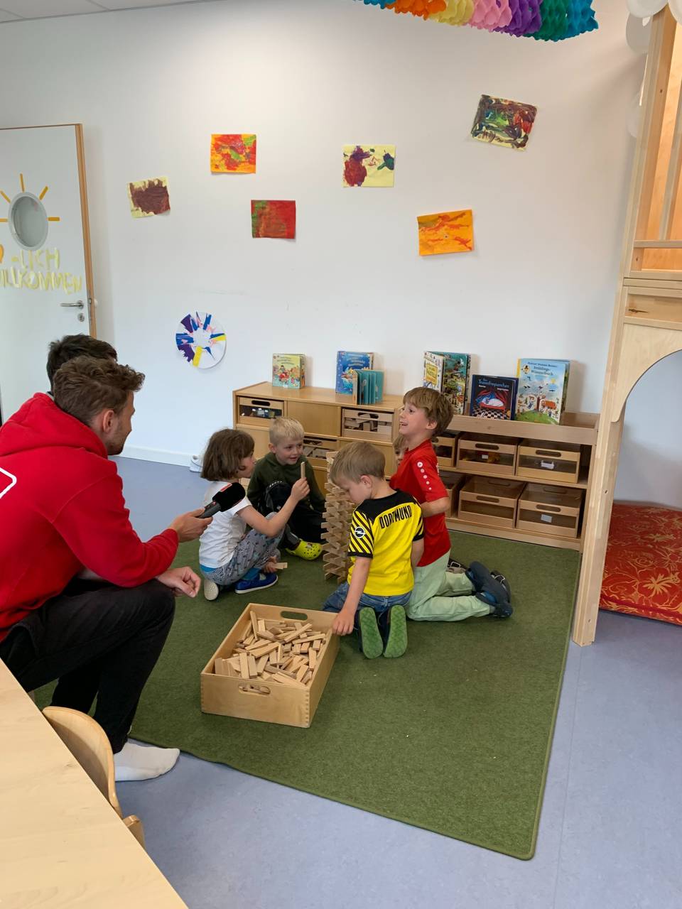 Die Kita Lumiland liegt direkt am RWE Campus im Essener Nordviertel. Das Gebäude gibt es seit 10 Jahren und wurde seitdem auch erweitert. Um 9 Uhr wurde Joshi von Robin Blackie empfangen. Joshi und Robin kannten sich schon durch das Finale von Essens bester Stimme. Nach der warmen Begrüßung wurde Joshi durch das Gebäude geführt und erklärt was seine Aufgaben sein werden. Und dann hieß es: Die Kinder aus ihren Gruppen abholen und in den Beruf einzutauchen!