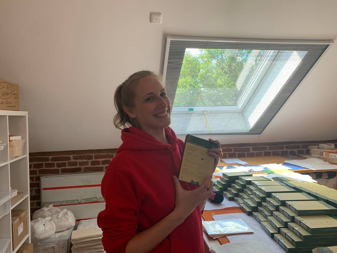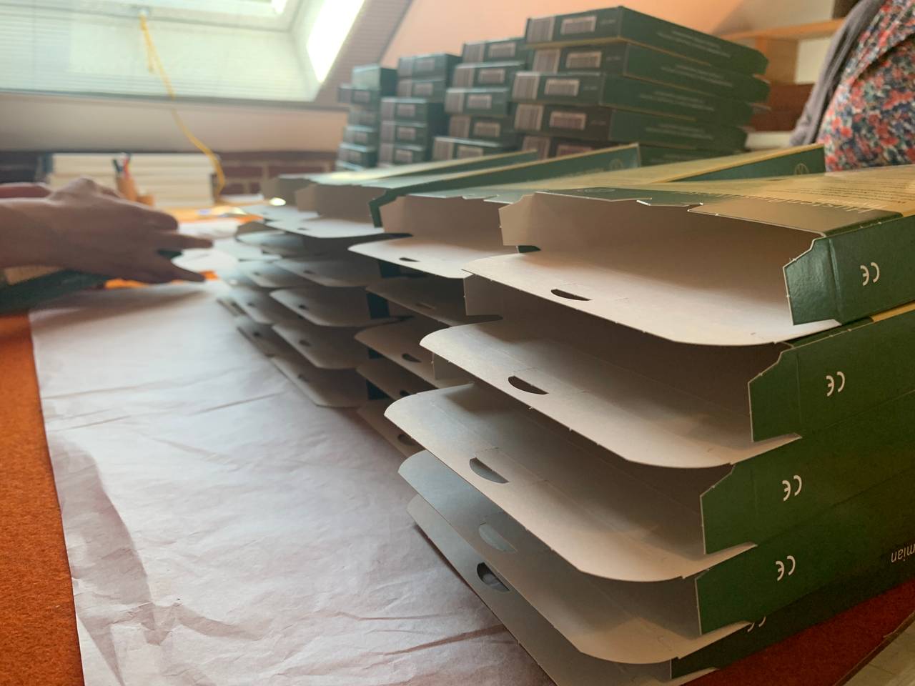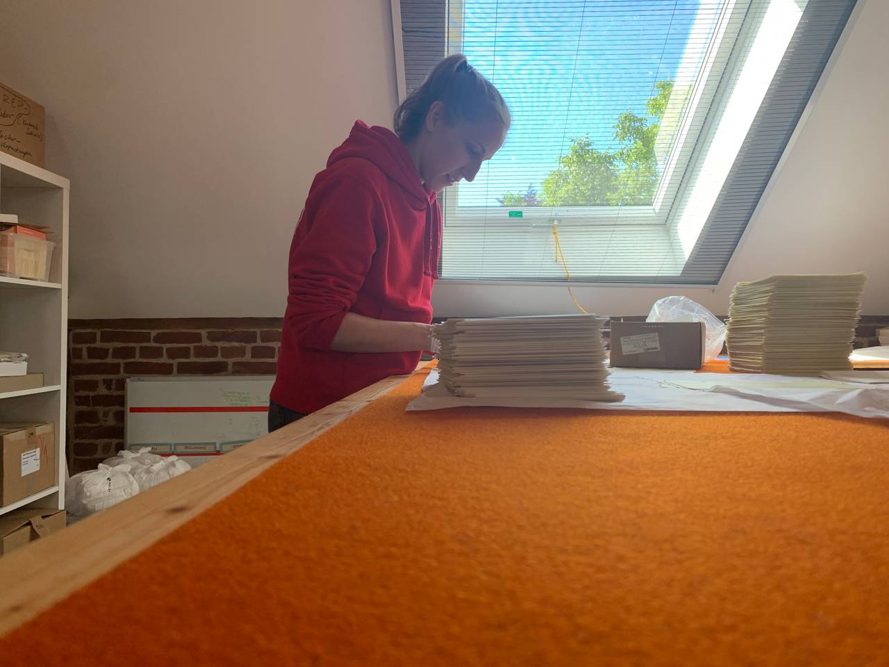 Mittlerweile gibt es das WACHSWERK in Schuir mit mehreren Mitarbeitenden, die helfen, die Wickel zu produzieren und zu verpacken. Da hat Larissa Schmitz bei ihrem Frühschicht-Praktikum mit anpacken dürfen. Sie hat Mitarbeiter Giovanni geholfen, die Wickel zu tränken und grob zurecht zu schneiden und dann Mitarbeiterin Hannah beim Verpacken unter die Arme gegriffen. Die Thymian-Wickel gegen Husten mussten verpackt werden. An die 500 bis 1000 Stück. Larissa hat vielleicht ein Drittel geschafft. In der gleichen Zeit hat Hannah mit ihren geübten Griffen den Rest erledigt. Na ja… wie heißt es im WACHSWERK: Es geht nicht unbedingt um Schnelligkeit, sondern mehr um Sorgfalt. Und damit hat sich Larissa sehr viel Mühe gegeben.