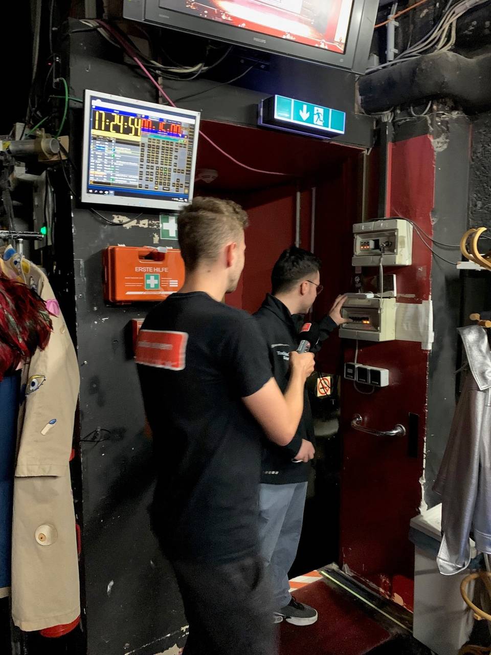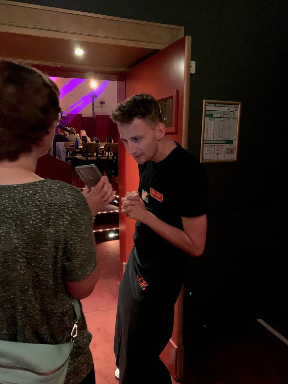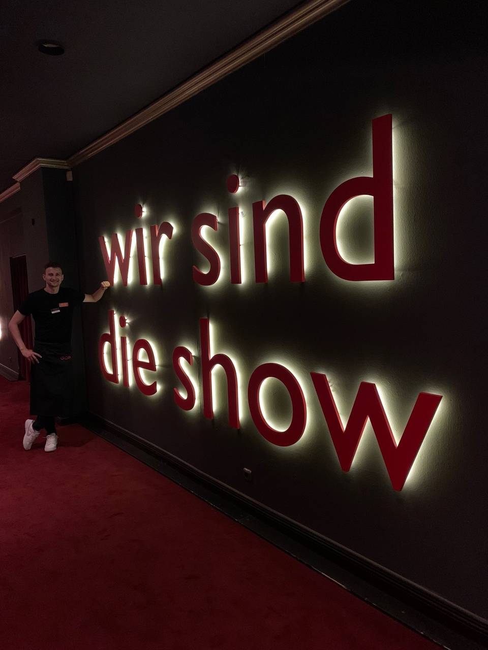 Jetzt musste Joshi aber schnell zurück zu Mikael – denn es gab noch eine Überraschung: Über einen Seitenbeamer wurde vor der Show ein kleiner Gruß für ihm im Saal gezeigt! Als nächstes durfte er in der Küche zuschauen – da geht es ganz schon wuselig zu. Der nächste Job für ihn war der Einlass: Hier sollte er den Gästen ihre Tische zeigen. Nachdem er sich das System einmal gemerkt hatte, war das auch kein Problem mehr für ihn. Serviceleiter René war insgesamt sehr zufrieden. Jetzt aber schnell nochmal zu Mikael: Die Show begann nämlich – und Joshi durfte den Technikern am Anfang etwas zuschauen.