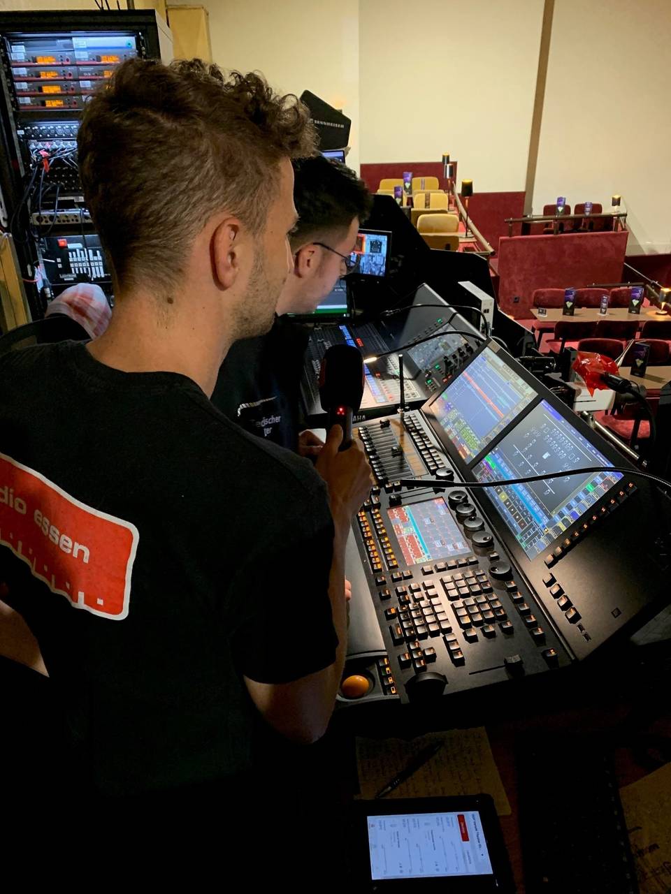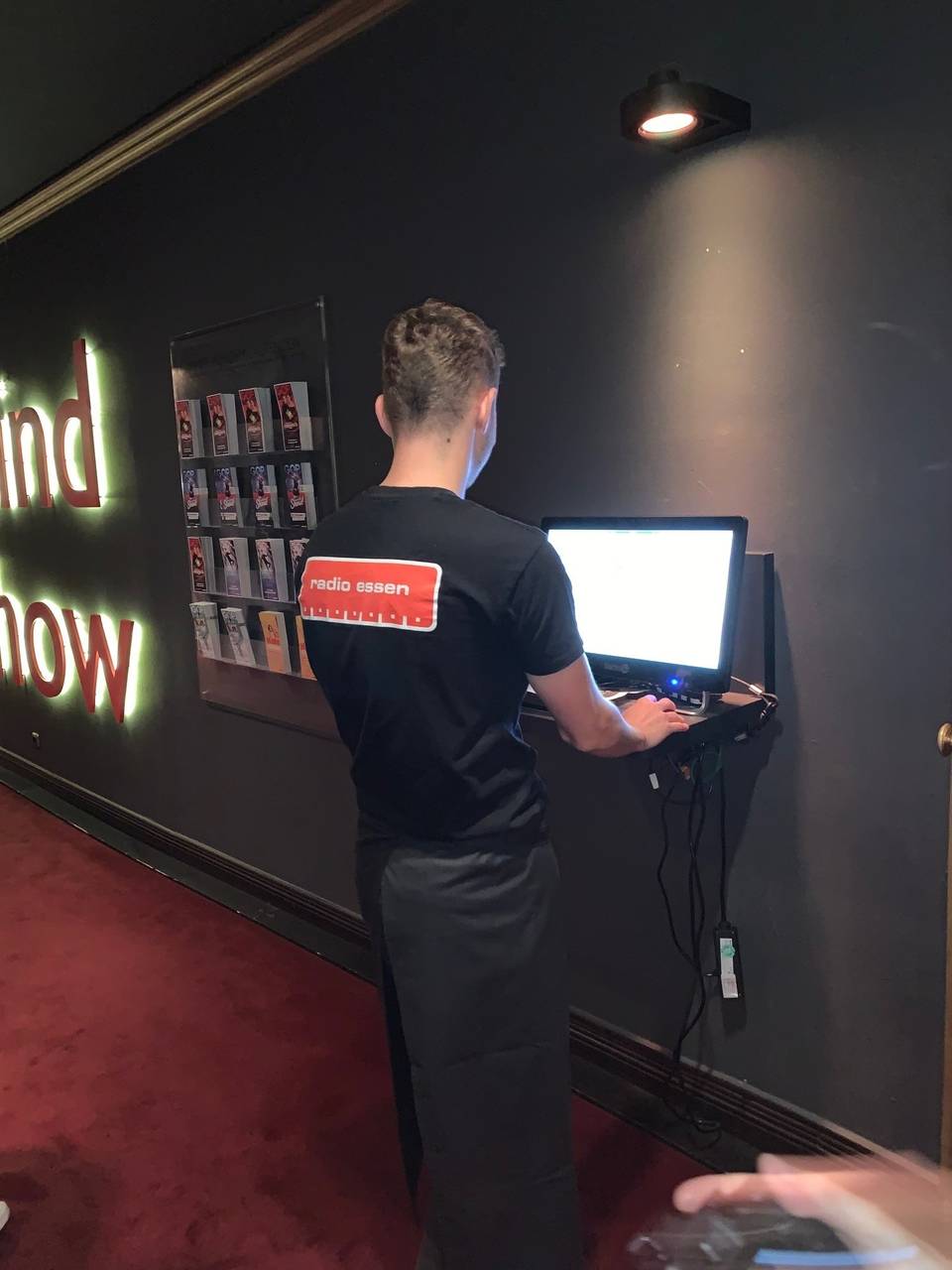 Beim nächsten Radio Essen-Frühschicht-Praktikum stand für Moderator Joshua Windelschmidt ganz schön viel auf dem Programm: Technik, Gastro, Einlass und: Bühne fegen. Das GOP bietet ein Rundum-Paket für einen Abend: Also Theater, Abendessen und eine Bar. Aber von vorne: Los ging es für Joshi um 17 Uhr: Noch waren keine Besucher da. Er wurde von Sabine in Empfang genommen, sie ist die Verantwortliche für Öffentlichkeitsarbeit im GOP. Erstmal ging es an der Bar vorbei in Richtung Bühne. Dort wartete schon Mikael auf ihn, er ist der technische Leiter. Mikael hat ihm die Technik gezeigt – schon wurde Joshi klar, dass er in diesem Praktikum sehr viele Schritte machen wird. Denn: Die Technik wird von ganz hinten gesteuert. Also erstmal ein paar Treppen hoch! Das Mischpult für den Ton sieht sogar ähnlich aus wie im Radio Essen-Studio, Joshi hat sich also direkt heimisch gefühlt. Nachdem er ein bisschen ausprobiert hat, gab es von Mikael eine Aufgabe: Beleuchtung überprüfen und Bühne fegen. Dafür kam Ulli zur Hilfe – so wird der Besen für die Bühne genannt. Als Joshi mit dem Fegen fertig war, ging es an die Bar. Die ersten Gäste waren inzwischen da, deshalb durfte Joshi ein bisschen Kellner spielen: Bier, Softgetränke und andere Drinks waren schnell bei den Gästen. Und: er hat nichts verschüttet. Beim nächsten Programmpunkt hat ihm die Erfahrung aus seinem Praktikum im Getränkemarkt geholfen: Jetzt hieß es nämlich: Leergut wegbringen!