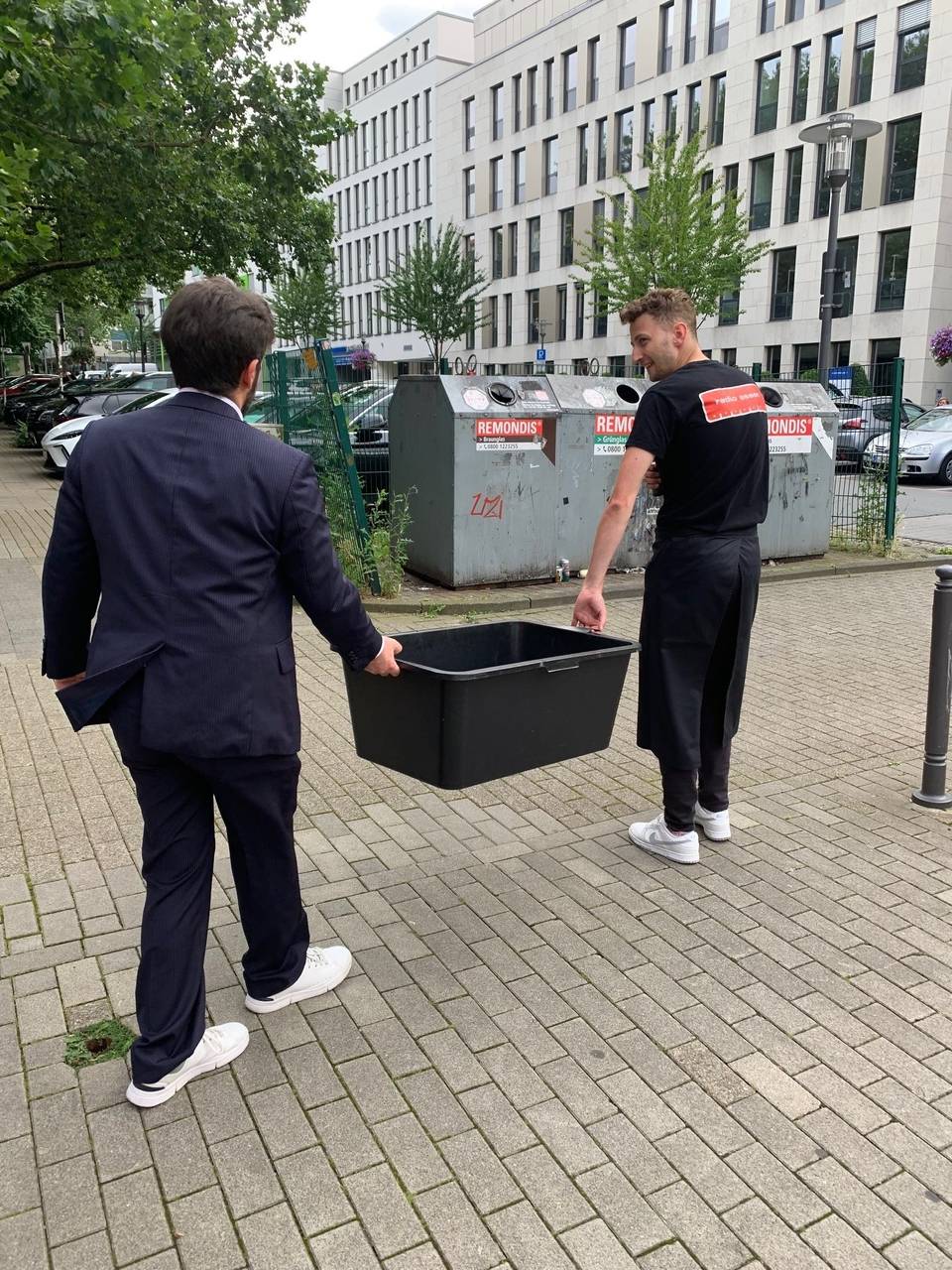 Beim ersten gemeinsamen Praktikum von Larissa und Joshi geht es an die Bierkästen. Allerdings erstmal an die Leeren. Beim Trinkgut Kronen in Horst starten die beiden an der Pfandannahme. Gar nicht so einfach offenbar. Wie viel Pfand hat ein leerer Kasten? Wie viel Pfand eine Bierflasche? Wo ist der Unterschied zwischen Einweg- und PET-Flaschen? Mit all diesen Fragen beschäftigt sich Larissa, schließlich scheitert Joshi schon bei den einfachsten Kopfrechen-Aufgaben. Nach einer Weile geht es aber schnell. Joshi sagt den leeren 12er-Wasserkasten an, Larissa tippt 3,30 Euro Pfand in die Kasse. Erste Kritik gibt es an Joshis Geschwindigkeit.