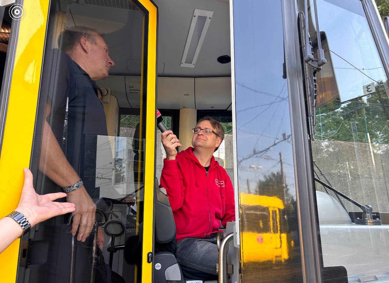 Dann ging es auch schon los! An Bord der Linie 107 verließen Christian und Sven den Betriebshof in Richtung Am Freistein. Schnell fällt auf, Sven ignoriert rote Ampeln. Er erklärt Christian, dass die Straßenbahnen eigene Signale haben, sie also nicht auf die normalen Ampeln achten. Auf der Strecke erzählt Sven auch, dass an allen Endhaltestellen der Bahn eine Fahrertoilette steht. Trotzdem habe er nach all den Jahren eine "Blase aus Stahl“. Besonders wichtig ist es Sven, klarzustellen, dass die Fahrer für Verspätungen nichts können. Es sind oftmals äußere Einflüsse, die die Fahrer nicht verhindern können. An jeder Endhaltestelle gehen die Fahrer immer einmal durch die Bahn, um nach Fundsachen oder Müll zu gucken. Er lacht, als er erzählt, was er schon so alles gefunden hat – vom Fixerbesteck bis zum kompletten Wocheneinkauf.
