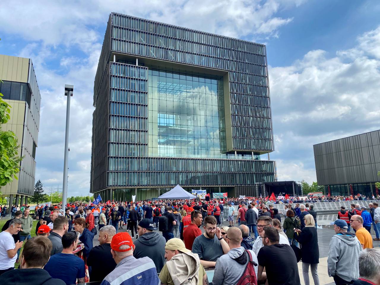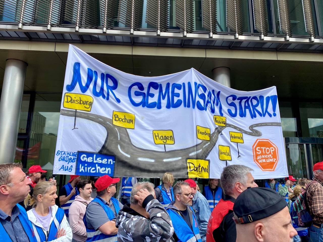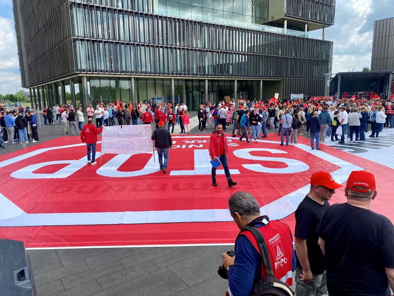 In Essen war am Donnerstag (23. Mai) Aufsichtsratssitzung bei der thyssenkrupp AG im Westviertel. Da sollten weitere Entscheidungen fallen, wie es mit dem Konzern weitergeht. Schon vor Wochen hat Konzernchef Miguel López Einschnitte in der Stahlproduktion angekündigt. Was das aber genau für die Beschäftigten bedeutet, darüber gab es keine genauen Aussagen. Die Stahlkocher sind deshalb sauer und sind auf die Straße gegangen. 5000 Beschäftige von thyssenkrupp versammelten sich am Vormittag vor der Zentrale. Die Gewerkschaft IG Metall hatte zum Protest aufgerufen. Am Vormittag hat sich auch der Konzernchef den Beschäftigten gestellt und erklärt, was sie von ihm erwarten können. Die Kundgebung ging von 11 bis 13 Uhr. Das die Bilder von der thyssenkrupp-Demo.