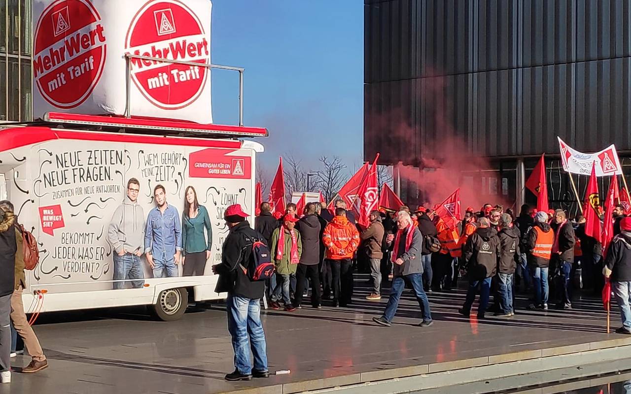Seit Dienstag demonstrieren in Mitarbeiter von ThyssenKrupp für ihre Arbeitsplätze. Am Mittwoch gehen die Mitarbeiter der Aufzugssparte auf die Straße. Vor der Zentrale im Westviertel fordern sie Klarheit über die Zukunft ihrer Arbeitsplätze. Die IG Metall wirft dem Konzern eine Hinhaltetaktik vor. Es müsse dringend ein Zukunftskonzept her.