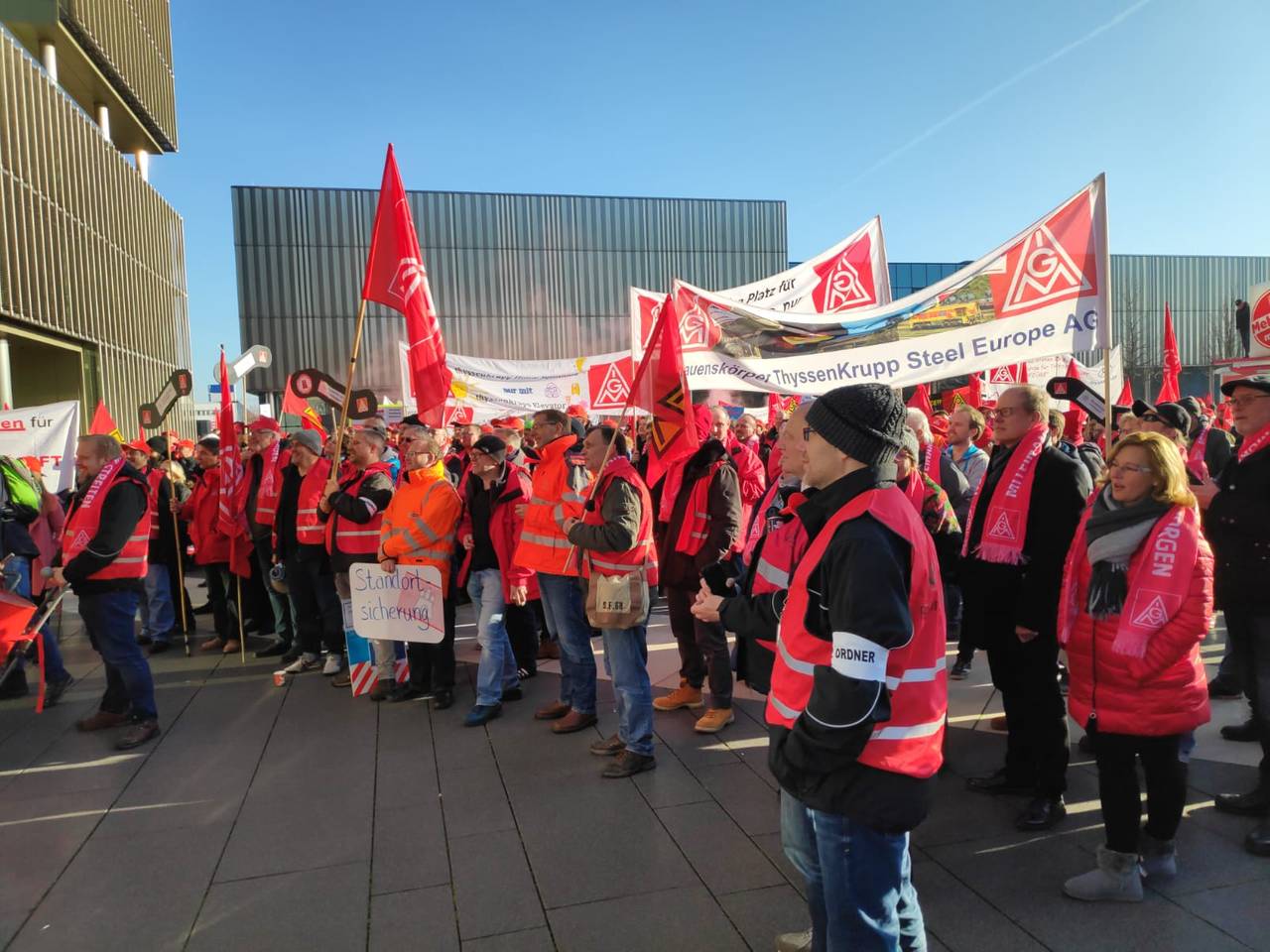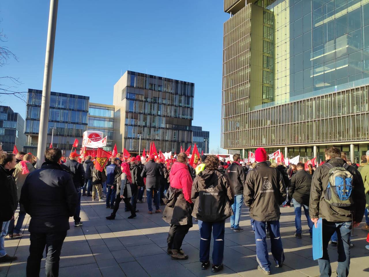 ThyssenKrupp will insgesamt 6.000 Stellen streichen. Der Konzern erhofft sich aus der Aufzugssparte Geld zu gewinnen, damit der Konzern umgebaut werden kann. Heute erwartet die Gewerkschaft IG Metall rund 2000 Mitarbeiter vor der Konzernzentrale im Westviertel. Sie kommen unter anderem aus Neuenhaus, Hamburg und Berlin. Sie alle fordern Klarheit über ihre Arbeitsverträge. Im Moment sprechen Konzern und Gewerkschaft über einen Zukunftstarifvertrag.
