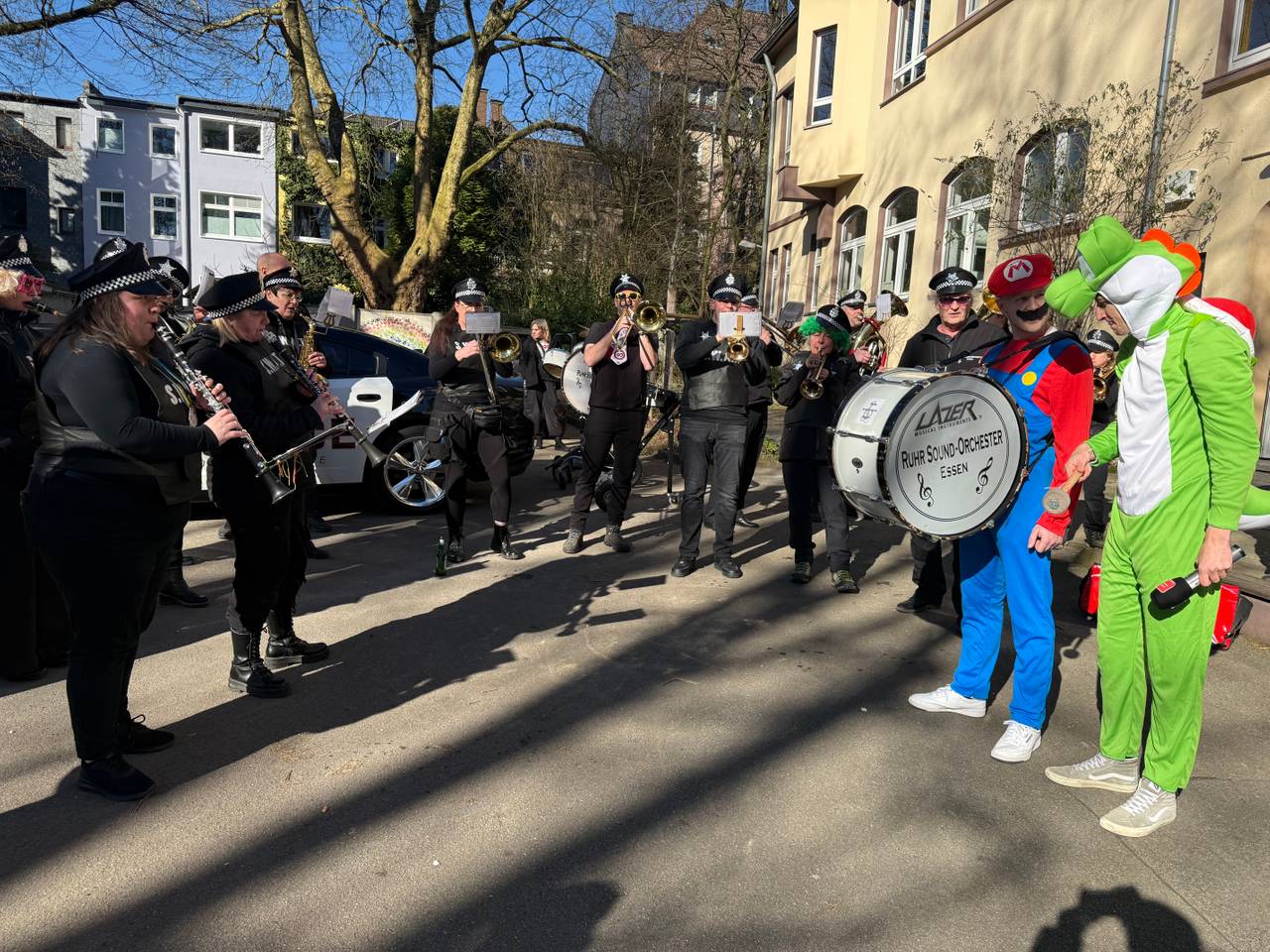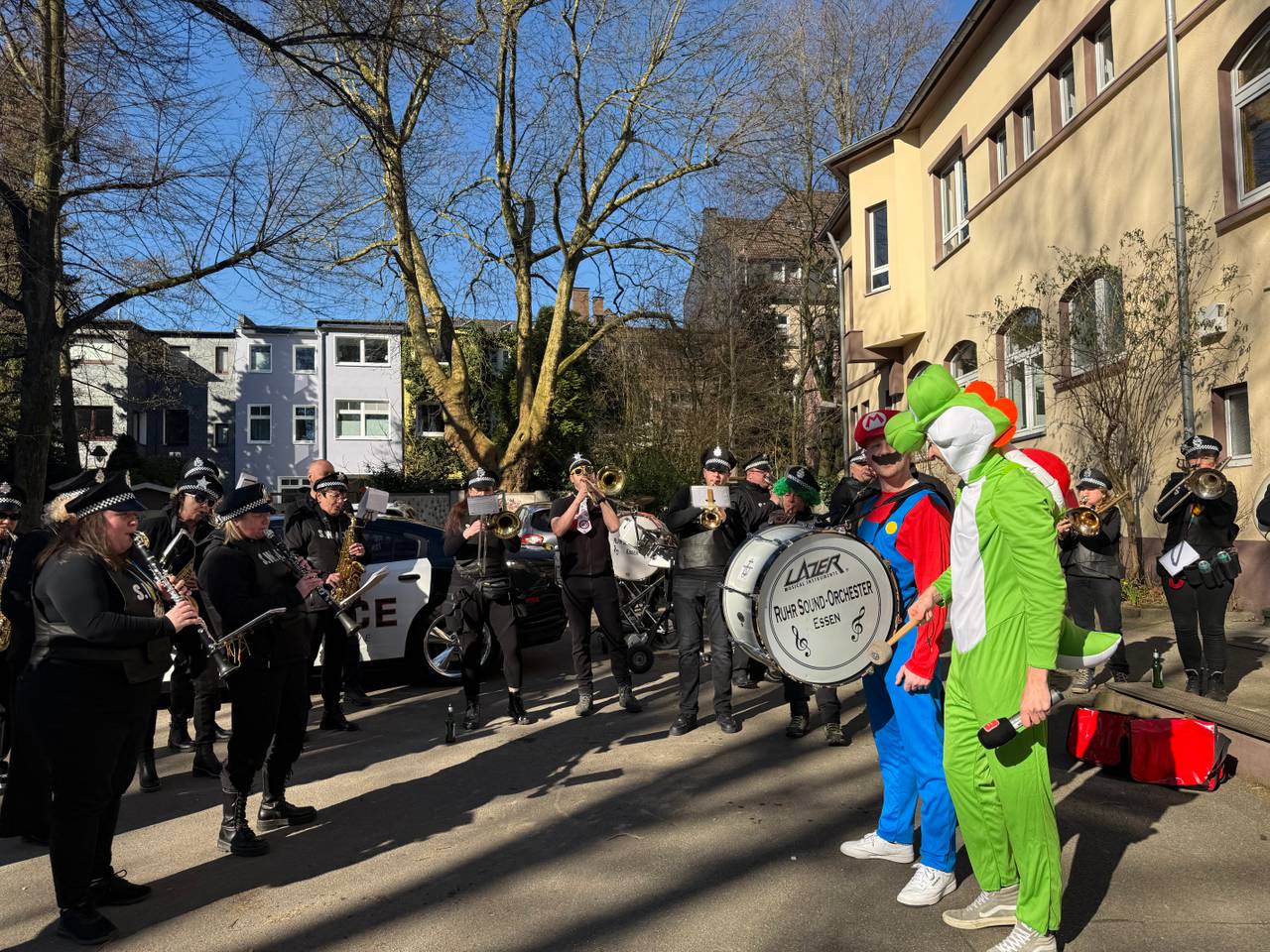 Der erste Halt unseres Kamelle-Expresses war in Überruhr. Bei Tagesmutter Nadine haben wir zwei kleine Piraten, ein Einhorn und eine Cheerleaderin besucht und Kamelle vorbeigebracht. Die kleine Karnevalsparty begann mit einem Frühstück und viel Karnevalsmusik. Für die Kleinen ist der große Rosenmontagszug noch zu groß. Anders sieht es für das Ruhr Sound Orchester aus. Das darf in diesem Jahr sogar den großen Zug in Rüttenscheid als vorderstes Blas-Orchester anführen! Eine besondere Ehre und deswegen musste vorher noch ausreichend gefrühstückt werden. Das war unsere zweite Station.