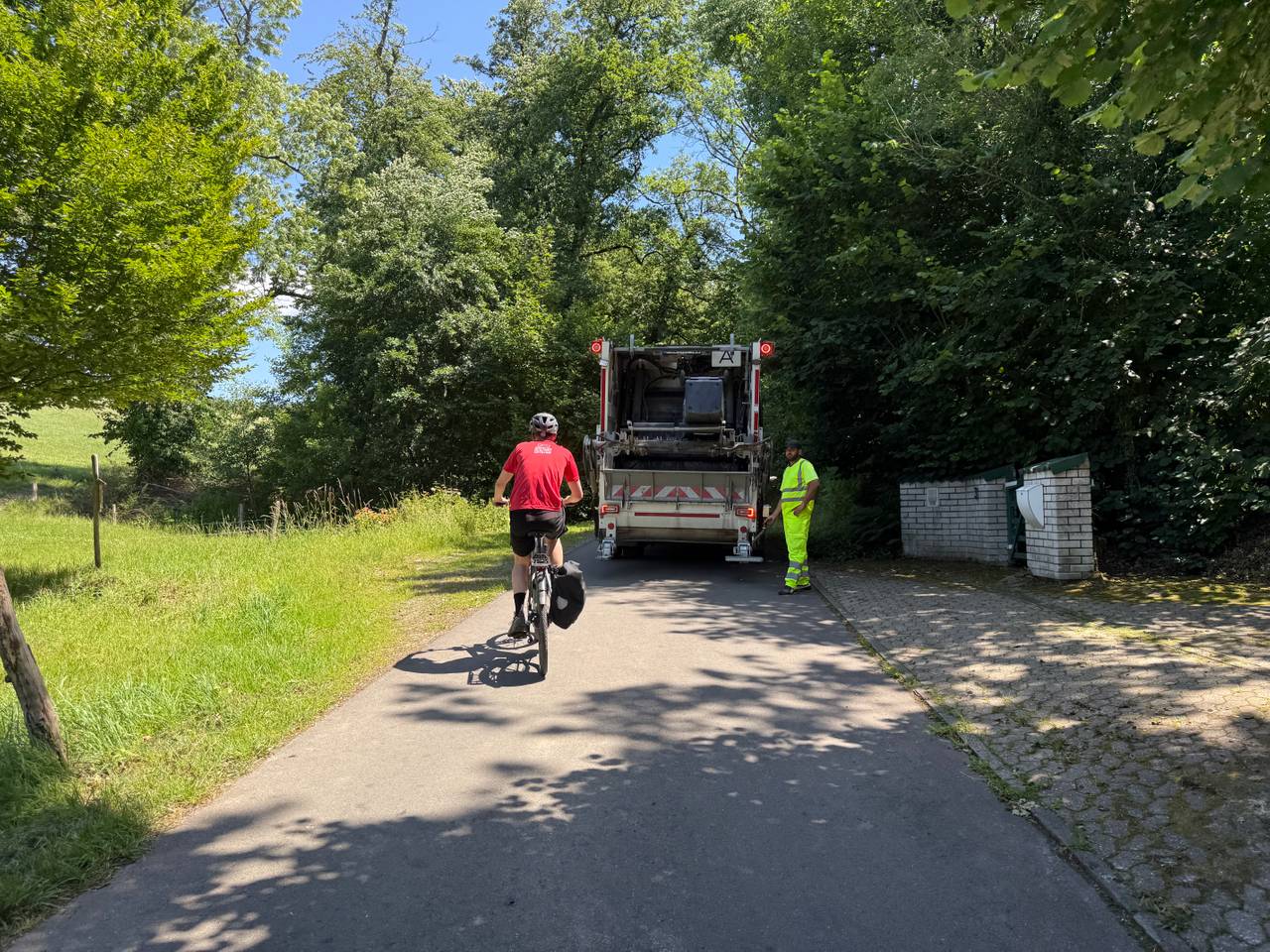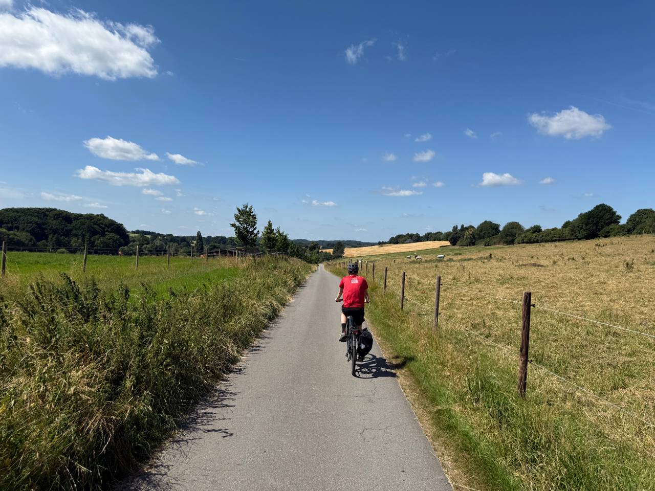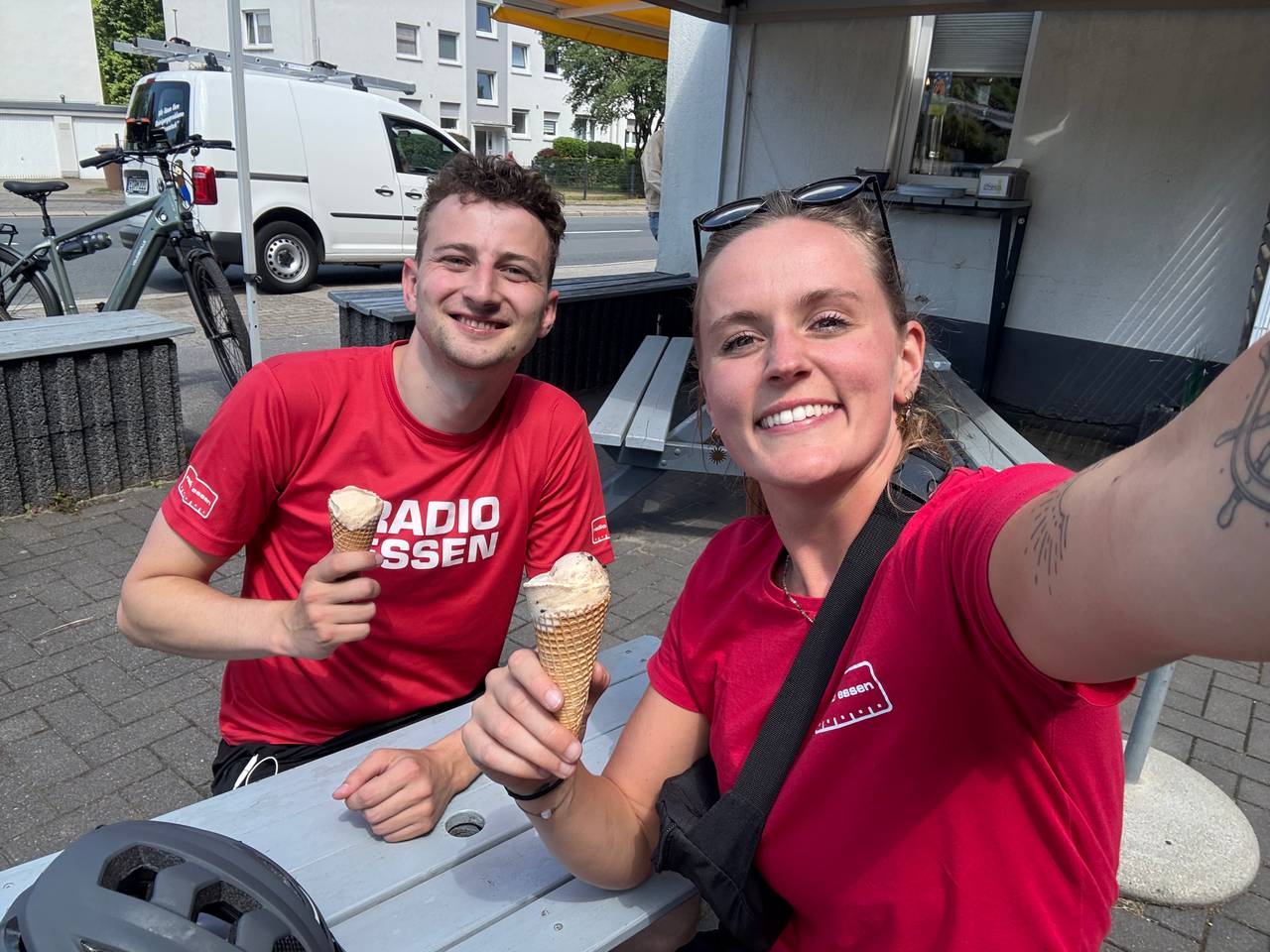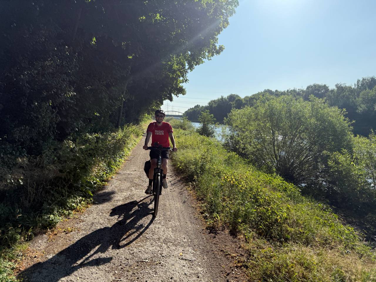 Los ging es in Karnap auf "Halde 19". Nur rund 10 Kilometer nach dem Start gab es den ersten Rückschlag. Begleiterin Julia Crüsemann hatte einen Platten. Was nun? Im Radio haben wir durchgegeben, dass wir eine Fahrradpumpe benötigen. Nur eine Viertelstunde später waren Pia, Michael und Marcus vor Ort in Dellwig und haben geholfen. Ein tolles Gefühl und wir konnten die Route fortsetzen. Die erste größere Pause gab es dann in Haarzopf, nach rund 27 Kilometern und 90 Minuten Fahrzeit. Von dort aus führte der Weg vorbei am Flughafen Essen-Mülheim, über weite Felder, bis nach Ickten. Dort verfuhr sich Joshua zum ersten Mal und musste sich über einen Trampelpfad hinunter zur Ruhr kämpfen. In Kettwig angekommen, gönnten sich Joshua und Julia erstmal ein Eis.