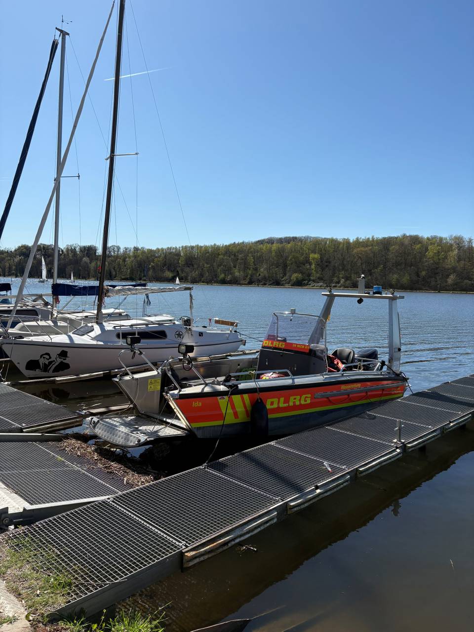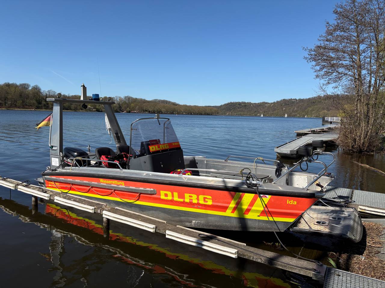 In Essen sind rund 80 Ehrenamtliche regelmäßig auf der Ruhr und auf dem Baldeneysee im Einsatz. Von März bis Dezember sind sie bei allen Regatten immer dabei. Rund 150 gekenterte Seglerinnen und Segler ziehen sie pro Saison aus dem See. Meist geht die Sache gut aus und es niemand zu Schaden gekommen. Sogar die Boote bleiben heil, wenn alles gut läuft. Die Segelvereine tragen in der Saison fast an jedem Wochenende eine Regatta aus. Da ist also immer viel zu tun. Dazu kommen die Regatten der Ruderer, Kanuten und Kanupolo. Überall sind die Ehrenamtlichen der DLRG mit dabei und passen auf, dass nichts passiert. Wenn am Ufer jemand einen Unfall hat, vom Fahrrad stürzt oder einen anderen Notfall hat, auch dann kommen die Mitarbeiterinnen und Mitarbeiter der DLRG. Mit ihren Booten sind sie meist schneller vor Ort als die Rettungskräfte der Feuerwehr. Deshalb werden im Notfall auch direkt beide alarmiert. Die Ehrenamtlichen der DLRG sind medizinisch ausgebildet und können die ersten Minuten bis die Rettungskräfte kommen schon wertvolle Hilfe leisten. Das ist aber nicht das einzige, was die DLRG macht. Dazu kommen Schwimmkurse in zahlreichen Schwimmbädern der Stadt, erzählt der Chef der DLRG Andreas Wieser während er mit Radio Essen-Moderatorin Anna Bartl ein Stück über den See fährt.