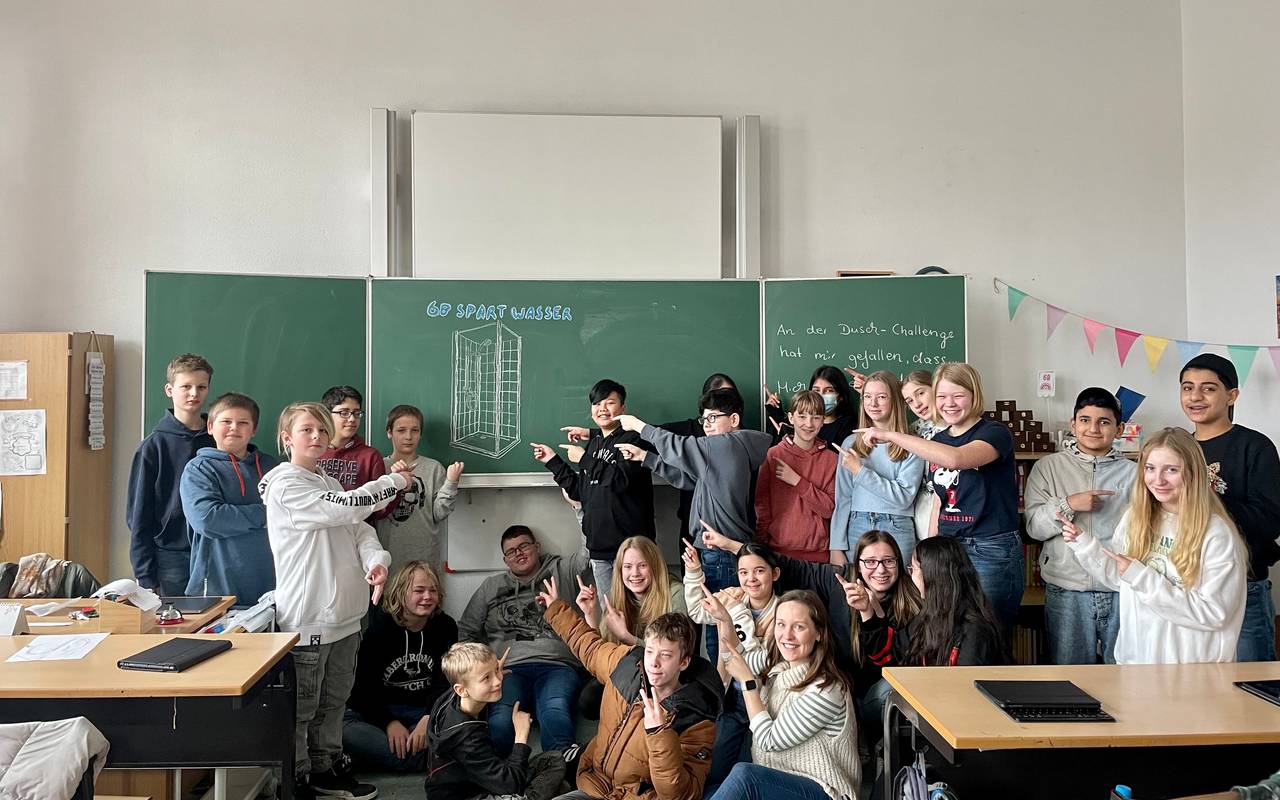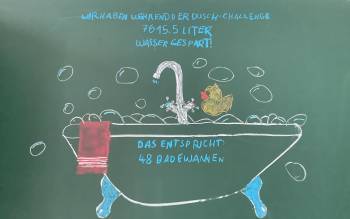 Als Sarah Jansen von der "Dusch-Challenge" gehört hat, war sie sofort begeistert. Als Lehrerin einer sechsten Klasse in Essen weiß sie, wie wichtig es ist, den bewussten Umgang mit Wasser im Unterricht zu thematisieren. Auch ihre Klasse, die 6b der Gesamtschule Holsterhausen, musste nicht lang überzeugt werden. Sofort wurde die Klasse kreativ und entwickelte Ideen, um besonders viel Wasser sparen zu können. Neben dem Duschtagebuch, erstellten die Schülerinnen und Schüler eine Duschplaylist mit Liedern, zu denen man besonders schnell duschen kann. Die Klasse drehte ein Video, malte Tafelbilder und lernte Aysha aus Äthiopien kennen, die über acht Stunden braucht, um 4 Liter Wasser zu holen. All ihre Ergebnisse hält die Klasse auf einer Art digitalen Pinnwand fest.