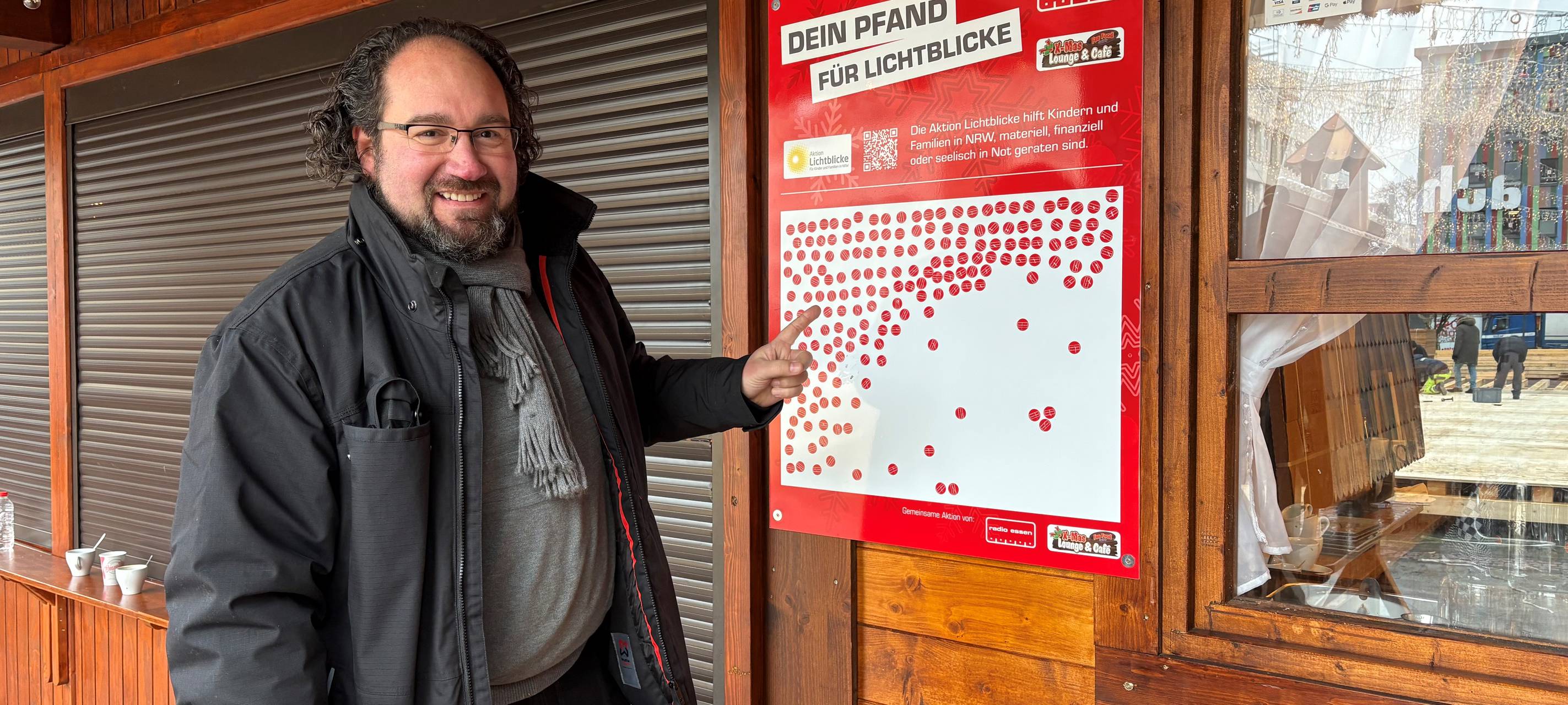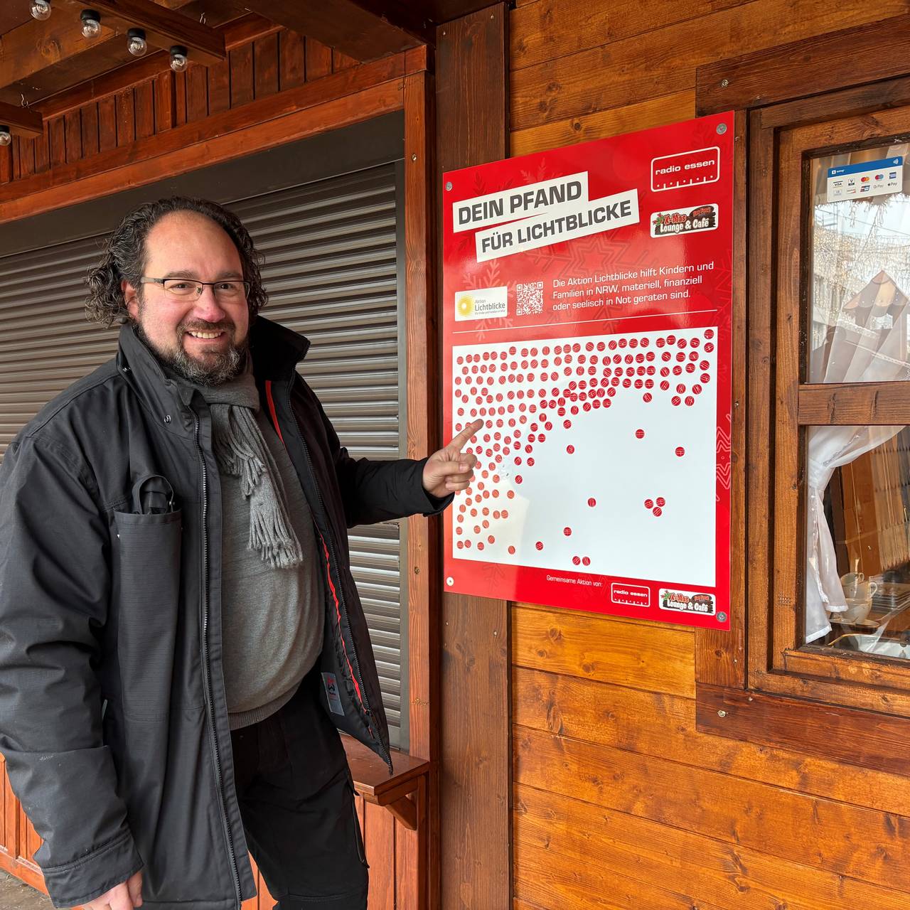 Neben der Eisbahn steht eine große Lounge, in der es Getränke und was zu Essen gibt. Schausteller Oliver Müller will auch in den nächsten Wochen so Spenden für die Aktion Lichtblicke sammeln mit der Aktion Pfand für die Wand. Bisher kamen so bereits 500 Euro zusammen.