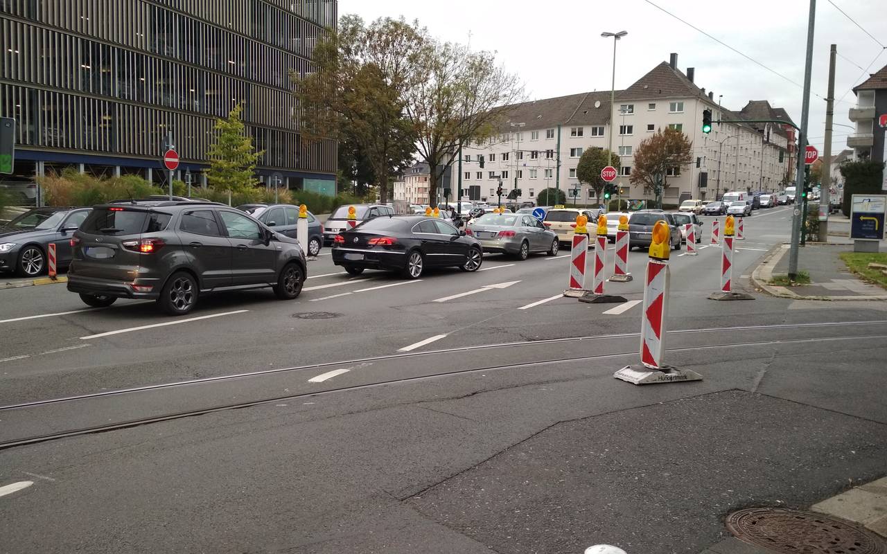 Auf der Kahrstraße und der Goethestraße, die parallel zur Hufelandstraße laufen, baut die Stadt gerade die neue Fahrradachse. Jetzt in den Sommerferien wird eine Ampelanlage an der Kreuzung Kahrstraße/Goethestraße zurück gebaut. Dann kommen dort Einbauten hin, damit Autofahrer nur noch langsam fahren können. Gleichzeitig werden die Markierungen für die neue Fahrradstraße aufgemalt. Die neue Fahrradachse soll dann das Fahren zwischen dem Südviertel und Frohnhausen für Fahrradfahrer sicherer machen. Außerdem saniert die Ruhrbahn gerade noch den Bahnsteig am Gemarkenplatz. Auch da gibt es Behinderungen und die U17 fährt aktuell nur mit einem Wagen.