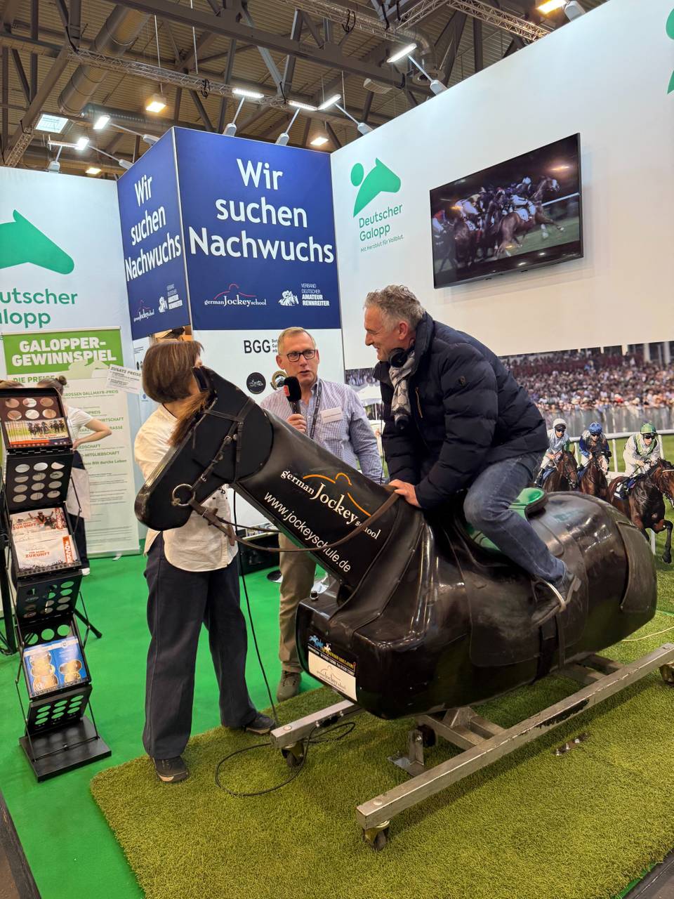 Ein großes Thema in diesem Jahr ist die Pferdegesundheit und das sanfte Training von Pferden. Ein besonderes Highlight ist der Jockey-Pferde-Simulator, den unsere Radio Essen-Stadtreporter getestet haben. Rennpferde sollten nur einmal in der Woche sehr schnell trainiert werden, aber Jockeys müssen regelmäßig üben. Der Simulator ist eine gute Möglichkeit, das Training zu machen, ohne echte Pferde zu belasten. Unsere Stadtreporterin erreichte dabei eine Geschwindigkeit von bis zu 50 km/h – und es geht noch schneller.
