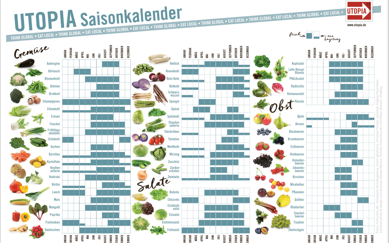 Einen guten Überblick darüber, wann welches Obst und Gemüse reif ist, bietet zum Beispiel der Saisonkalender von Utopia.