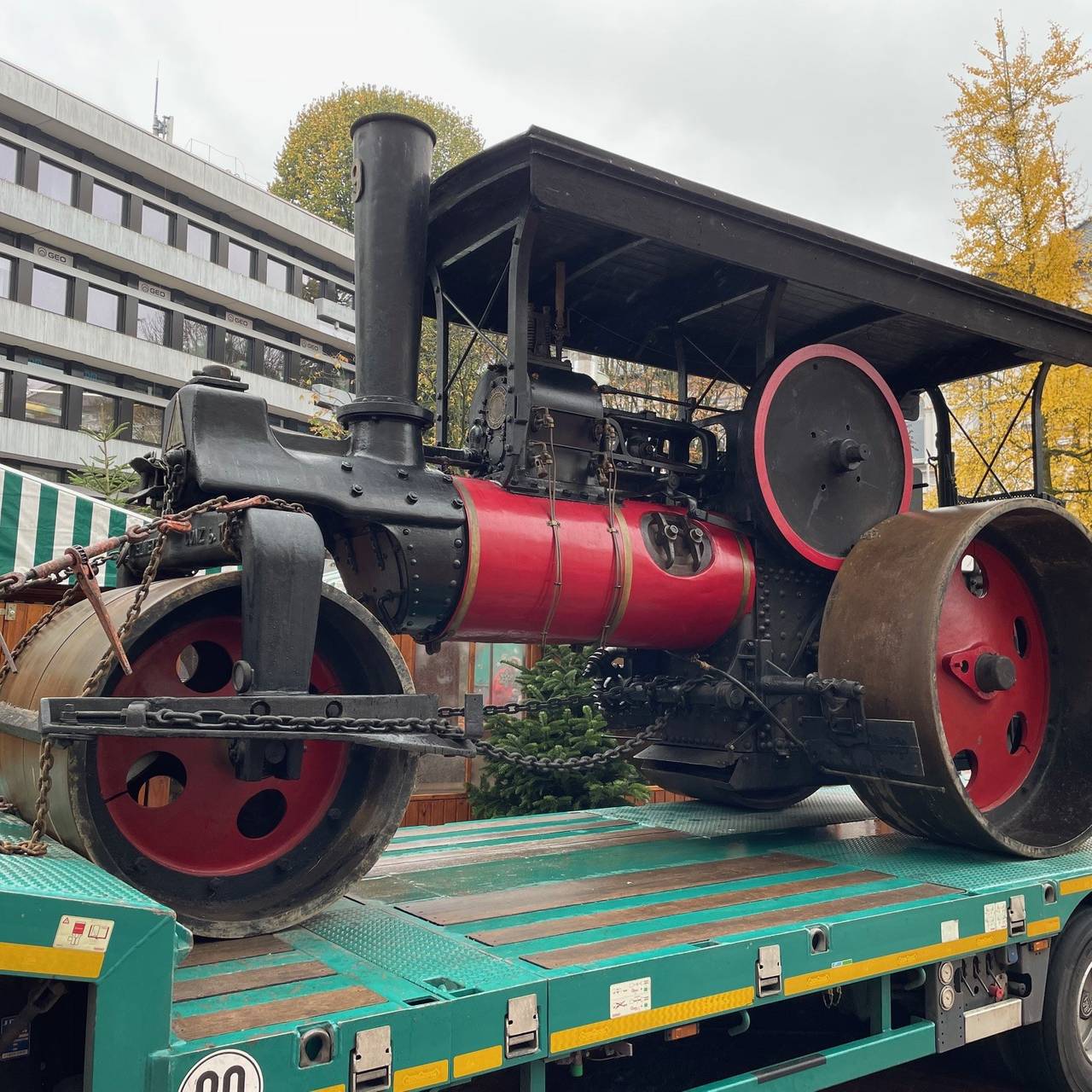 Im Eisenbahndorf des Steeler Weihnachtsmarktes rollen am Dienstag (29. Oktober) zwei historische Lokomobile. Es sind Vorläufer der historischen Dampfloks und sie fahren ohne Schienen. Ein Problem gab es aber beim Abladen der tonnenschweren Maschinen.