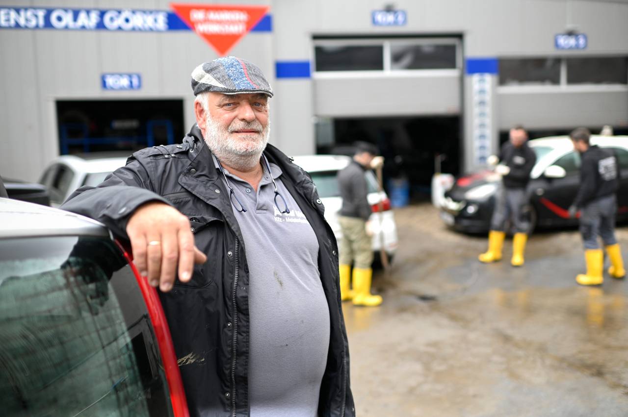 KFZ-Meister Olaf Görke aus Kupferdreh kann wieder an Autos schrauben und Geld verdienen. Seine Werkstatt liegt neben der Deilbachbrücke. Sie war komplett abgesoffen. Alles war voller Schlamm. Das Werkzeug war kaputt oder weg gespült worden, Unterlagen nicht mehr brauchbar.