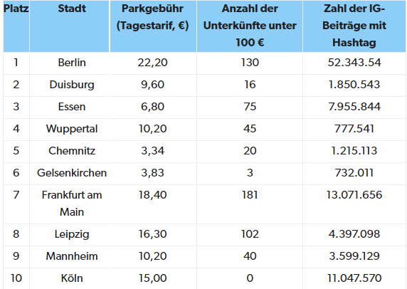 Bei der Studie wurde sogar auch die Anzahl der Hashtags bei Instagram einbezogen. Das soll angeben, wie beliebt der Ort für Fotos ist, heißt es. Für Essen gab es da rund acht Millionen Beiträge. Das ist im Vergleich der besten Städte ein gutes Mittelfeld, aber deutlich weniger als Berlin vorweisen kann, mit über 52 Millionen Beiträge.