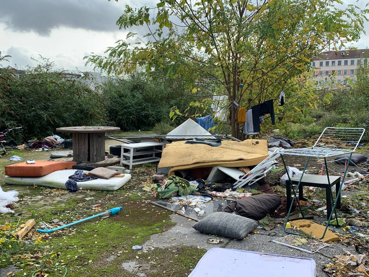 Obdachlose hatten sich zwischen den Bäumen ein Lager aus Gerümpel gebaut. Nur eine Toilette hatten sie nicht. Also gingen sie immer in die Büsche. Überall lagen Matratzen, Bettdecken und Gerümpel herum. An den Bäumen hing sogar noch Wäsche, die irgendwann mal an den Ästen zum Trocknen aufgehängt worden ist.