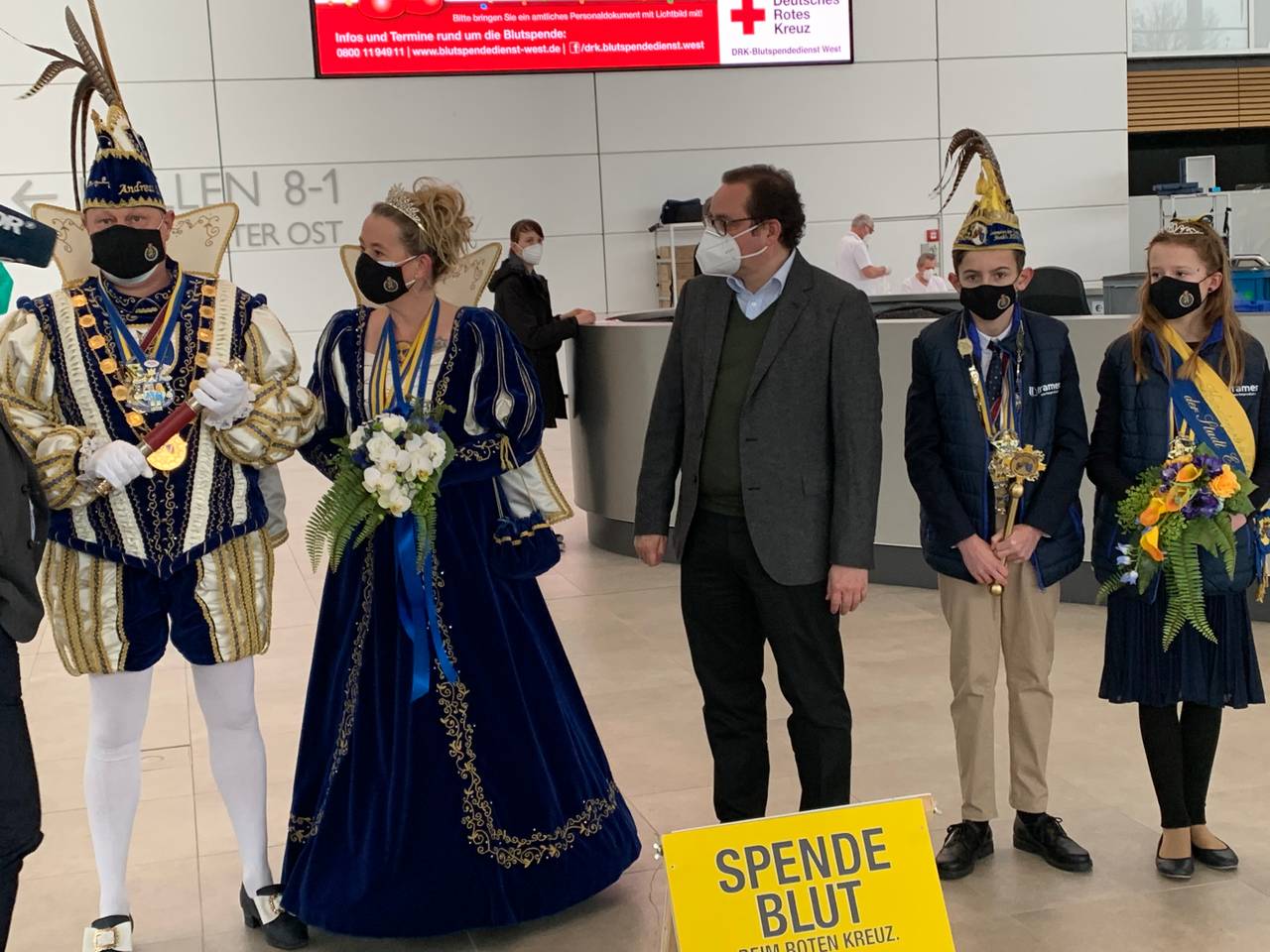 Das Deutsche Rote Kreuz hat am Rosenmontag im Foyer der Messe Essen ein mobiles Blutspendezentrum aufgebaut. Normalerweise startet genau vor der Messe der Rosenmontagszug. Das fiel dieses Jahr Corona zum Opfer. Die Karnevalsvereine haben deshalb zum Blutspenden aufgerufen. Die Essener Karnevalsprinzessin Heike hat zum ersten Mal in ihrem Leben Blut gespendet. Prinz Andreas hat sich aber nicht getraut. Er kann kein Blut sehen und hat Angst vor Spritzen.
