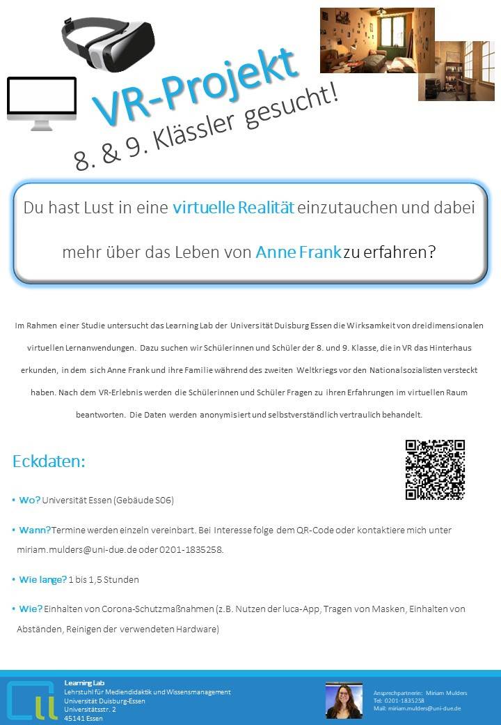 In Essen wird die Vergangenheit in die Zukunft geholt - im Learning Lab der Uni hier in Essen. Da geht es um viele Projekte, wie Bildung vor allem medial verbessert werden kann. Und Miriam Mulders macht dort ein Promotions-Projekt mit VR-Brillen. Dabei sollen Schüler und Schülerinnen in das Versteck von Anne Frank im Zweiten Weltkrieg in Amsterdam eintauchen, hat Miriam Mulders unserer Radio Essen-Moderatorin Larissa Schmitz erzählt. Es werden vor allem Schülerinnen und Schüler der 8. und 9. Klassen gesucht.