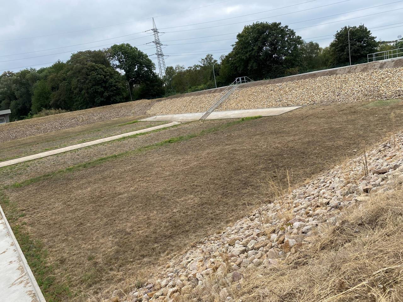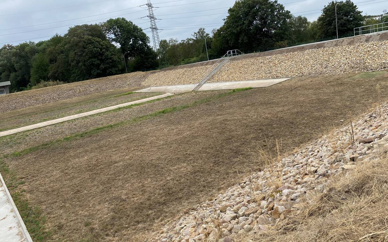 Trimet trennt jetzt das Regenwasser vom Schmutzwasser. Dafür hat das Essener Unternehmen ein doppeltes Rohrsystem und leistungsstarke Pumpen gebaut. Das Schmutzwasser wird unterirdisch ins Klärwerk geleitet, das Regenwasser wird erst gefiltert und dann in die Berne geleitet. Das Flüsschen läuft direkt neben dem Werkszaun der Trimet. Neben der Kantine ist jetzt auch ein neues Regenrückhaltebecken. Bei Starkregen wird das Wasser von den Dächern und den asphaltierten Straßen hier gesammelt und ganz langsam in die Berne geleitet, damit die Nachbarn der Aluhütte nicht überschwemmt werden.