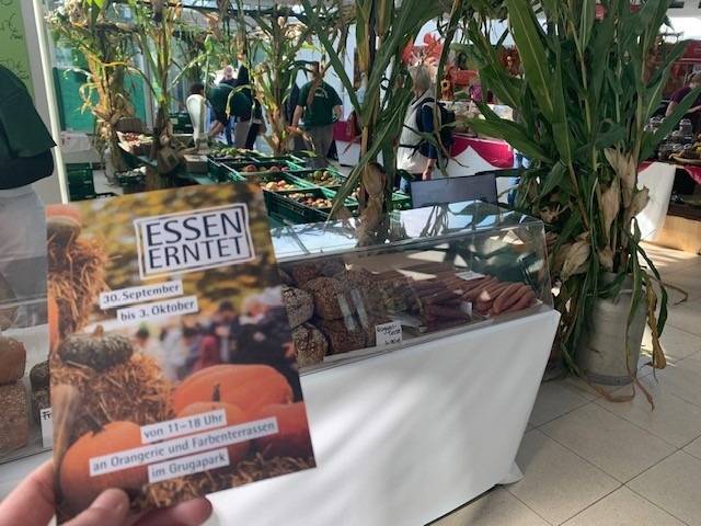 Bei der Ausstellung "Essen erntet" im Grugapark präsentieren Essener Bäcker, Fischer und Floristen ihre Produkte und Projekte zum Thema Naturschutz. Im Vordergrund steht das Erlebnis für die ganze Familie. Vom frischen Kuchen bis zum krossen Spanferkel gibt es dazu viele leckere Sachen zu essen und zu trinken. Der Fischerei-Verein Essen mit Sitz am Baldeneysee berichtet zum Beispiel über Natur und Umweltschutz im und am Wasser, erklärt aber auch vor Ort die richtige Angeltechnik, zum selbst ausprobieren.
