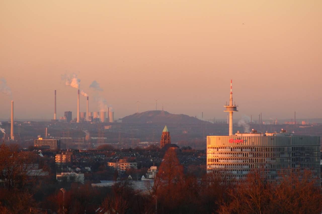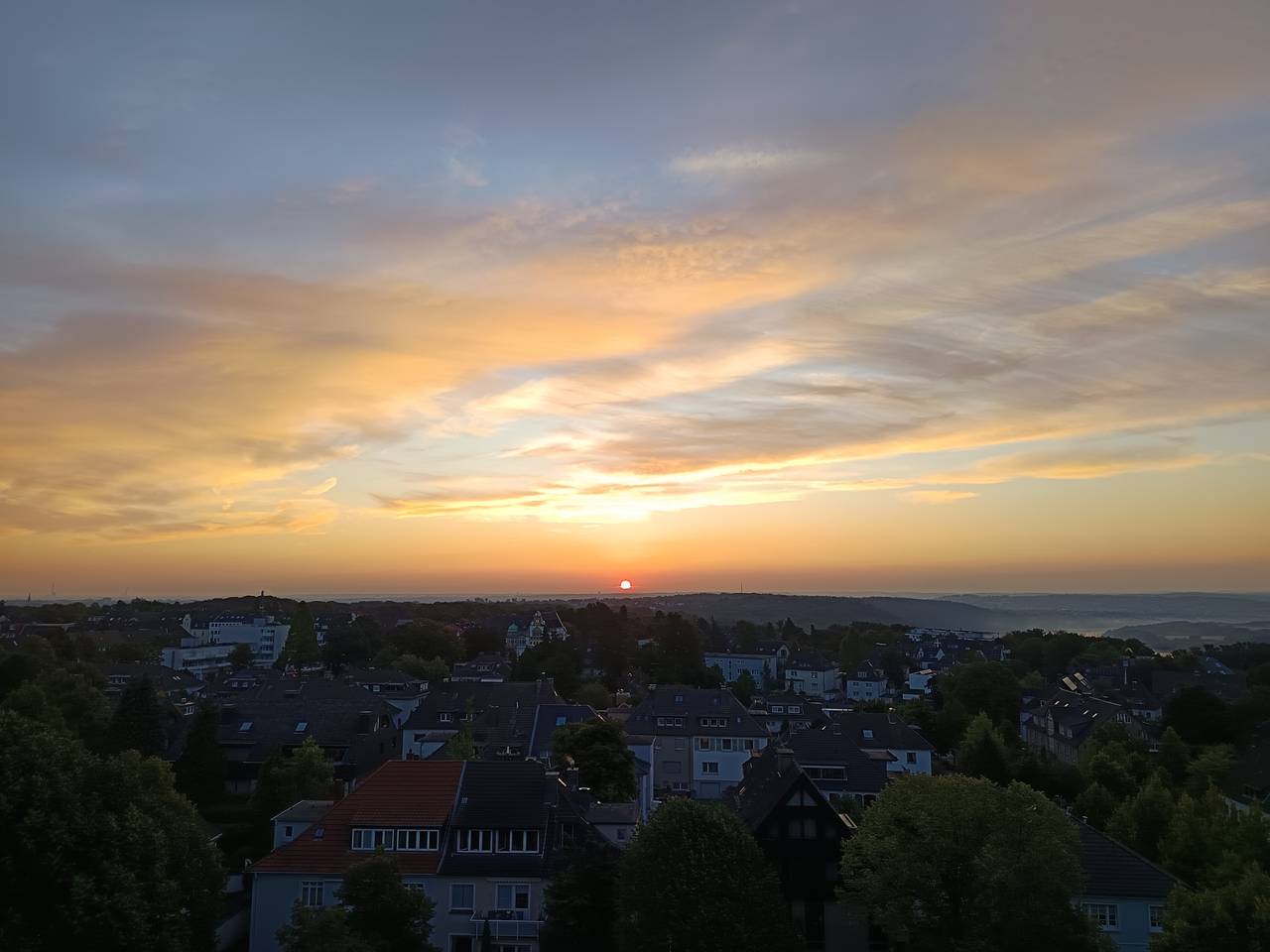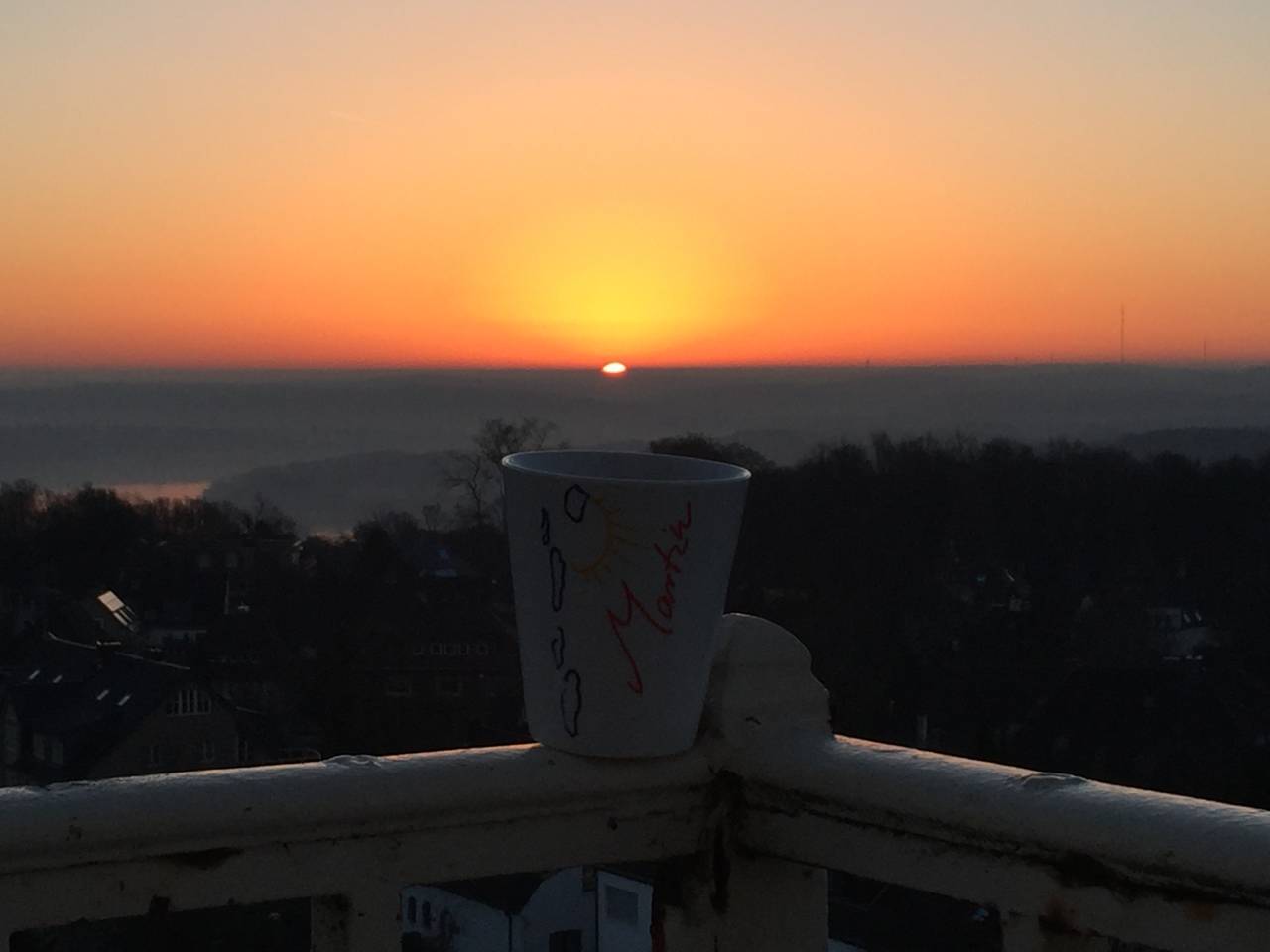 Unser Ziel ist der Goetheturm. Durch eine unscheinbare Tür und einen kleinen Versammlungsraum geht es für Susanne Schnell eine enge Wendeltreppe aus Stein hinauf. Die stellvertretende Schulleiterin steckt hinter den Kunstwerken der letzten Ausstellung an den weißen Wänden des Turms. Nach fast 100 Stufen werden wir mit einem phantastischen Blick über Essen belohnt. Hausmeister Martin Möller ist öfter hier oben und schwärmt von den Sonnenauf- und Untergangsbildern, die er hier schon gemacht hat. Gerne mit Freunden, einer Tasse Kaffee oder einem Gläschen Wein.